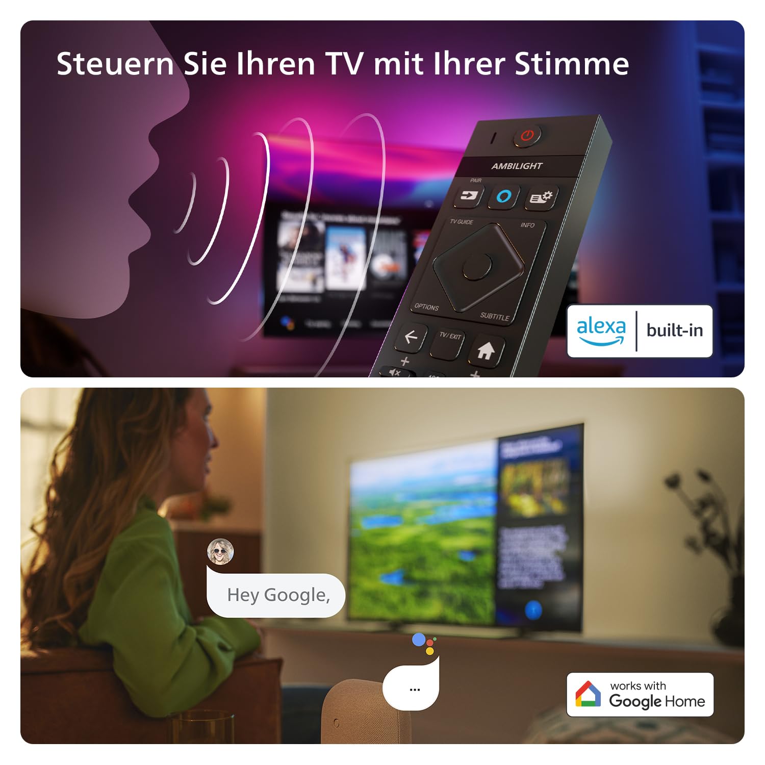 Einzelheiten: 4K Ambilight TV - Sehen Sie nicht nur fern, lassen Sie sich begeistern! Erwarten Sie mehr von Ihrem nächsten Fernseher! Mit diesem 4K UHD Ambilight TV können Sie ultra-scharfe Bilder, hochwertigen Dolby Atmos-Klang und spannendes Ambilight genießen. Gestochen scharfe, satte, immersive Bilder mit Surround-Sound ermöglichen episches Gaming. Filme werden noch größer und Musik von ihrer eigenen Lasershow begleitet! Die Sprachsteuerungsfunktion funktioniert mit Alexa und Google Assistent, und mit HDMI 2.1 können Sie mit rasantem Gameplay und geschmeidigen Grafiken das Beste aus Ihrer Konsole holen.
