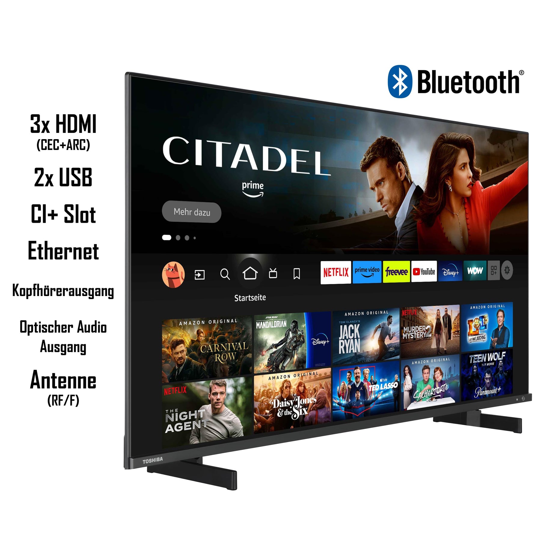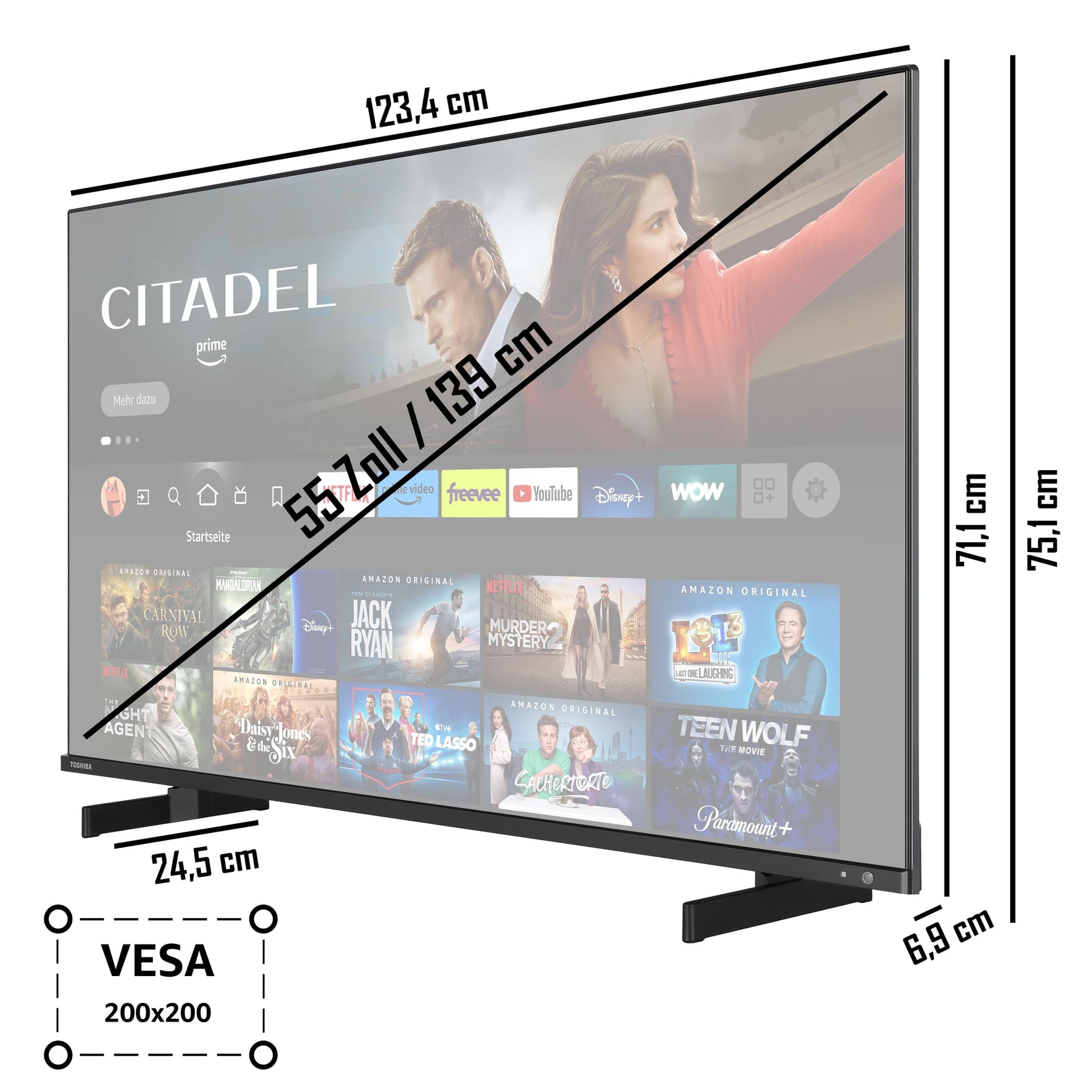 Einzelheiten: Mit seinem eleganten Design bietet der Toshiba 55QF5D63DA QLED Fire TV das volle Entertainment-Programm für die ganze Familie. Das auf eine Bildschirmdiagonale von 139 cm (55 Zoll) dargestellte Bild überzeugt in brillanter 4K UHD Auflösung sowie HDR10 / HLG, TRU Resoultion & Micro Dimming für besonders kontrastreiche Bilder. Dank des integrierten Triple-Tuners DVB-C/-S2/-T2 empfangen Sie TV über Kabel oder Antenne direkt auf Ihrem Gerät, ganz ohne zusätzlichen Receiver. Das Fire OS Betriebssystem hebt das smarte Fernsehzeitalter auf die nächste Stufe. Dank der vielfältigen Möglichkeiten, der einfachen Bedienbarkeit und der individuellen Zusammenstellung Ihrer Lieblingsapps (u.a. Prime Video, Netflix, YouTube, DAZN, Disney+ etc) werden Sie zum Baumeister Ihres ganz persönlichen Smart TVs. Somit können Sie den TV ganz individuell an Ihre Wünsche anpassen. Über das integrierte Alexa Mikrofon können Sie den Smart TV außerdem ganz bequem mit Ihrer Stimme steuern.