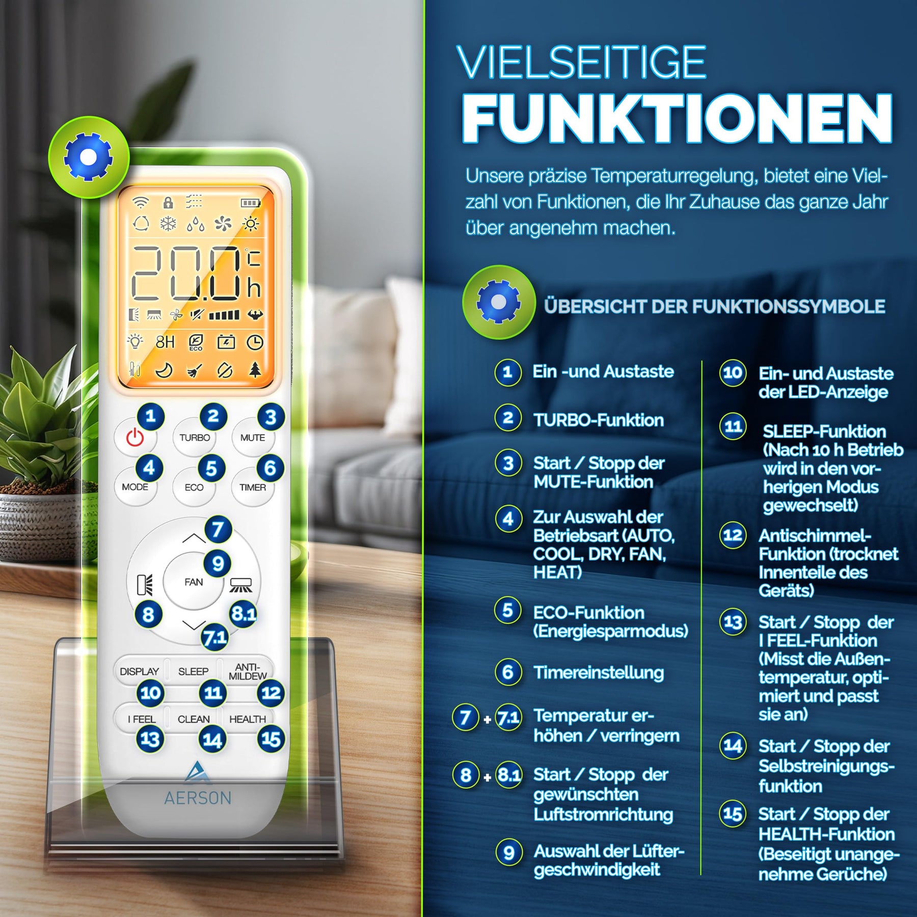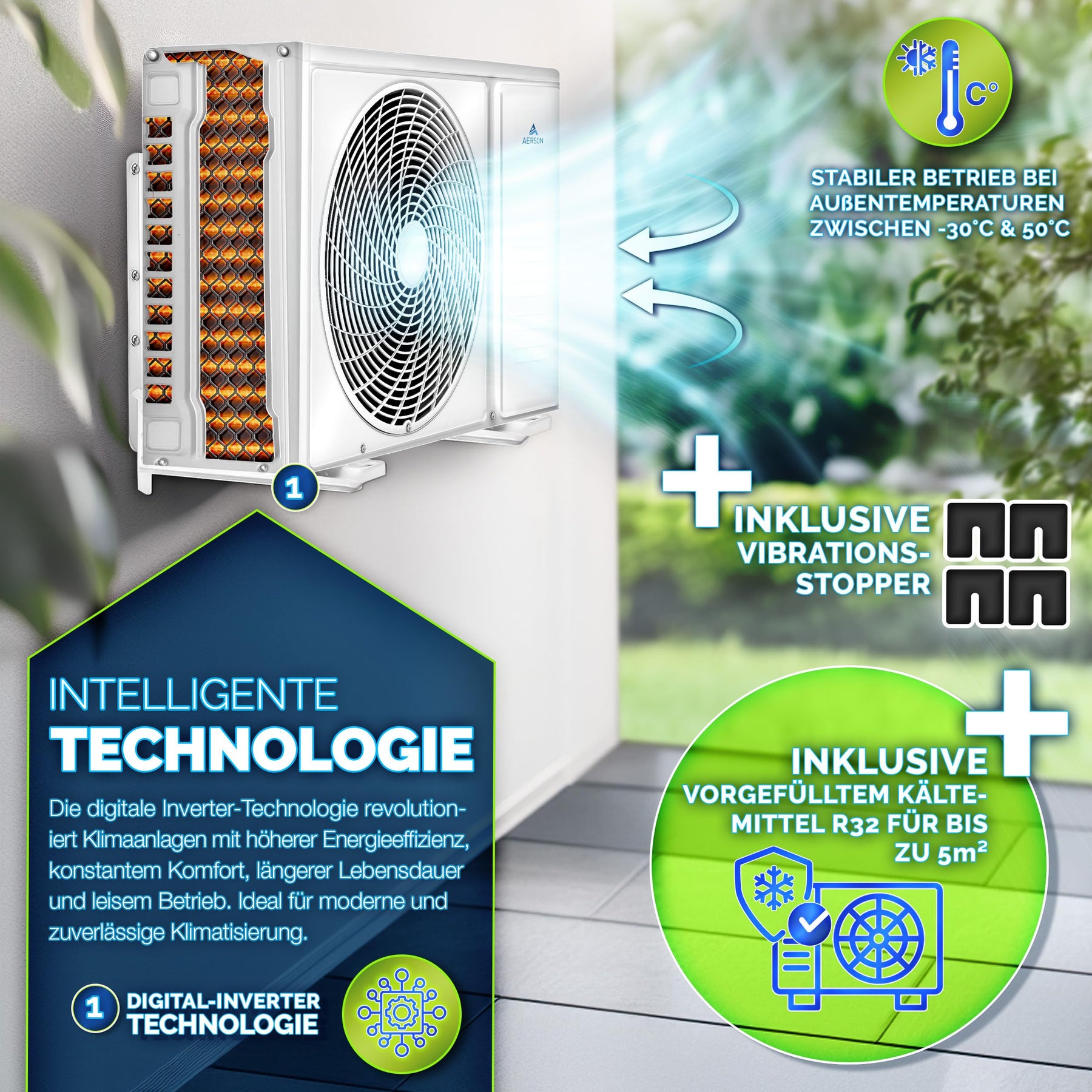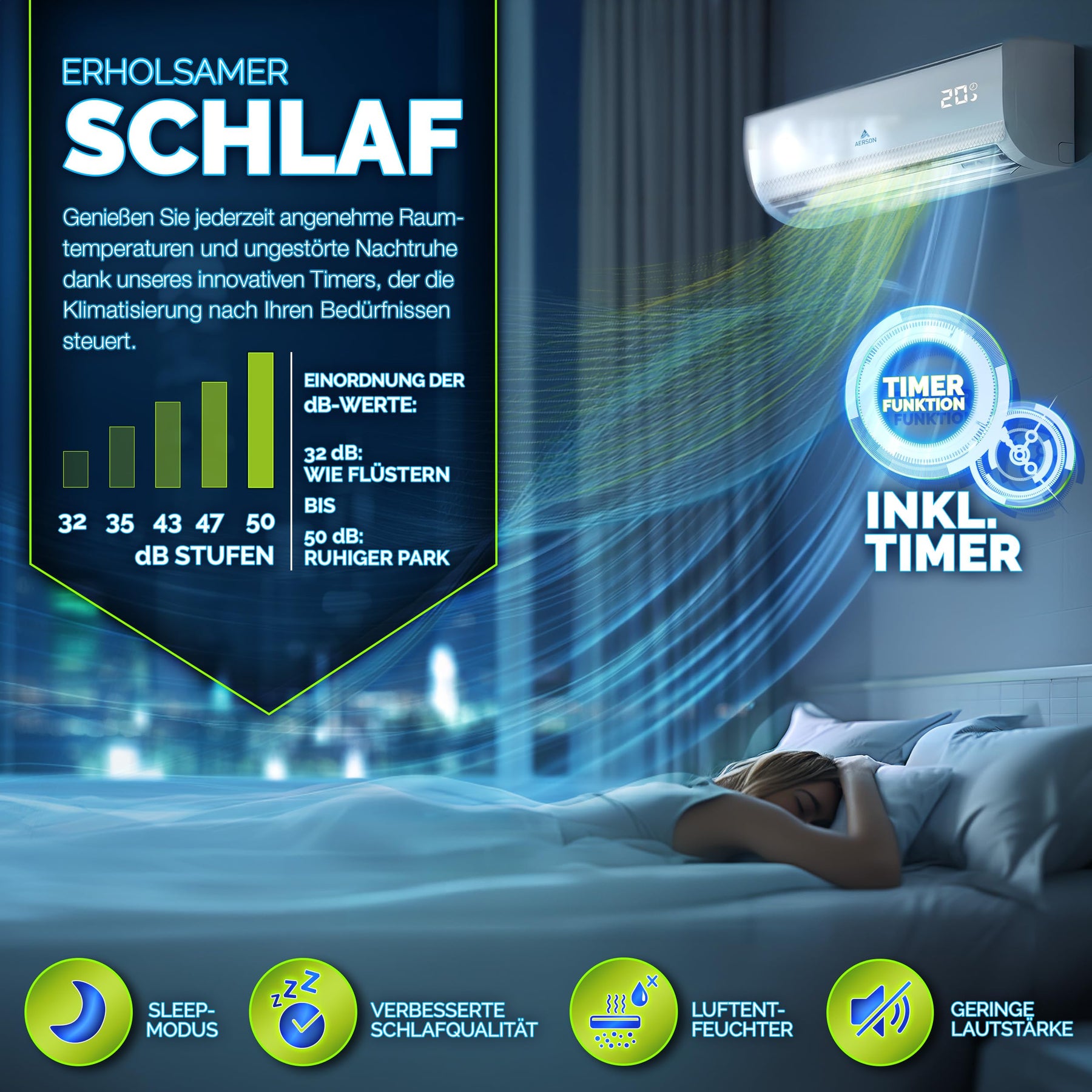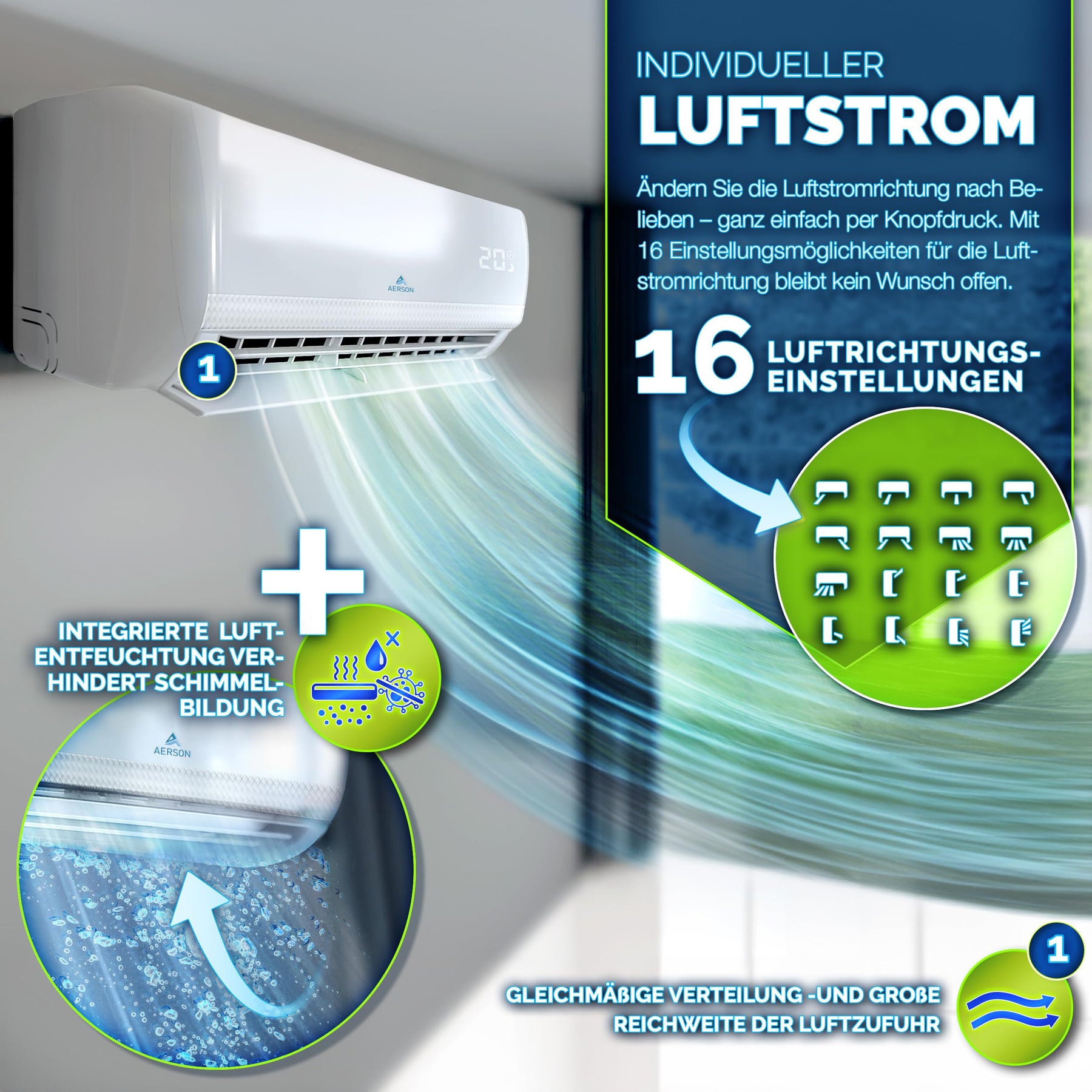 - 𝟓-𝐈𝐍-𝟏 𝐅𝐔𝐍𝐊𝐓𝐈𝐎𝐍: Unser Klimasplit-Gerät erzielt einen SEER-Wert von 6,1. Entscheiden Sie sich für ein energieeffizientes Klimagerät mit einem äußerst schnellen DC Full-Inverter-Kompressormotor. Die AERSON Split Klimaanlage mit WiFi bietet vielseitige Funktionen: Kühlen, Heizen, Entfeuchten, Ventilator und Luftreinigung. Das Klimagerät kühlt blitzschnell auf bis zu 17°C und heizt kraftvoll bis 30°C. Mit ihrem leisen Betrieb und den vier Turbo-Lüfterstufen genießen Sie eine gleichmäßige Luftverteilung. Die 6-Wege-Luftstrom-Technologie und der Schlafmodus (ab 32 dB) sorgen für ruhige Nächte und Energieeinsparung.