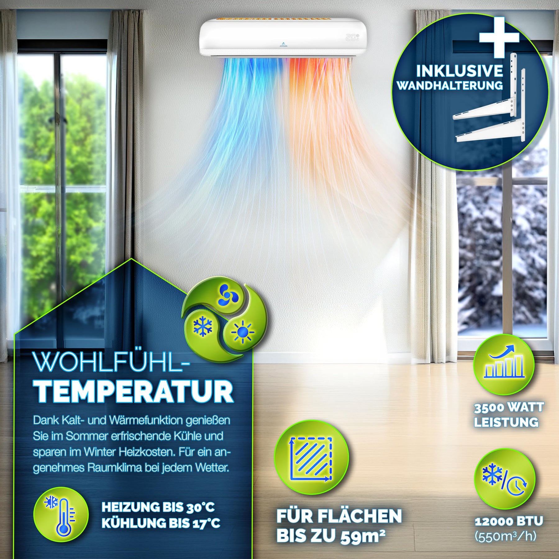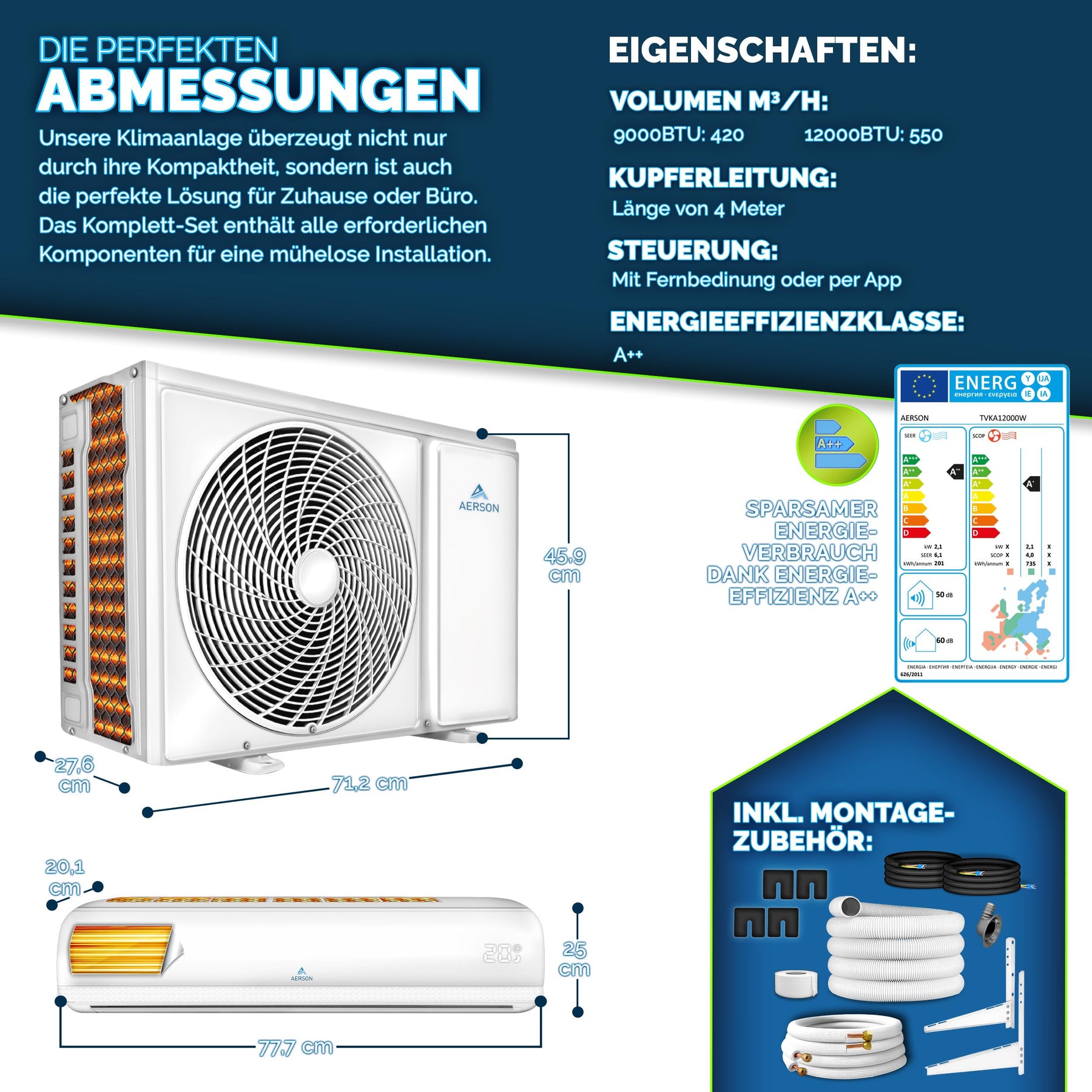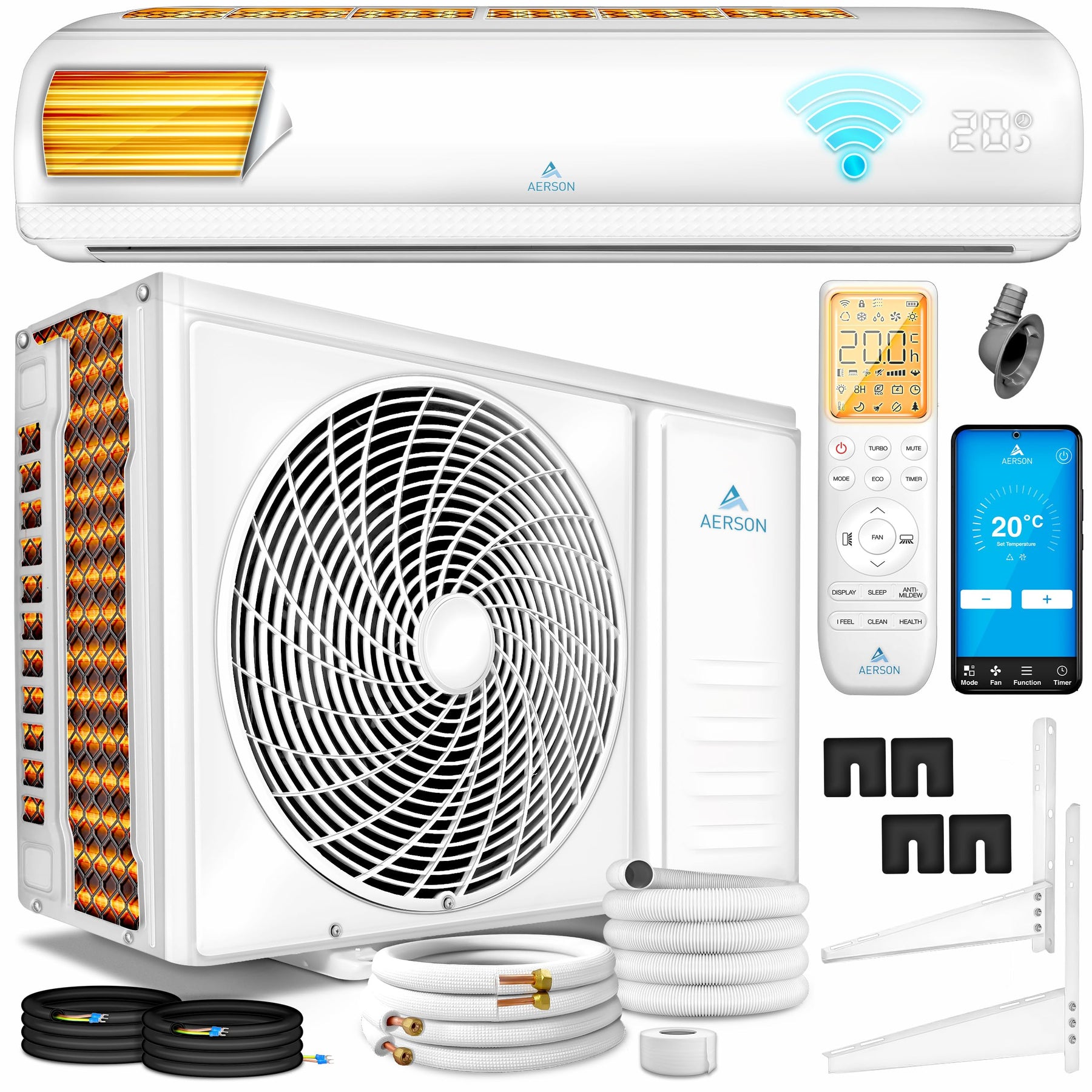 AERSON Klimaanlage Split Set mit WiFi/App Funktion | Klimagerät Kühlen A++ / Heizen A+ Kältemittel R32 | Wandklimagerät Splitgerät inkl. Fernbedienung, Timer, Selbstreinigung & Montagematerial