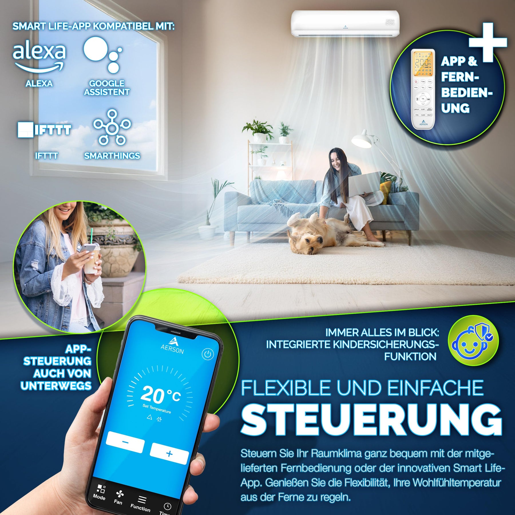 - 𝐕𝐈𝐄𝐋𝐒𝐄𝐈𝐓𝐈𝐆𝐄 𝐒𝐓𝐄𝐔𝐄𝐑𝐔𝐍𝐆: Mit dem Luftkühler behalten Sie stets die Kontrolle, egal wo Sie sind. Nutzen Sie die benutzerfreundliche App, die mit Ihrem Smartphone oder Tablet (iOS oder Android) kompatibel ist, um die Splitanlage von überall zu steuern. Die App ermöglicht die Anpassung der Temperatur, Einstellung des Timers & Änderung der Betriebsart – alles bequem aus der Ferne oder von Zuhause aus. Zusätzlich bietet das Komplett set eine Sprachsteuerung mit Alexa und Google für maximalen Komfort.
