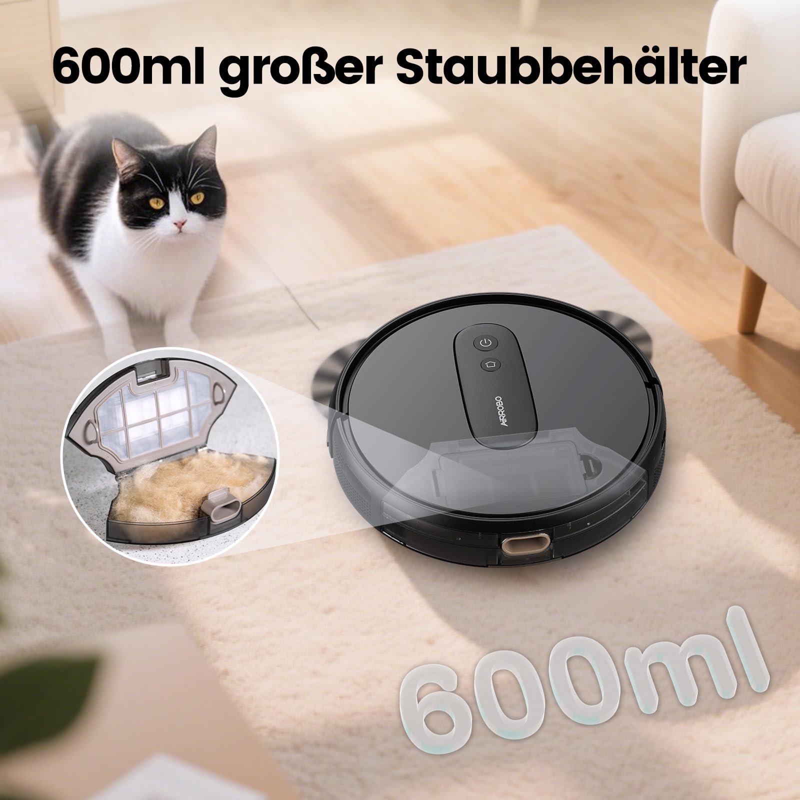 - 【Entwickelt für eine gründliche Reinigung】Der P25 Saugroboter ohne wischfunktion mit 2800 Pa Saugleistung entfernt mühelos Staub, Krümel und Tierhaare aus Teppichtiefen. Der großvolumige 600-ml-Staubbehälter reduziert die Entleerungshäufigkeit. Die schwebende Bürstenkonstruktion ermöglicht eine Tiefenreinigung von Bodenfugen – ideal für unebene Böden.