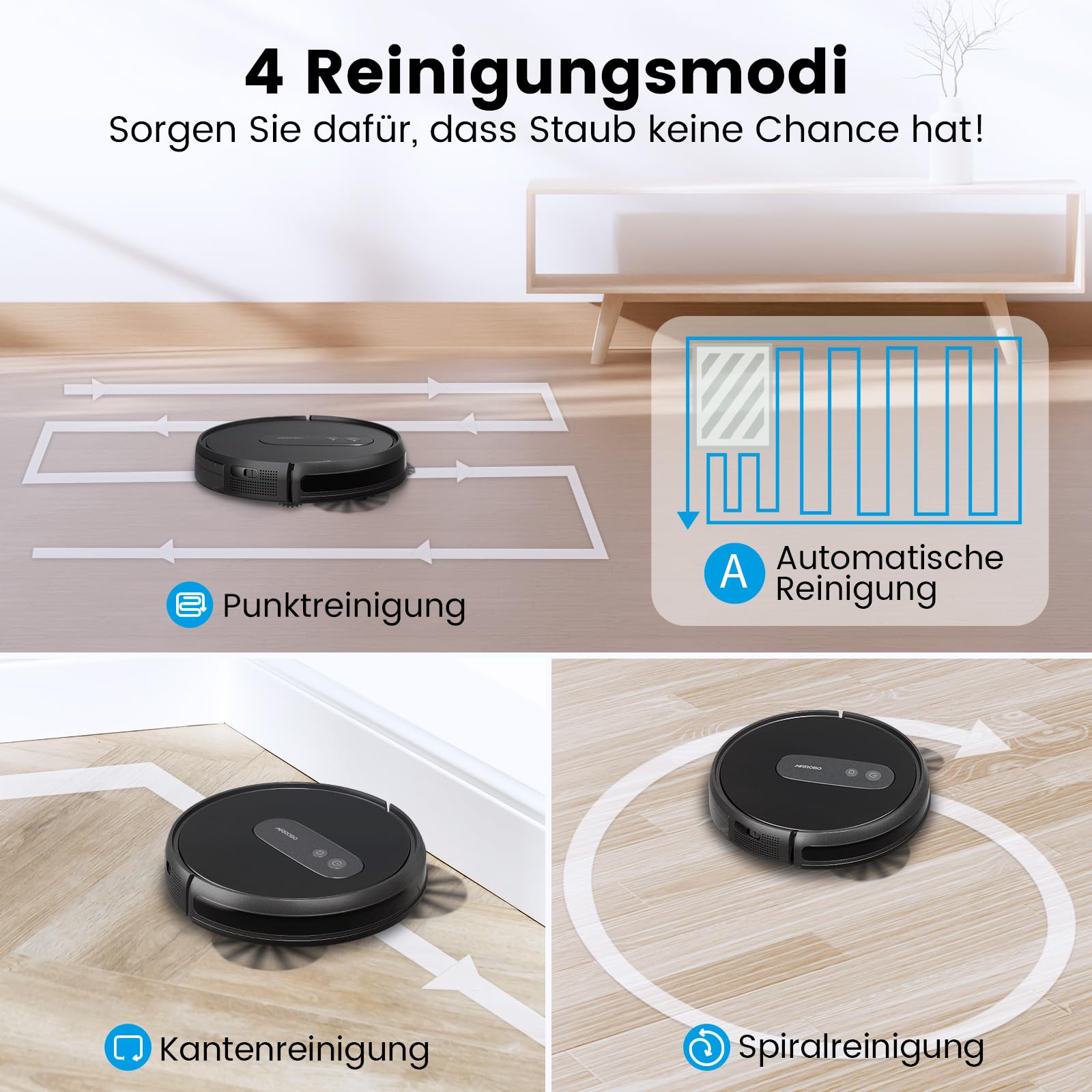 - 【Mehrere Reinigungsmodi】Der Staubsauger roboter bietet mehrere Reinigungsmodi zur Auswahl: Automatische Reinigung, Punktuelle Reinigung, Spiralförmige Reinigung, Kantenreinigung. Durch flexibles Wechseln der Modi passt er sich jeder Situation an – für eine lückenlose Reinigung.