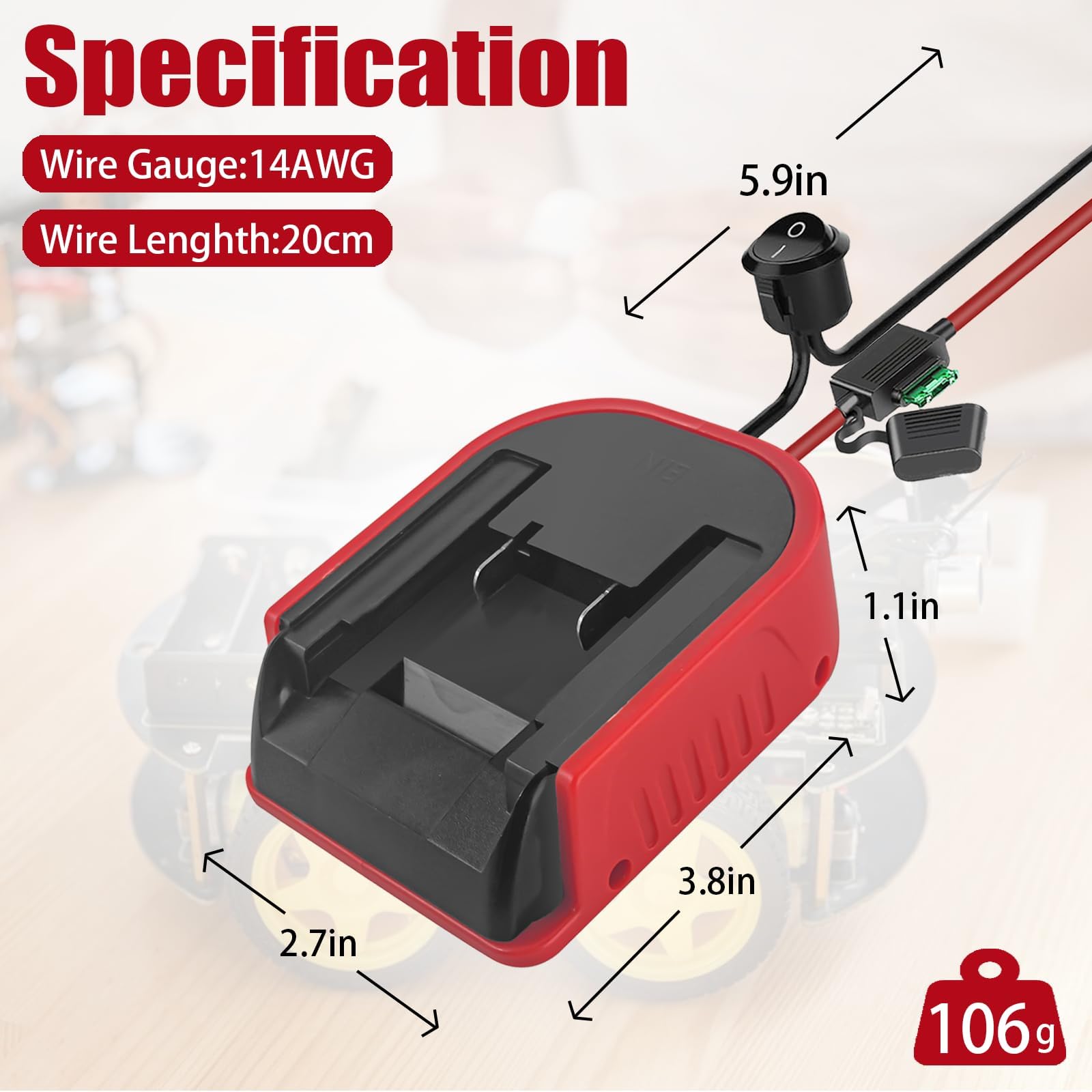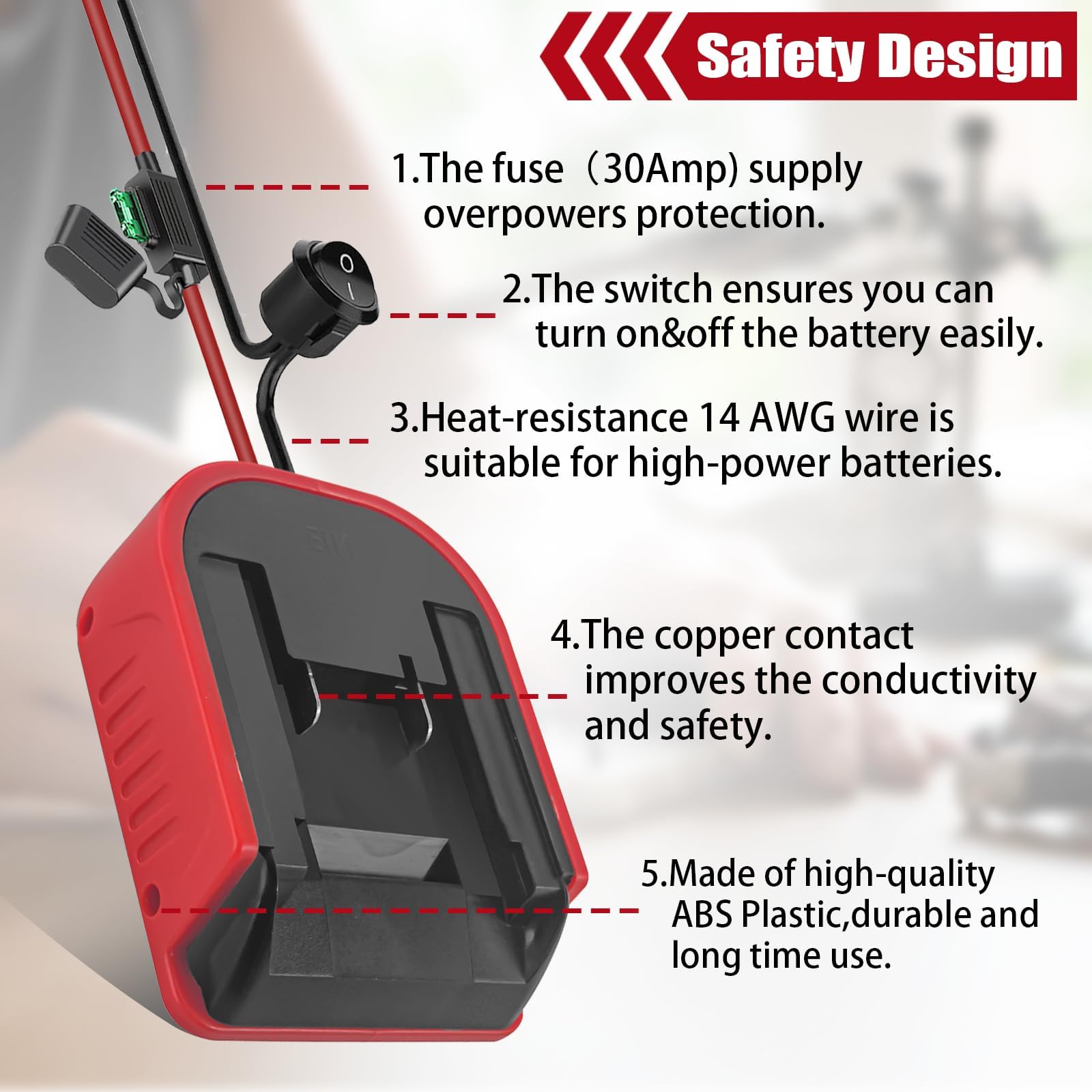 - [Vielseitig einsetzbarer DIY Adapter] Der DIY Adapter zum Umrüsten von Akkus auf Elektrowerkzeuge wird mit zwei hitzebeständigen Kabeln mit 14 Gauge und 30 A Sicherheit geliefert. Damit können Sie selbstgebaute Roboter, Power Wheels, ferngesteuertes Spielzeug, Elektrofahrräder, tragbare Schweißgeräte und andere Werkzeuge aufrüsten. Die Einsatzmöglichkeiten des Adapters sind vielfältig und erfüllen Ihre vielfältigen Heimwerkerbedürfnisse