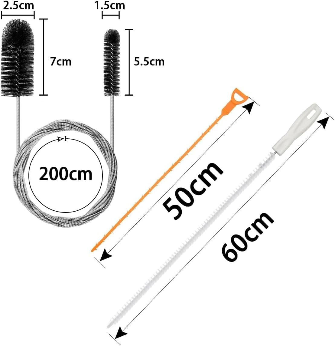 - Doppelseitige Bürste: Unsere schlauchbürste hat ein doppelseitiges Borstendesign. Ein Ende ist mit einer Rohrbürste mit 2,5 cm Durchmesser ausgestattet und das andere Ende mit einer Rohrbürste mit 1,5 cm Durchmesser. Die verschiedenen Größen ermöglichen Ihnen die effektive Reinigung von Rohren mit unterschiedlichen Durchmessern. Die Gesamtlänge beträgt 200 cm (80 Zoll), was perfekt für die Reinigung schwer erreichbarer und enger Stellen ist.