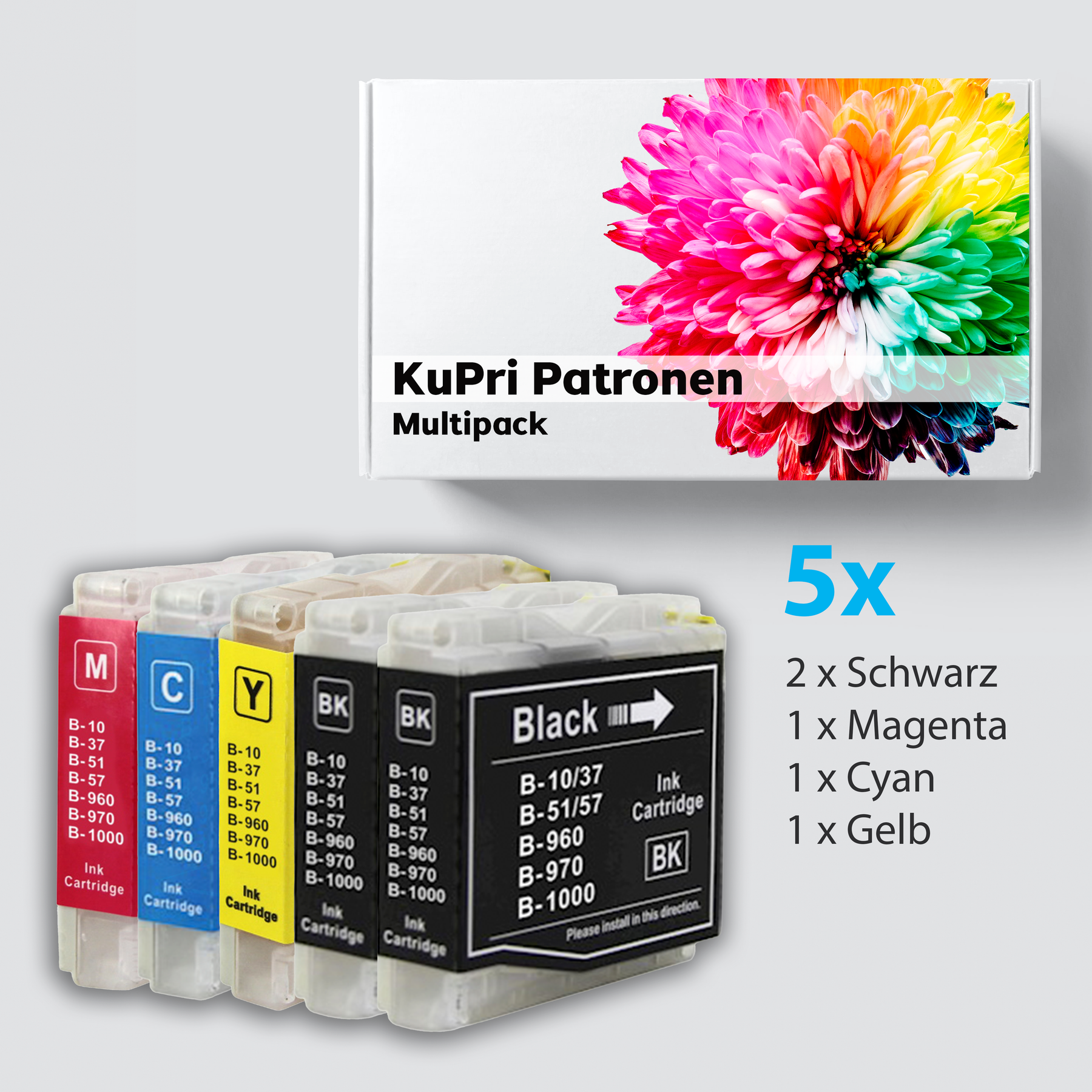 Sie sind auf der Suche nach einer günstigen Alternativen zu Originaldruckerpatronen für Ihren Brother DCP-520 Serie? Dann sind Sie bei uns genau richtig. Mit unserer Eigenmarke KuPri, bieten wir Ihnen preiswerte Druckerpatronen für den Brother DCP-520 Serie an. In diesem Angebot bekommen Sie 5 Patronen, welche in dem Drucker Brother DCP-520 Serie die Originalpatronen LC-1000BK, LC-1000C, LC-1000M und LC-1000Y ersetzen. Unsere Druckeraptronen für den Brother DCP-520 Serie bieten eine gute und günstige Alternative bei nur minimalem Qualitätsverlust. Der Druck entspricht nahezu dem der Original Tintenpatronen. Der Vorteil bei unserer KuPri Druckerpatronen für den Brother DCP-520 Serie ist nicht nur der günstige Preis, sondern auch die höhere Füllmenge gegenüber dem Original. Unsere Druckerpatrone hat eine Füllmenge Black ca: 20 ml C,M,Y ca: 15ml. Dies ist im Vergleich zur normalen Originalvariante einiges mehr an Inhalt. Das Bild der Druckerpatrone für den Brother DCP-520 Serie ist ein Beispiel. Die gelieferte Patrone kann eine leicht andere Optik haben. Wir senden Ihnen unsere Druckerpatronen schnell und vor allem Versandkostenfrei innerhalb Deutschlands mit der Deutschen Post zu. Mit uns drucken Sie ab sofort zu einem Bruchtteil der Originaltintenkosten. Selbstverständlich besitzen die Patronen für den Brother DCP-520 Serie einen funktionstüchtigen Chip.