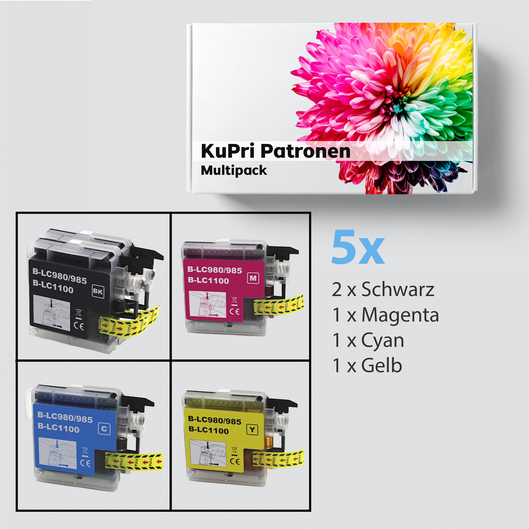 Sie sind auf der Suche nach einer günstigen Alternativen zu Originaldruckerpatronen für Ihren Brother MFC-490CN? Dann sind Sie bei uns genau richtig. Mit unserer Eigenmarke KuPri, bieten wir Ihnen preiswerte Druckerpatronen für den Brother MFC-490CN an. In diesem Angebot bekommen Sie 5 Patronen, welche in dem Drucker Brother MFC-490CN die Originalpatronen LC-1100BK, LC-1100C, LC-1100M und LC-1100Y ersetzen. Unsere Druckeraptronen für den Brother MFC-490CN bieten eine gute und günstige Alternative bei nur minimalem Qualitätsverlust. Der Druck entspricht nahezu dem der Original Tintenpatronen. Der Vorteil bei unserer KuPri Druckerpatronen für den Brother MFC-490CN ist nicht nur der günstige Preis, sondern auch die höhere Füllmenge gegenüber dem Original. Unsere Druckerpatrone hat eine Füllmenge Black ca: 28 ml C,M,Y ca: 19ml. Dies ist im Vergleich zur normalen Originalvariante einiges mehr an Inhalt. Das Bild der Druckerpatrone für den Brother MFC-490CN ist ein Beispiel. Die gelieferte Patrone kann eine leicht andere Optik haben. Wir senden Ihnen unsere Druckerpatronen schnell und vor allem Versandkostenfrei innerhalb Deutschlands mit der Deutschen Post zu. Mit uns drucken Sie ab sofort zu einem Bruchtteil der Originaltintenkosten. Selbstverständlich besitzen die Patronen für den Brother MFC-490CN einen funktionstüchtigen Chip.