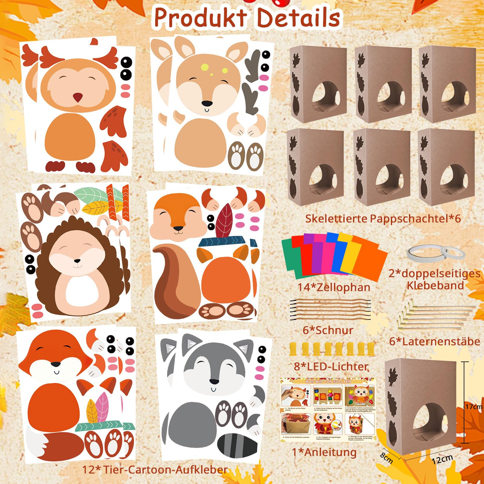 - 【6 Stück Tieren Laterne für Tierlaternen】Laternen Bastelset für Kinder mit 6 Tieren Süße motive wie(Fuchs, Eule, Waschbär, Eichhörnchen, Igel, Elch)! Enthält laternenstab, LEDs und DIY-Material – ohne Zusatzkauf sofort, verbreiten direkt eine gemütliche herbststimmung