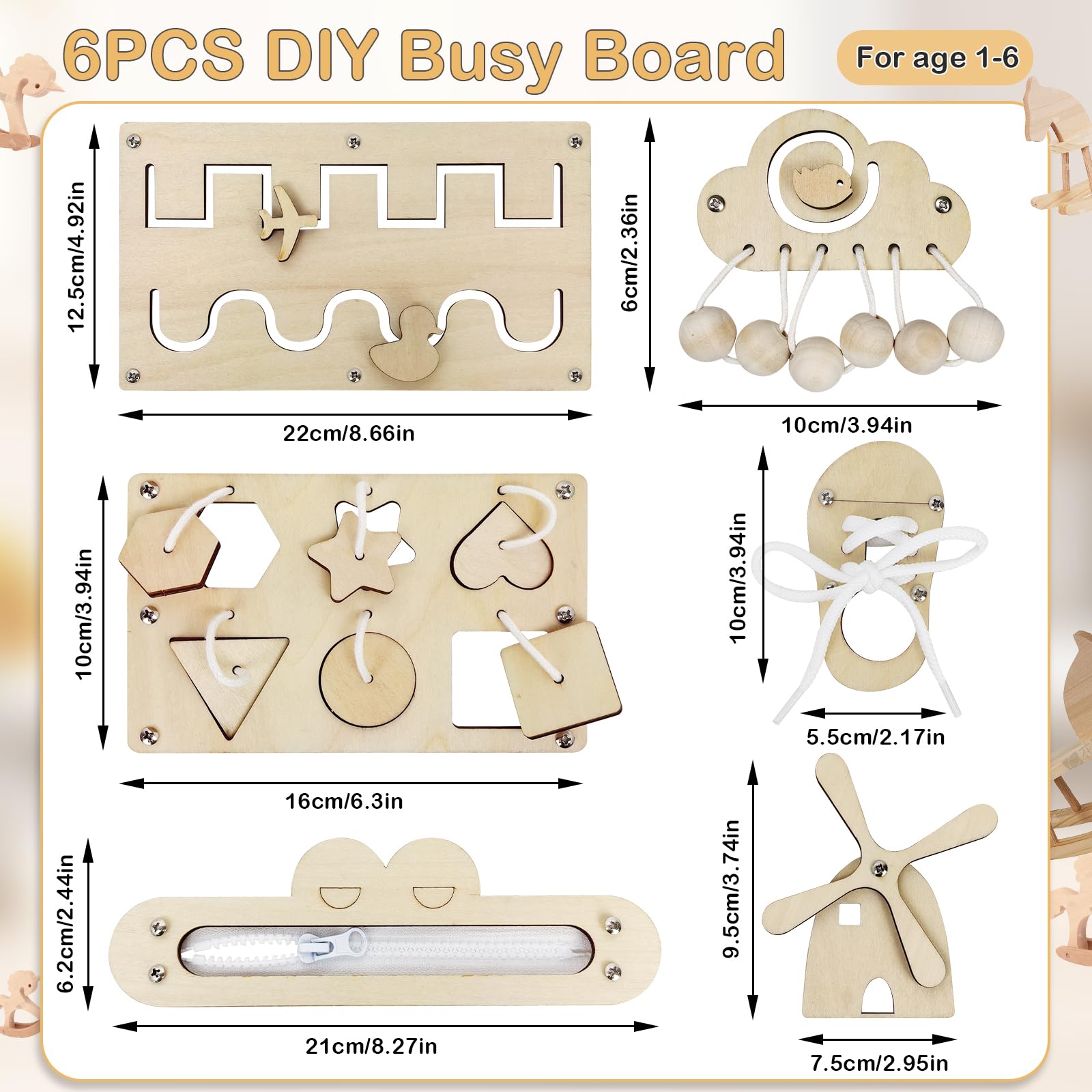 6Stks Hölzernes Busy Board, Aktivitätsbrett, Holzspielzeug Tätigkeitsboard, Kinder Activity Board, DIY Praktische Fähigkeiten Lernspielzeug, Holz Vorschulalter Busy Board Zubehör für 1-6 Jährige