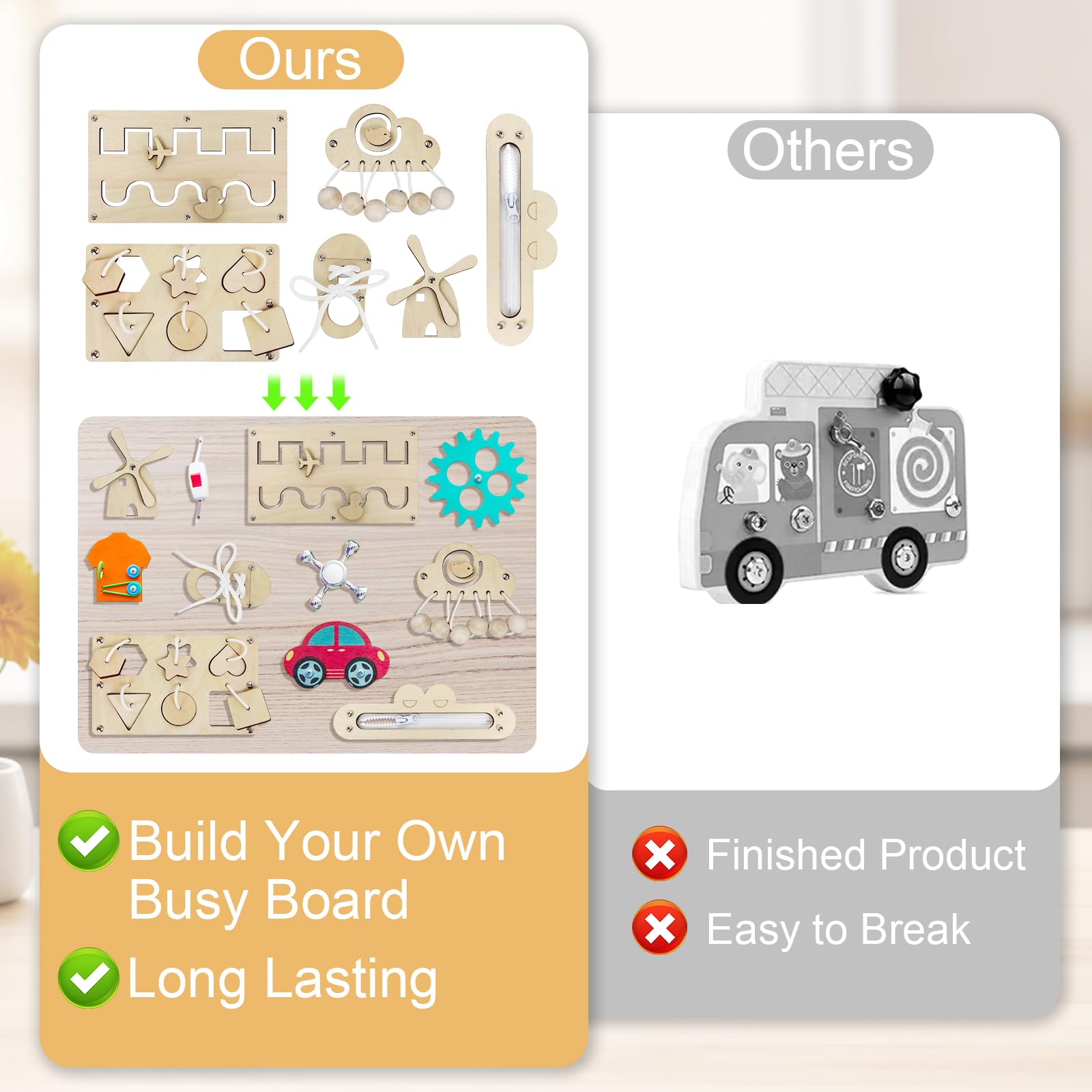 • 【Hochwertiges Holz】Die aus hochwertigem holz gefertigten holzspielzeug tätigkeitsboard sind auf langlebigkeit ausgelegt und legen dabei wert auf sicherheit. Unsere kinder activity board sind mit glatten kanten gestaltet und bieten kindern eine sichere und langlebige option zum erkunden und genießen.
