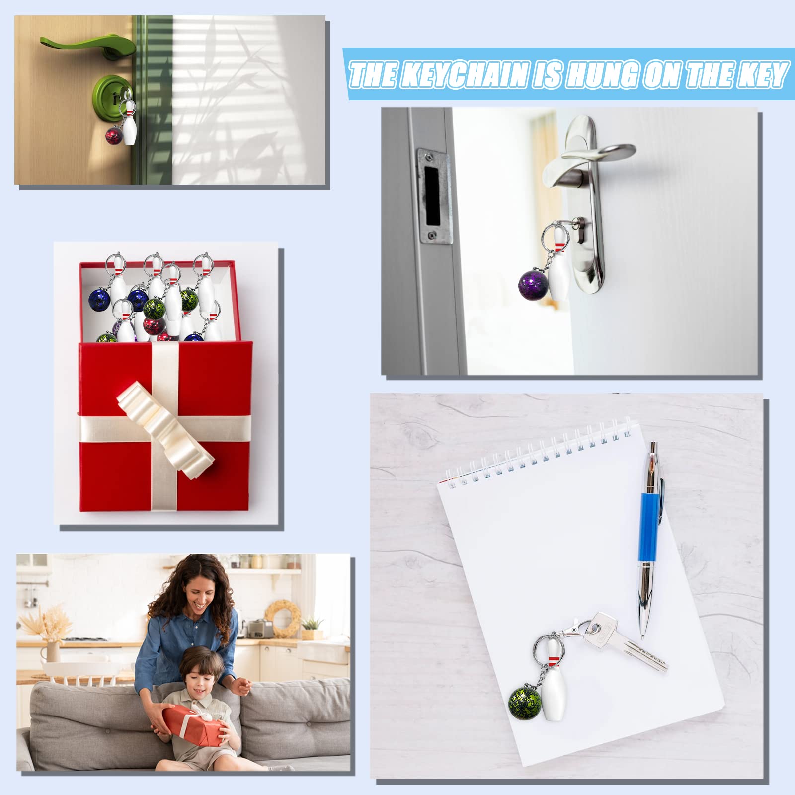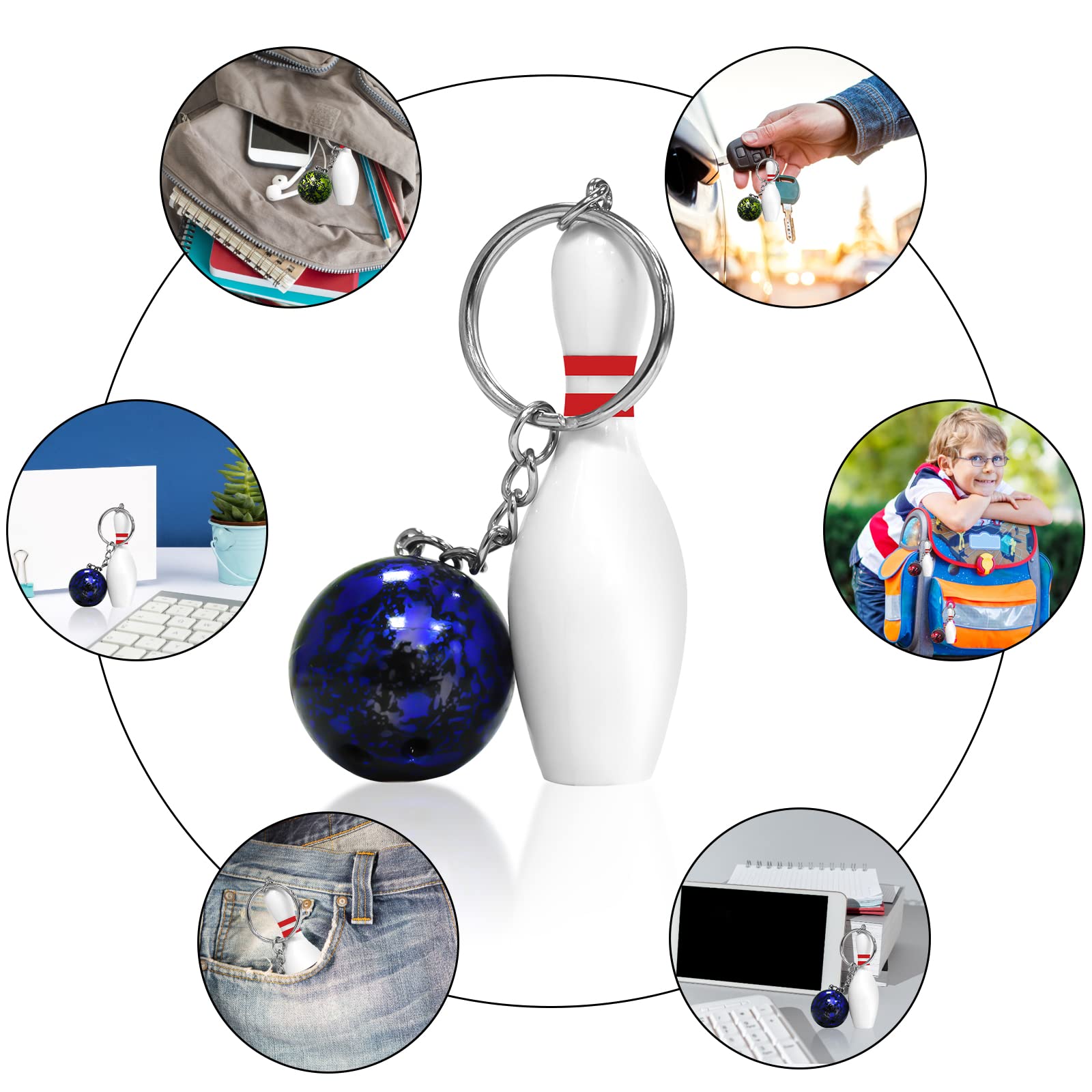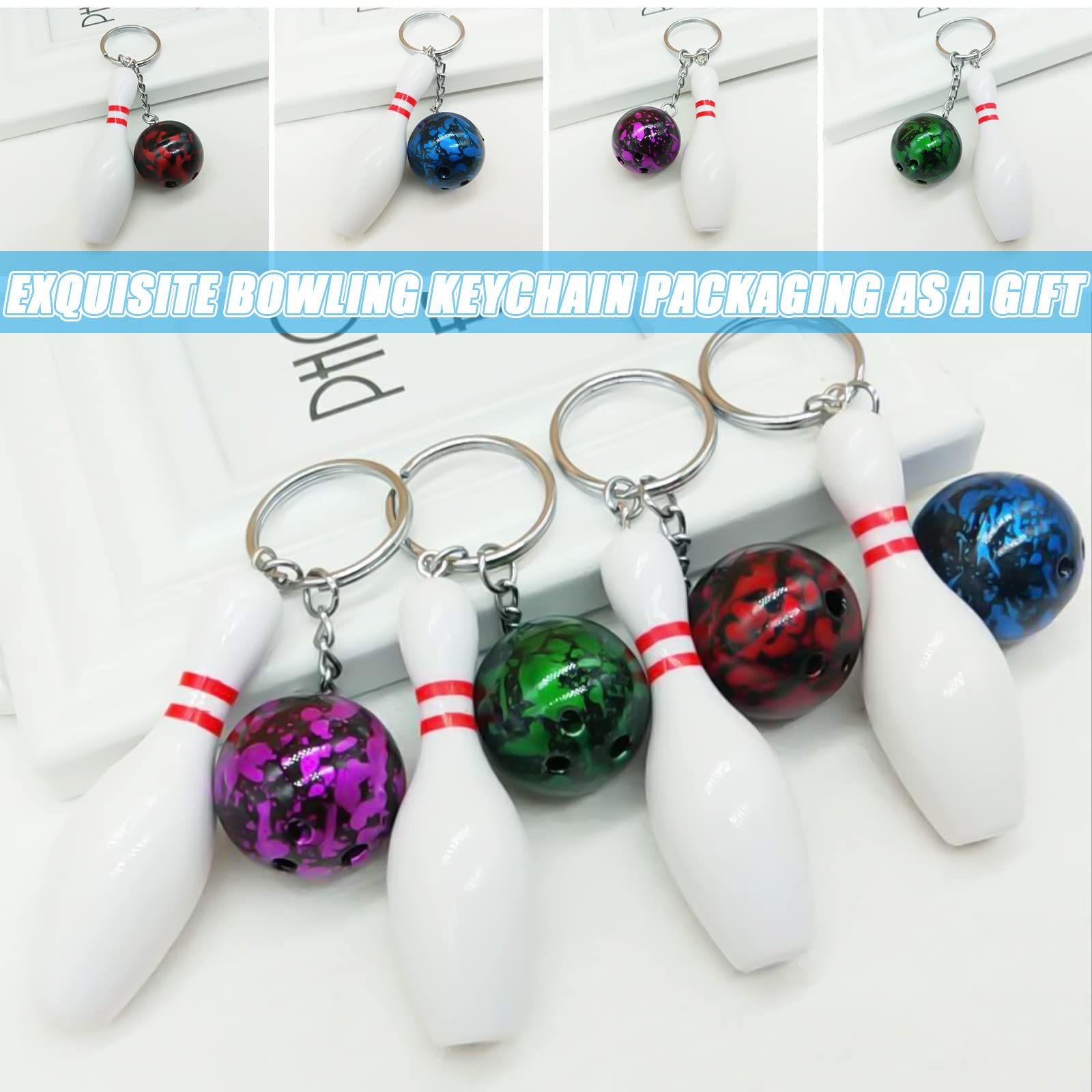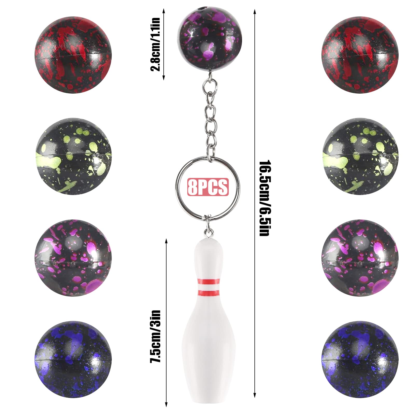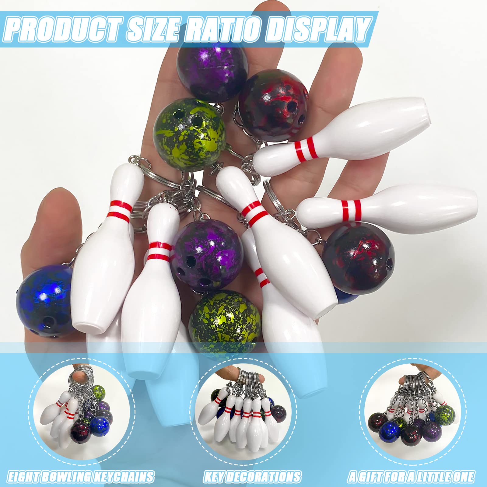 • 【Mini Bowling Schlüsselanhänger】 enthält acht Schlüsselanhänger. Es ist ein idealer dekorativer Anhänger für Handtaschen, Geldbörsen, Schlüssel, Telefone usw. Das einzigartige Aussehen, die exquisite Schönheit und die einzigartige Mode des Schlüsselanhängers ziehen die Aufmerksamkeit der Menschen auf sich.
