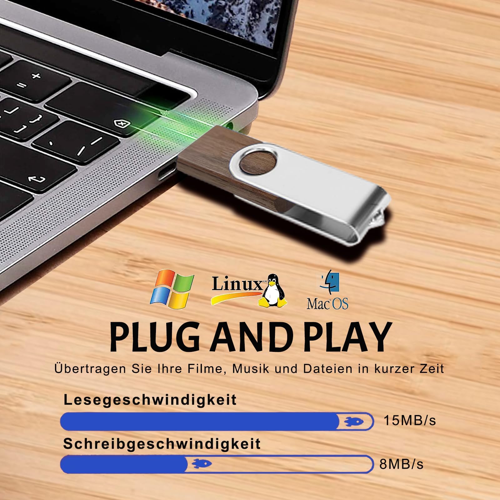 - GROSSARTIGE WERT HOLZ USB STICK 10 Stück: 100% hochwertige USB 2.0-Schnittstelle und original USB A+ Chip. Die Packung mit 10 8GB usb sticks Holz haben eine Lesegeschwindigkeit von bis zu 15 MB/s und eine Schreibgeschwindigkeit von 5-8 MB/s