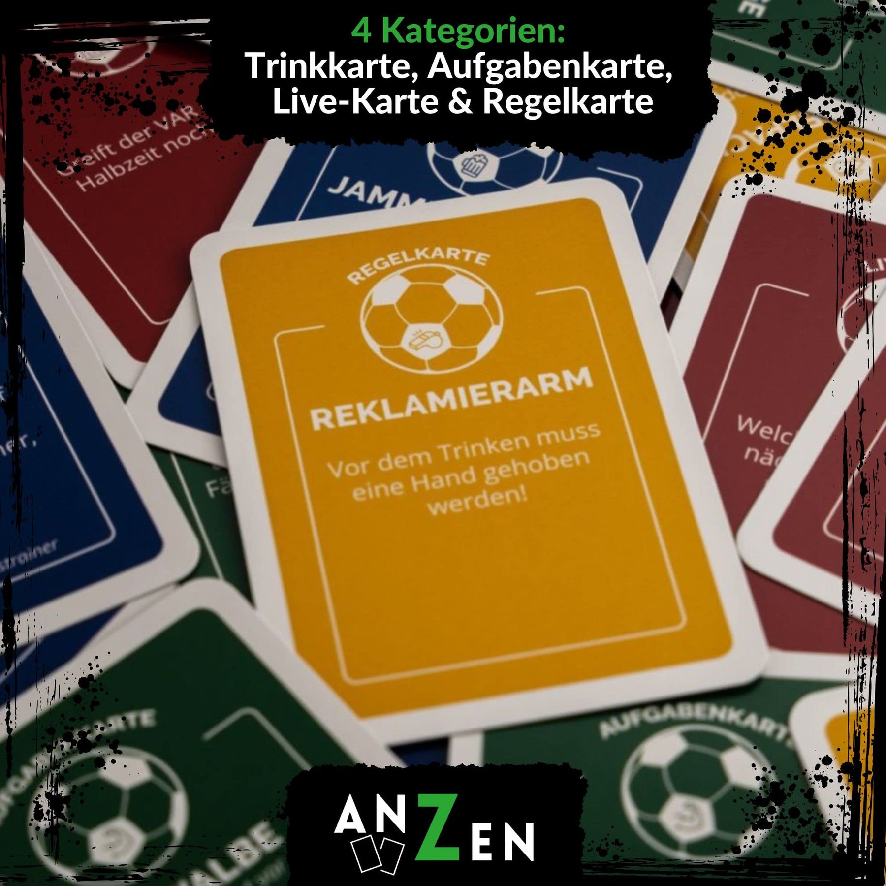 - ⚽ Setzt euch gemeinsam vor den Fernseher und schaut ein Live-Fußball-Spiel im TV. Abwechselnd wird der Reihe nach eine Karte gezogen. Es gibt 4 Kategorien: Trinkkarte, Aufgabenkarte, Regelkarte und Live Karte.