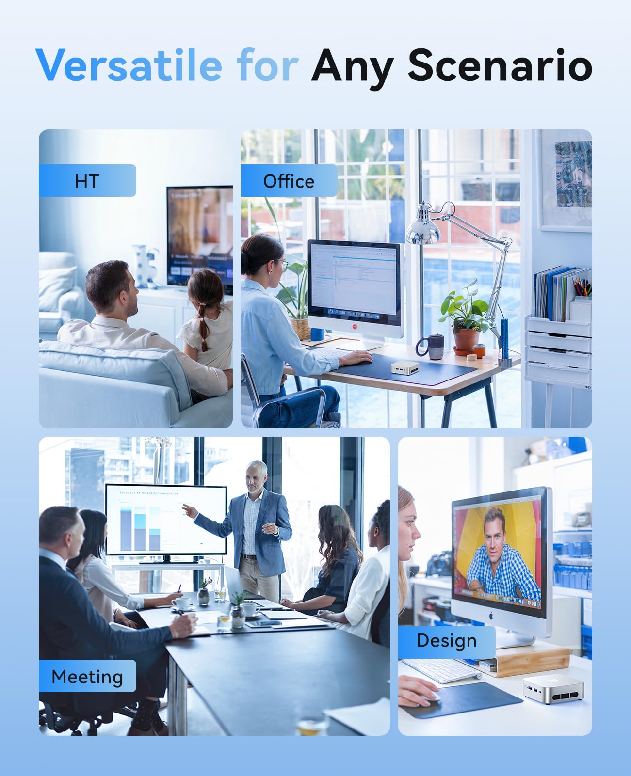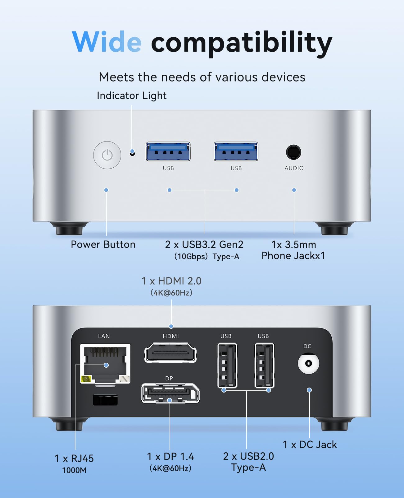 - 🔹[W11 Pro System & vielseitige Konnektivität] - Der Office Mini PC wird mit dem Win11 Pro System vorinstalliert, das intelligent, sicher und effizient ist. Er bietet mehrere Schnittstellen: 10M/100M/1000M RJ45 Gigabit Ethernet Port *1, USB3.2 Typ-A Port *2, USB2.0 Typ-A Port *2, HDMI 2.0 *1, DP 1.4 *1, DC IN ×1, 3,5 mm Audioanschluss *1. Diese vielseitigen Anschlüsse bieten große Flexibilität für Ihre Geräte.