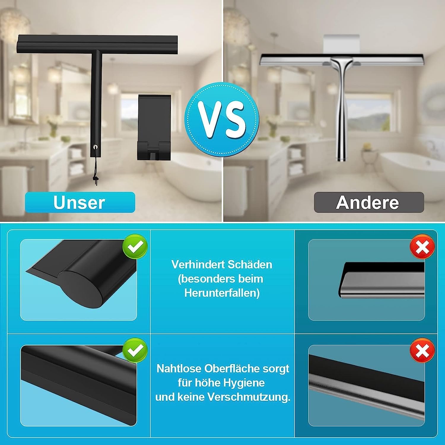 - Hohe Qualität Duschabzieher Silikon: Unser Fensterabzieher ist aus hochwertigem, flexiblem Silikonmaterial hergestellt. 𝘽𝙞𝙩𝙩𝙚 𝙗𝙚𝙖𝙘𝙝𝙩𝙚𝙣 𝙎𝙞𝙚: 𝙒𝙚𝙣𝙣 𝙙𝙞𝙚 𝙊𝙗𝙚𝙧𝙛𝙡𝙖̈𝙘𝙝𝙚 𝙬𝙖̈𝙝𝙧𝙚𝙣𝙙 𝙙𝙚𝙨 𝙂𝙚𝙗𝙧𝙖𝙪𝙘𝙝𝙨 𝙯𝙪 𝙩𝙧𝙤𝙘𝙠𝙚𝙣 𝙬𝙞𝙧𝙙, 𝙠𝙖𝙣𝙣 𝙚𝙞𝙣 𝙡𝙚𝙞𝙘𝙝𝙩𝙚𝙨, 𝙖𝙗𝙚𝙧 𝙫𝙤̈𝙡𝙡𝙞𝙜 𝙝𝙖𝙧𝙢𝙡𝙤𝙨𝙚𝙨 "𝙯𝙞𝙧𝙥𝙚𝙣𝙙𝙚𝙨" 𝙂𝙚𝙧𝙖̈𝙪𝙨𝙘𝙝 𝙖𝙪𝙛𝙩𝙧𝙚𝙩𝙚𝙣. Dieses Geräusch signalisiert, dass die Oberfläche vollständig trocken ist