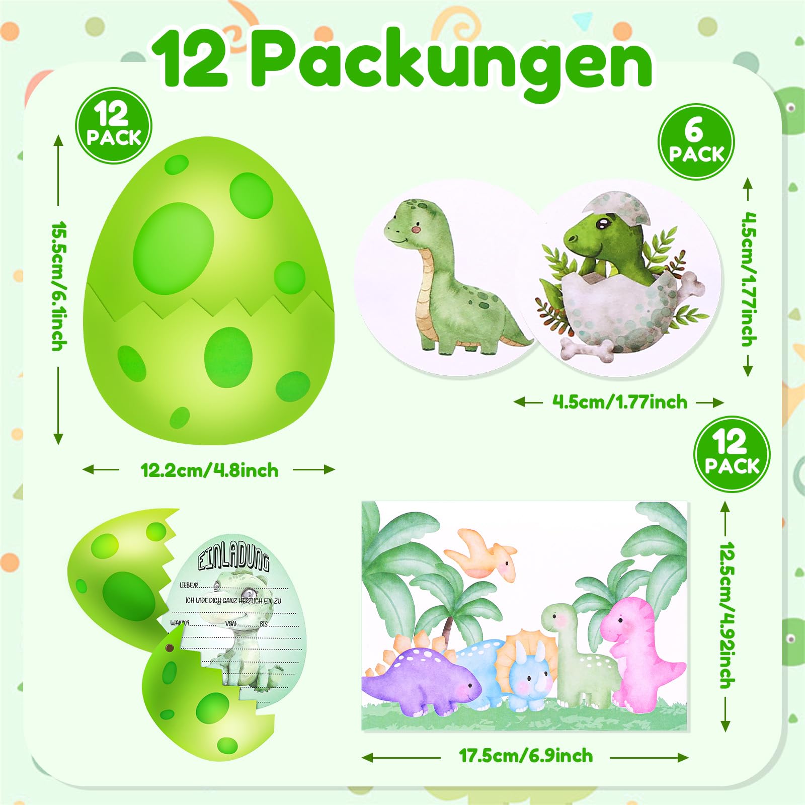 Einzelheiten: Planen Sie einen Dinosaurier-thematischen Kindergeburtstag? Unsere Einladungskarten Geburtstag sind perfekt für Junge und Mädchen! Jedes Set enthält 12 Deutsche Einladungskarten mit 12 Umschlägen – ideal für eine komplette Gästeliste.