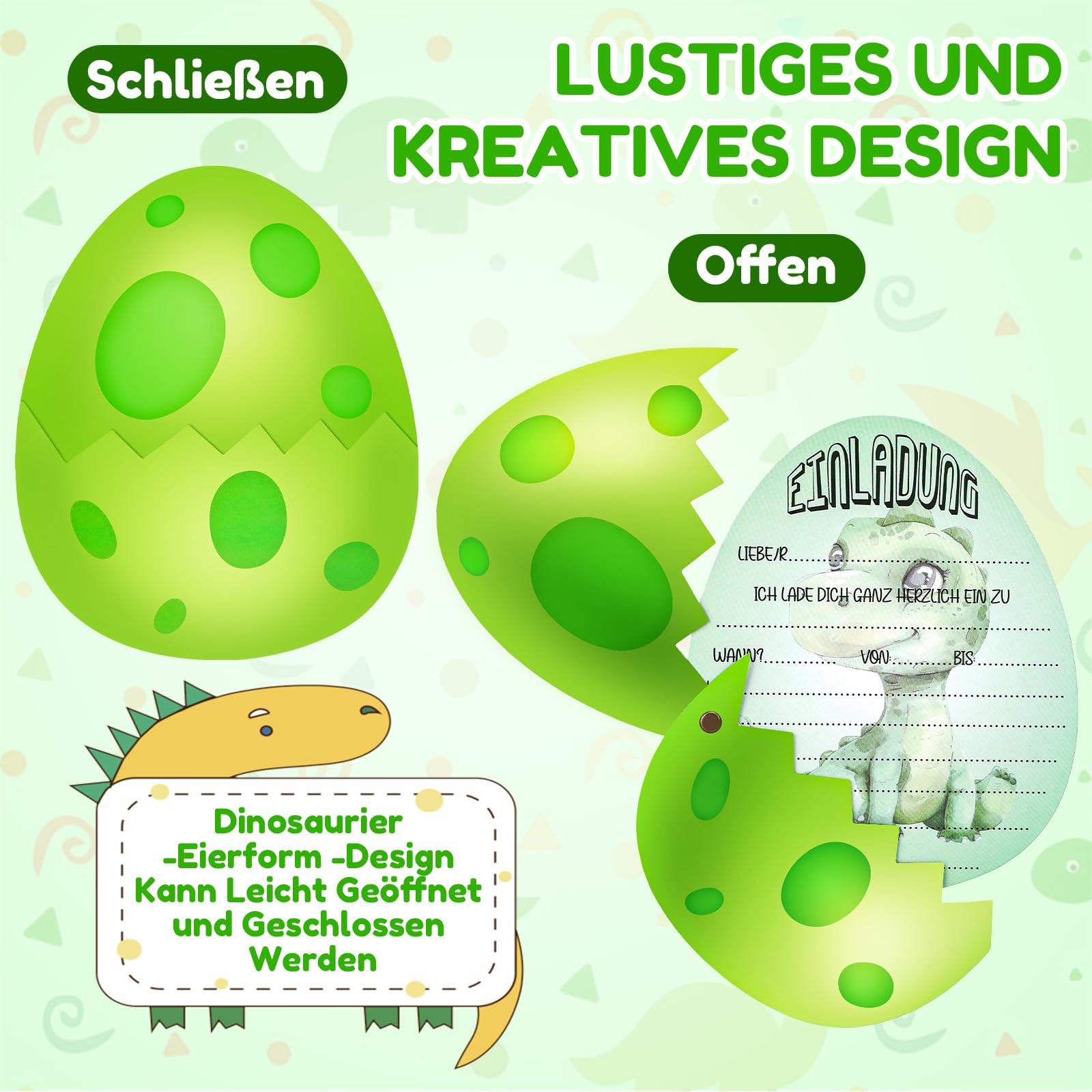 - 【VIELFÄLTIG】 Ob Kindergeburtstagsparty, Gartenparty, Motto-Party, Sommerparty, Jugendweihe, Schulanfang, Kinderfest oder Übernachtungsparty – diese Dinosaurier-Eier Einladungskarten sind die perfekte Partyeinladung für Jungs und Freunde.
