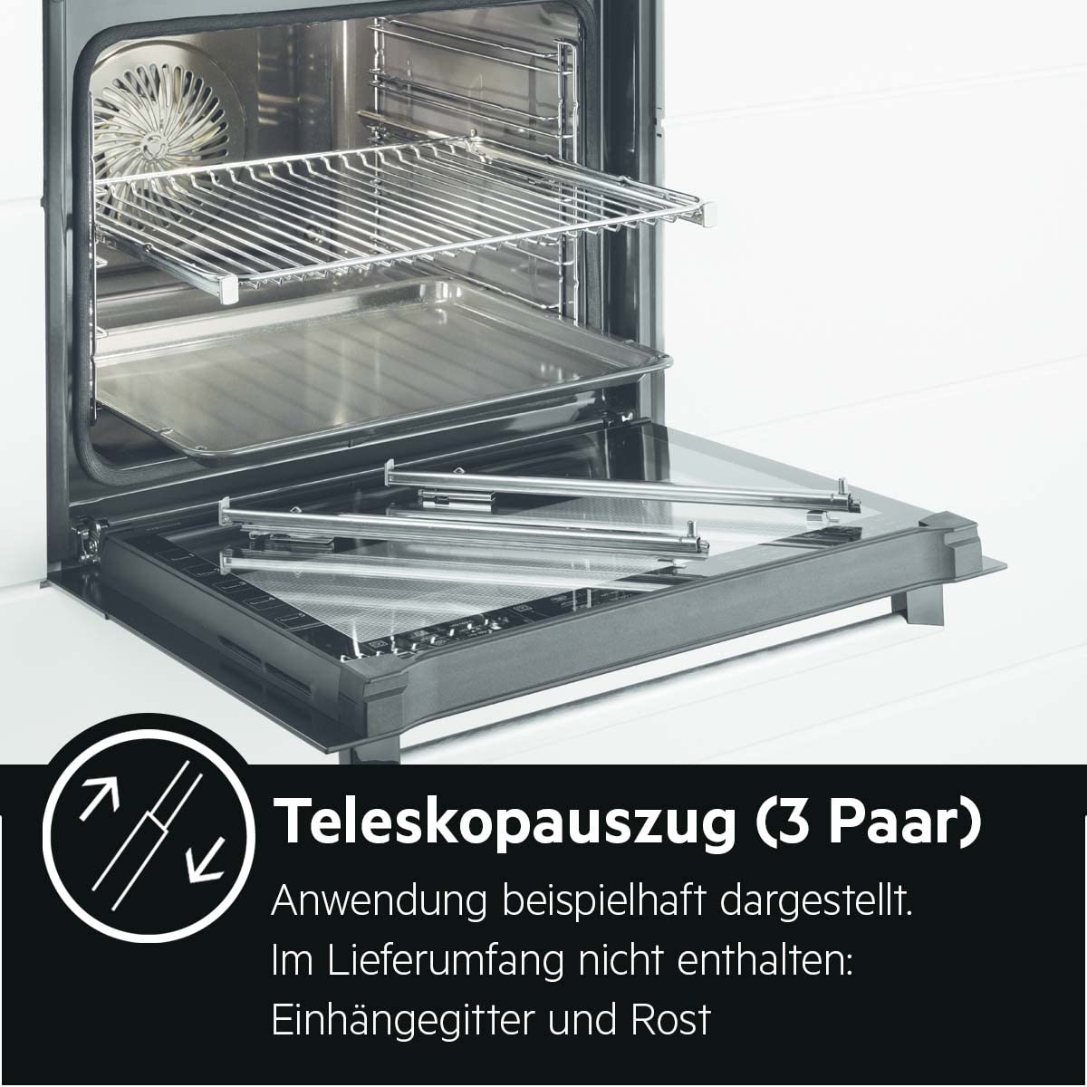 - Im Lieferumfang - 3 Paar FlexiRunners Teilauszüge für drei Ebenen; Anzubringen an vorhandenen Einhängegittern im Backofen; Geeignet für AEG Backöfen und Herde der Serien 3000-6000 und ausgewählte Modelle der Serie 7000