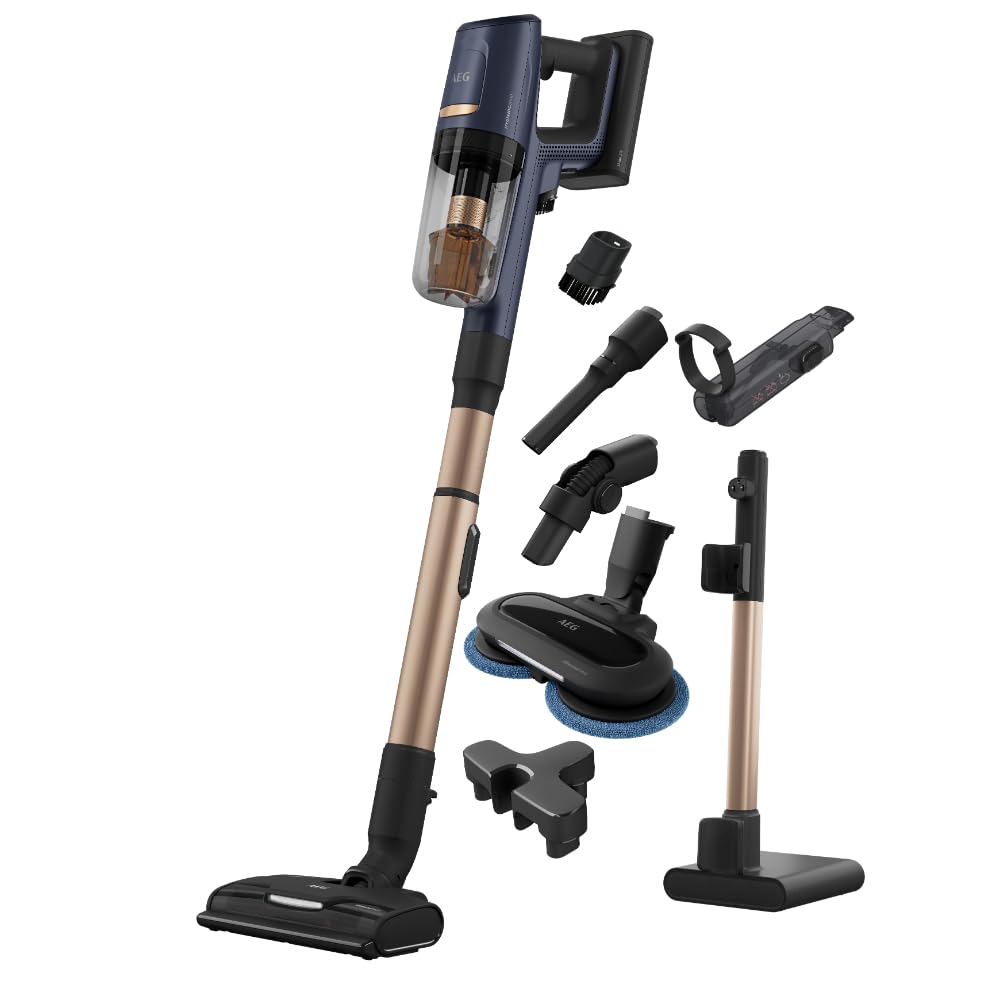 - Saugen & Wischen: Multi-Bodendüse (alle Bodenbeläge, hochwirksam auf Teppich, LED-Licht und Selbstreinigung der Bürstenrolle) – Mop-Düse (rotierende Reinigungspads für Hartböden, Nass-Reinigung, LED-Licht) – per Fuß-Entriegelung wechselbar
