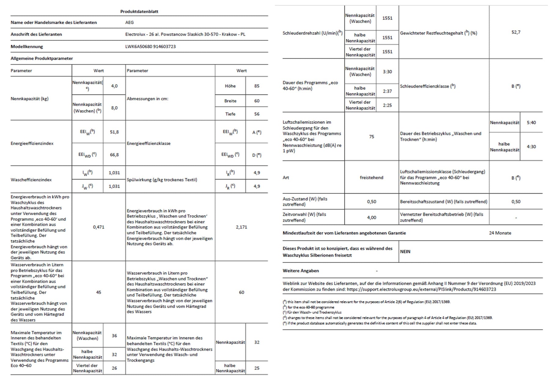 Einzelheiten: AEG LWK6A50680 Waschtrockner Serie 6000 / Wash2Dry mit 5 Kombi-Programmen / 8 kg Waschen / 4 kg Trocknen/Mengenautomatik/Energiekl. D/A/Kindersicherung/LED-Display / 1600 U/min/Weiß