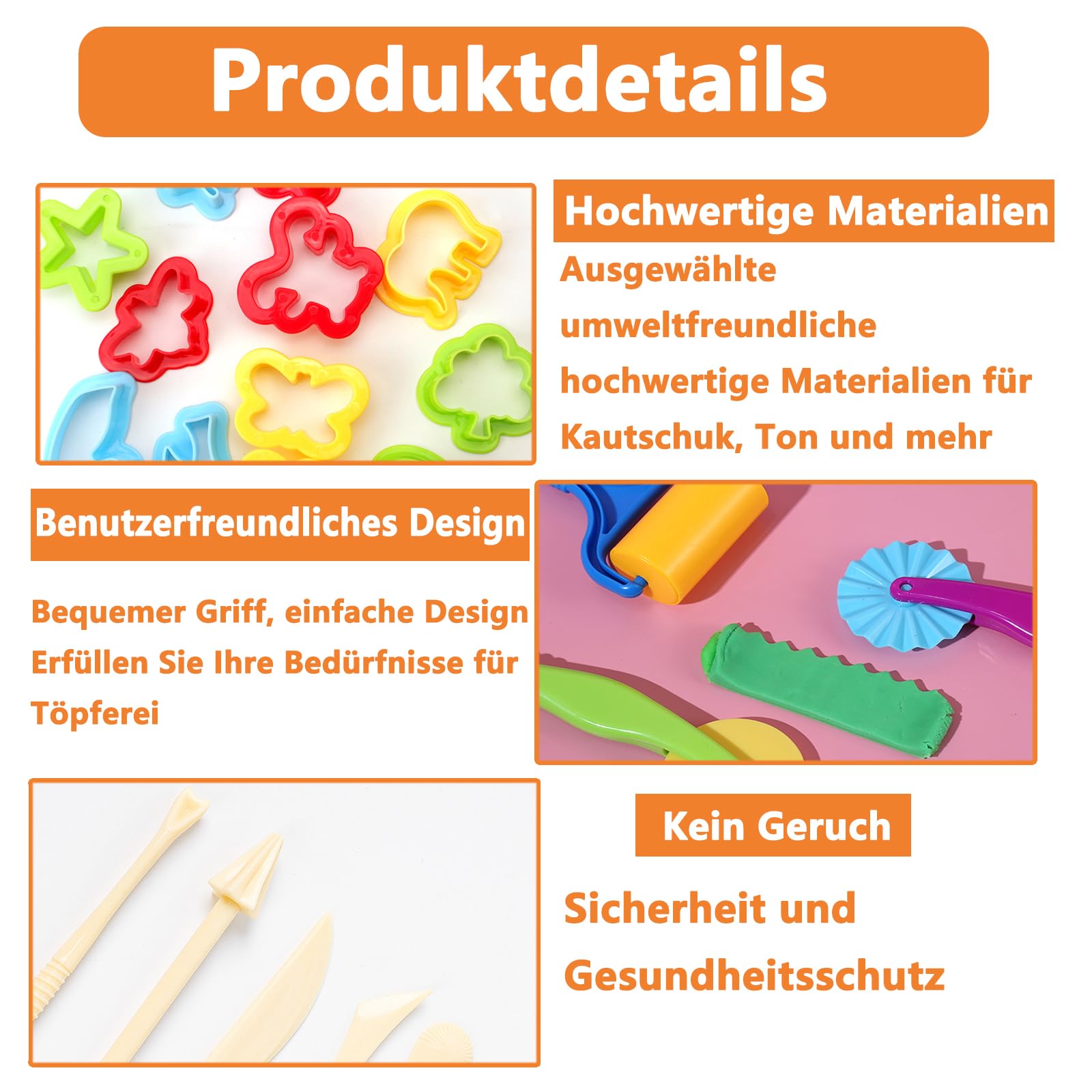 • 【sicher für kinder】:unsere knetzubehör haben keine scharfen kanten, so dass sich die kleinen nicht verletzen können. die knetset sind in ihrer form und größe auf kinderhände abgestimmt.