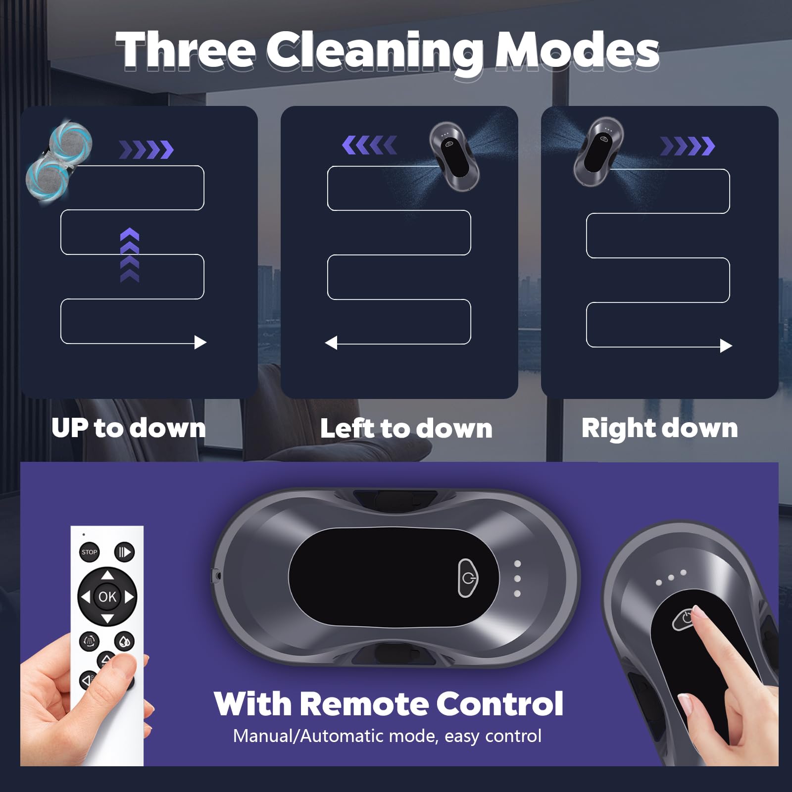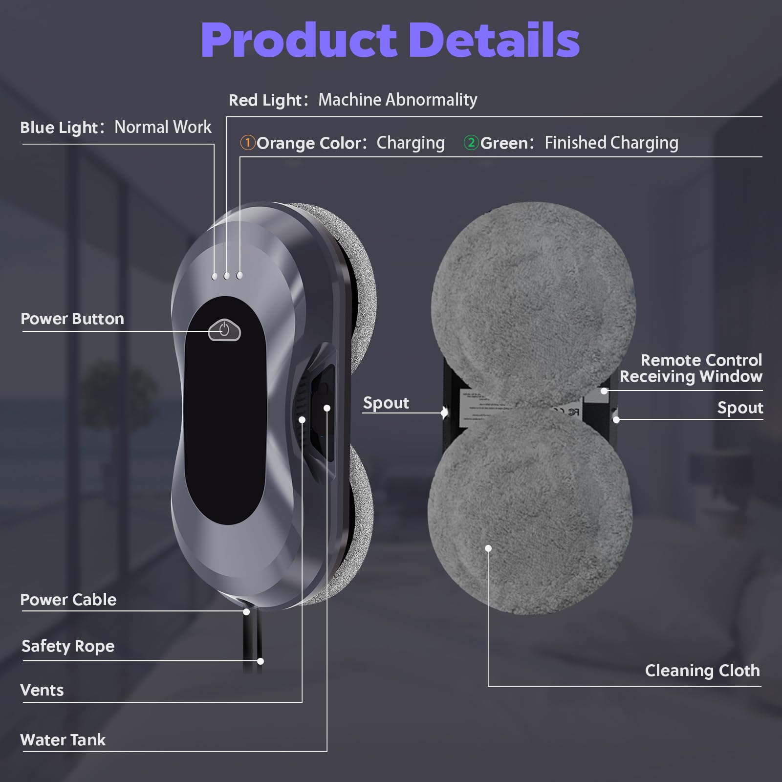 - 【Doppeltes Wassersprühdesign】 Der verbesserte fensterputzroboter verfügt über ein doppelseitiges Wasserauslassdesign, das in alle Richtungen sprühen kann, um eine vollständige Abdeckung des Reinigungsbereichs zu gewährleisten und das Entfernen hartnäckiger Flecken zu erleichtern. Der Roboter verfügt über zwei 35-ml-Wassertanks, die ausreichend Wasser versprühen können und so ein gutes Nasswischerlebnis bieten.