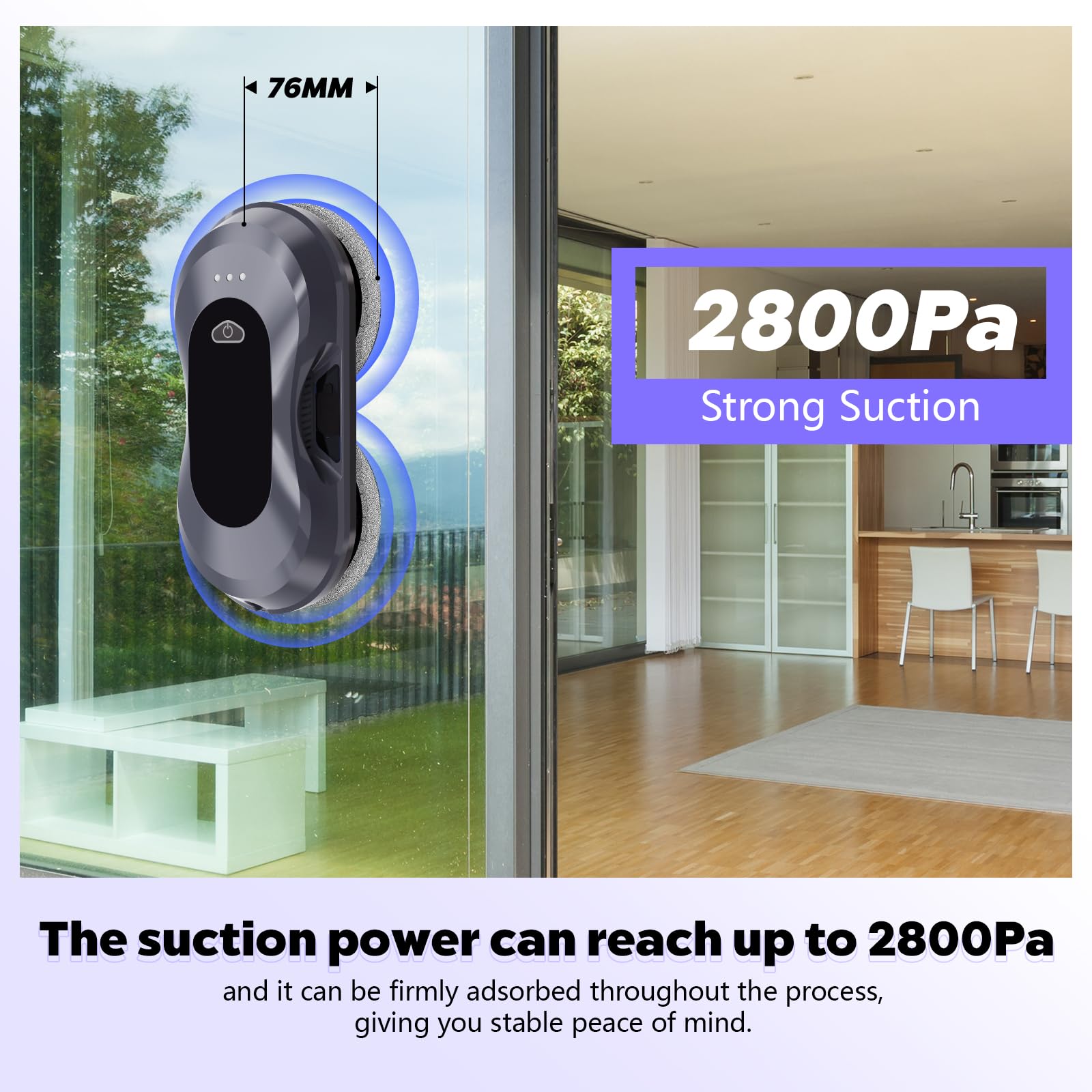 - 【Superstarke Saugkraft】Der Fensterreinigungsroboter hat eine Saugkraft von bis zu 2800pa. Die starke Saugleistung sorgt für eine gute Reinigungsleistung des Fensterputzroboters (Hinweis: Zu nasse Faserpads beeinträchtigen die Saugleistung); Der Fensterputzroboter muss im Betrieb an die Stromversorgung angeschlossen sein und die Saugleistung ist nur dann wirksam, wenn er an die Stromversorgung angeschlossen ist.