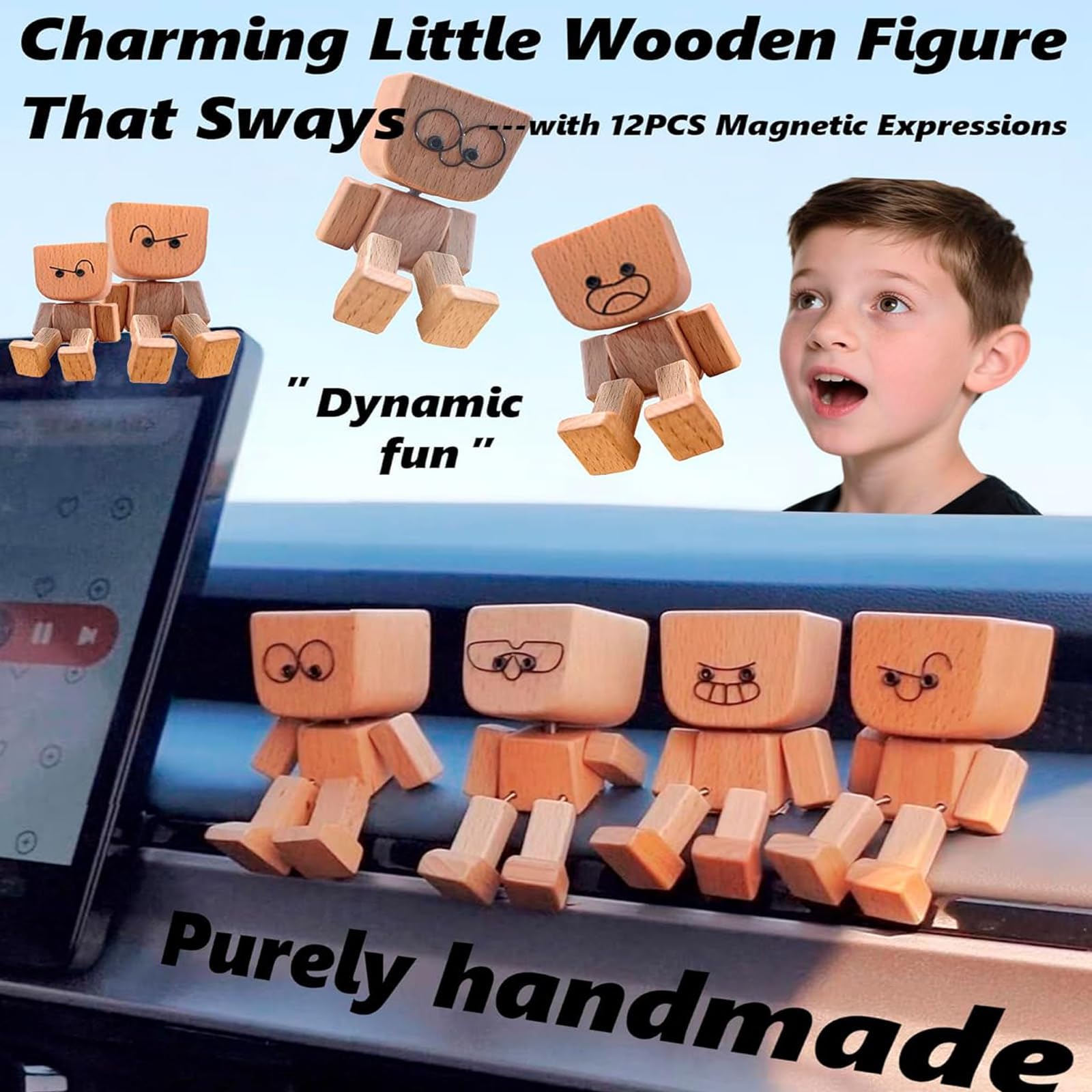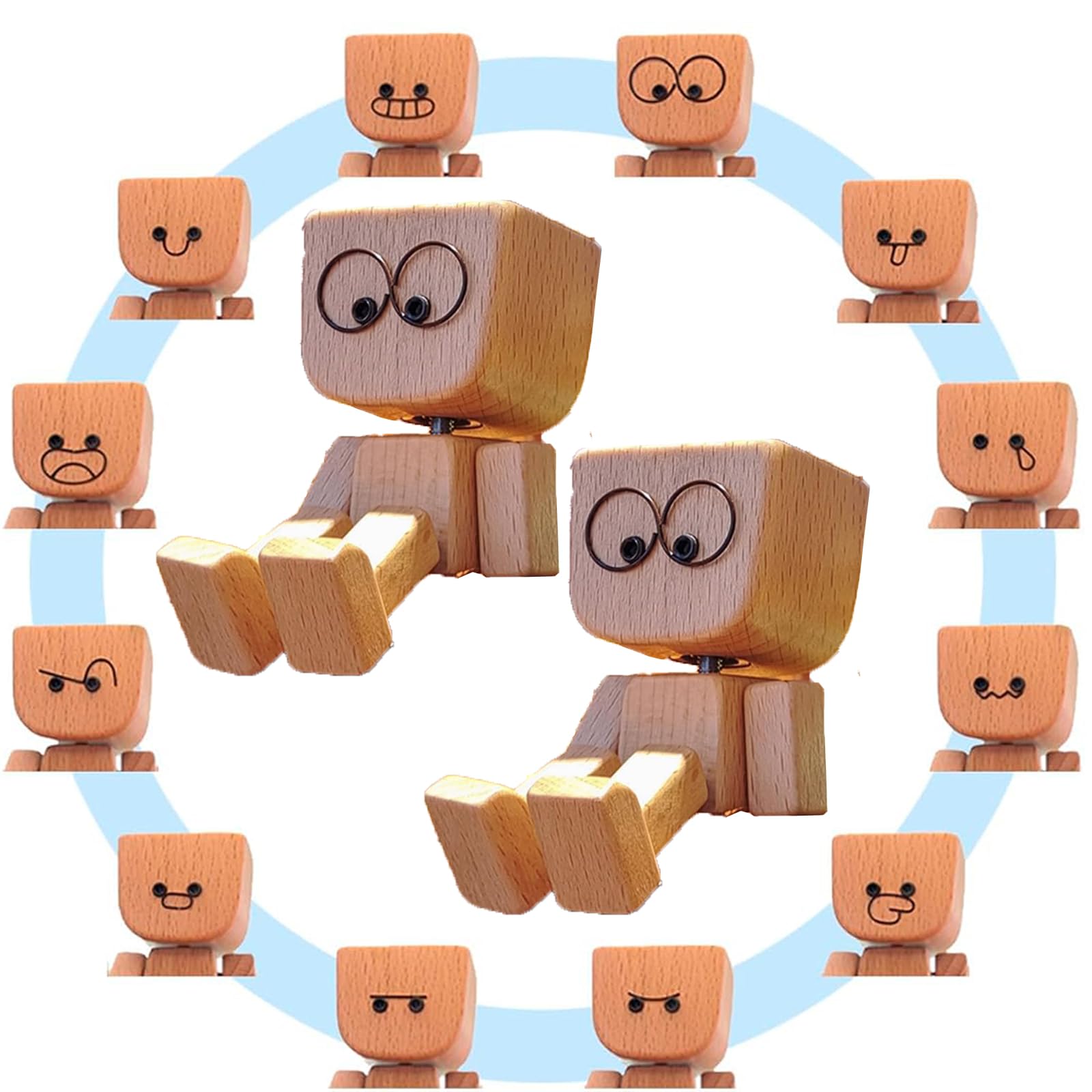 AIDODIA Wackelnder Holzman- Holzfigur WackelfüßE, Holz Wackelfigur - Holzfigur Auto, WackelmäNnchen Holz Mit 12 Magnetischen GesichtsausdrüCken, Holzfigurs Beweglich -Wackel-Auto-Ornament (2 PCS)