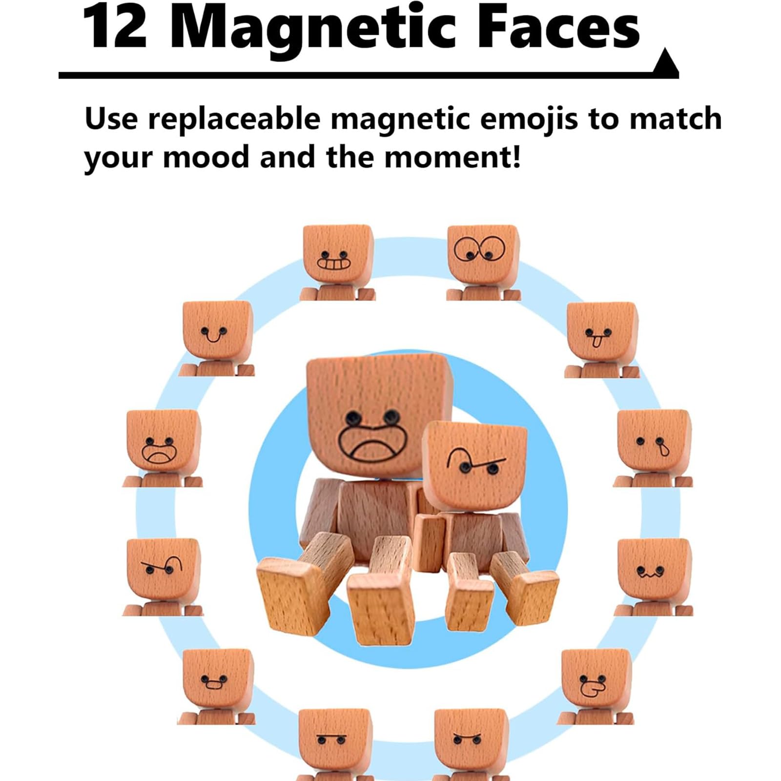 • 【12 AUSTAUSCHBARE MAGNETISCHE AUSDRÜCKE】Dieser wackelnder Holzman bringt mit 12 lustigen magnetischen Gesichtsausdrücken Abwechslung und macht jede Stimmung sichtbar.