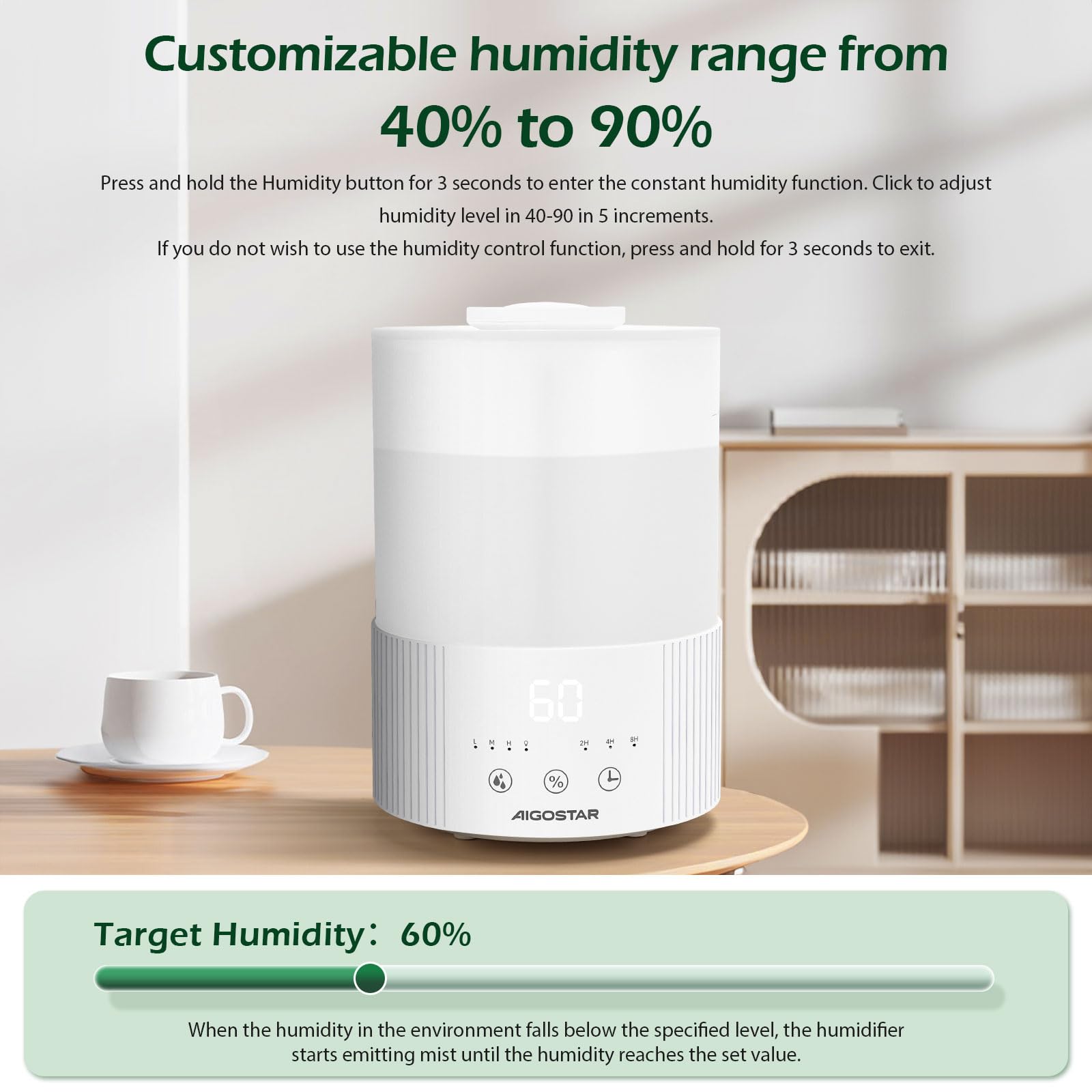 - Konstante Luftfeuchtigkeitsfunktion: Der Kaltnebel-Luftbefeuchter ist mit einer konstanten Luftfeuchtigkeitsfunktion ausgestattet, die die Raumluftfeuchtigkeit zwischen 40% und 90% in 5er-Schritten steuern kann, um sicherzustellen, dass Ihr Zuhause oder Büro immer ein angenehmes Feuchtigkeitsniveau aufrechterhält. Zusätzlich hat unser 2,5L Luftbefeuchter eine Abschaltfunktion bei niedrigem Wasserstand, um die Sicherheit zu maximieren.