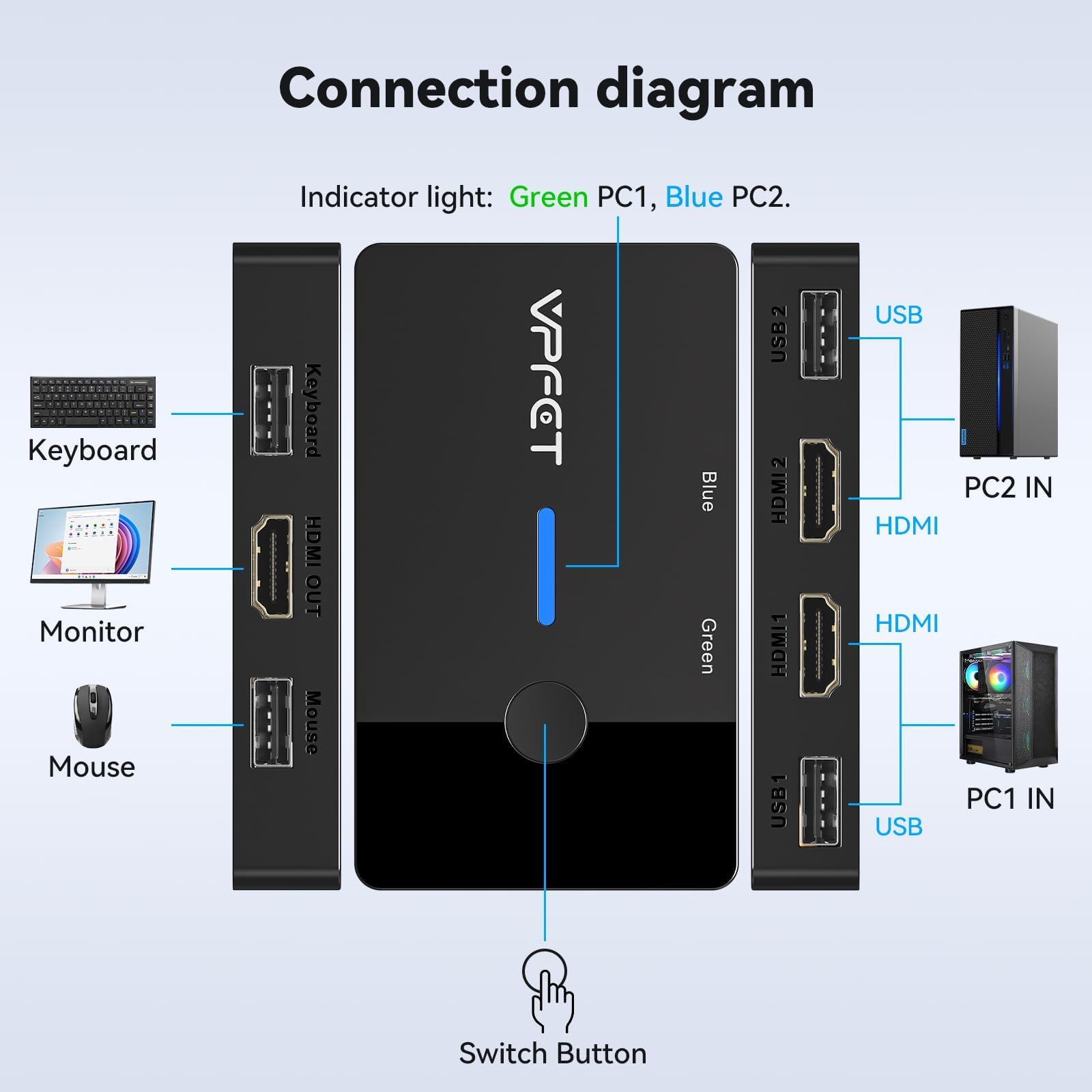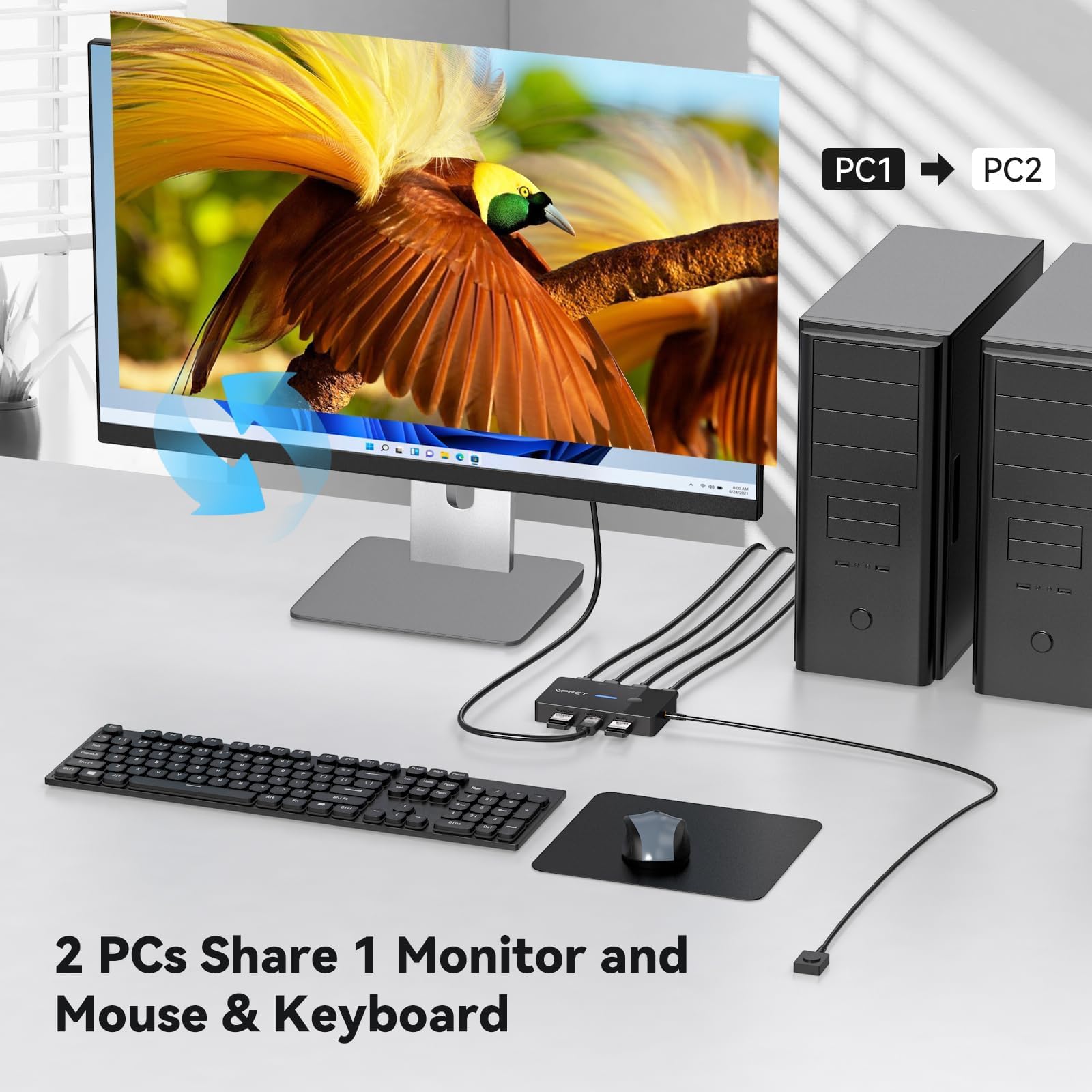- KVM-Switch 2 PC 1 Monitor: Die KVM-switches unterstützen das Teilen eines Satzes von Maus und Tastatur; drücken Sie einfach die Umschalttaste, um schnell zwischen 2 PCs zu wechseln, ohne HDMI- und USB-Kabel ständig ein- und ausstecken zu müssen. So bleibt Ihr Desktop ordentlich und aufgeräumt, während Ihre Produktivität steigt. Hinweis: Überprüfen Sie vor dem Einschalten sorgfältig das Verbindungskabel und stellen Sie sicher, dass alle Anschlüsse korrekt verbunden sind