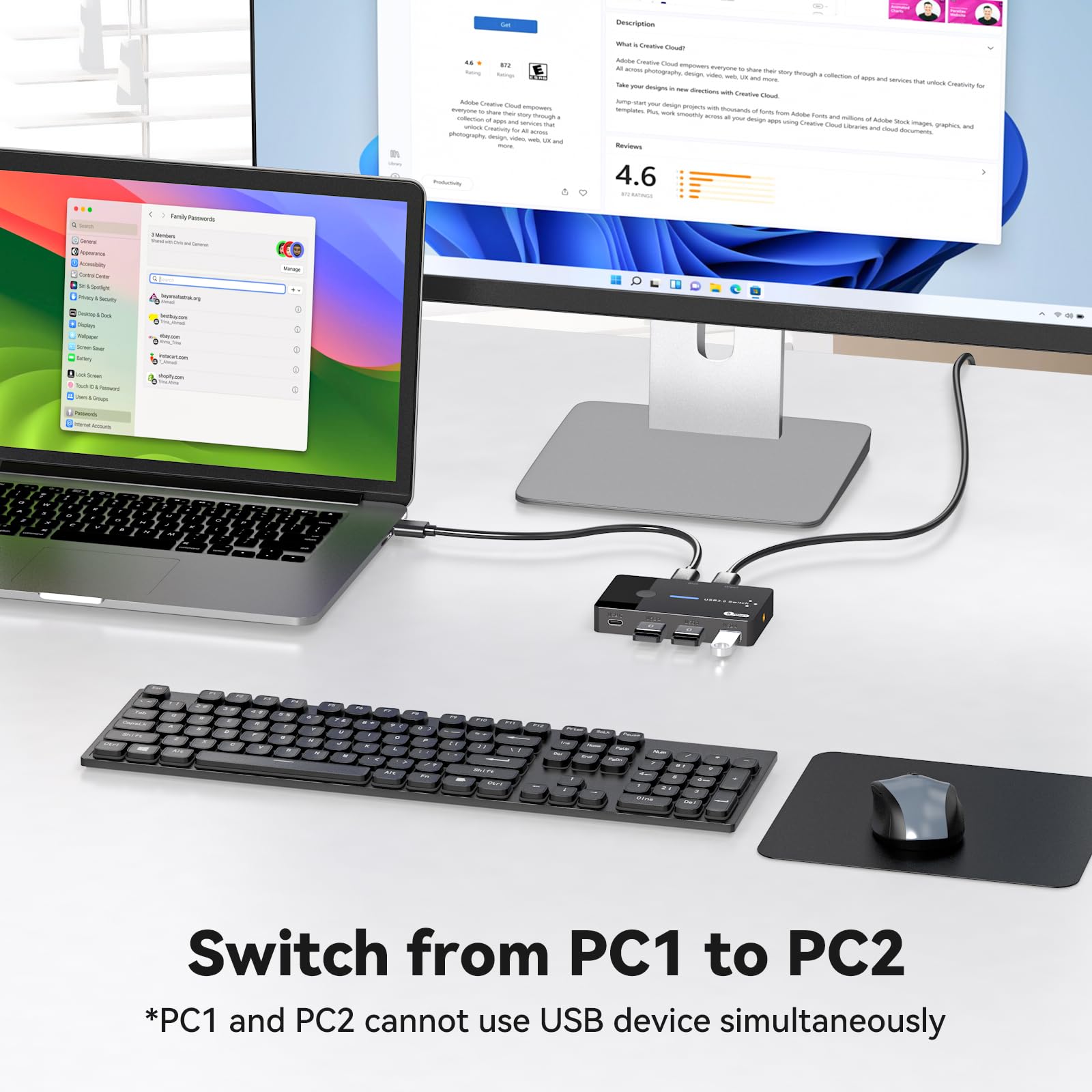- Vor dem Kauf lesen: Dies ist ein Tastatur-Maus-Switch (KM-Switch), dieses Gerät unterstützt keine Monitore (Video), es hat keinen Videoeingang wie ein traditioneller KVM-Switch, jedes Gerät muss seinen eigenen dedizierten Monitor haben. Die USB Switch 2 PC müssen an eine Stromquelle angeschlossen werden, um effektiv zu funktionieren (Netzkabel im Lieferumfang enthalten, Netzteil nicht enthalten). Der USB-C-Anschluss gibt kein Video aus und kann nur Daten übertragen