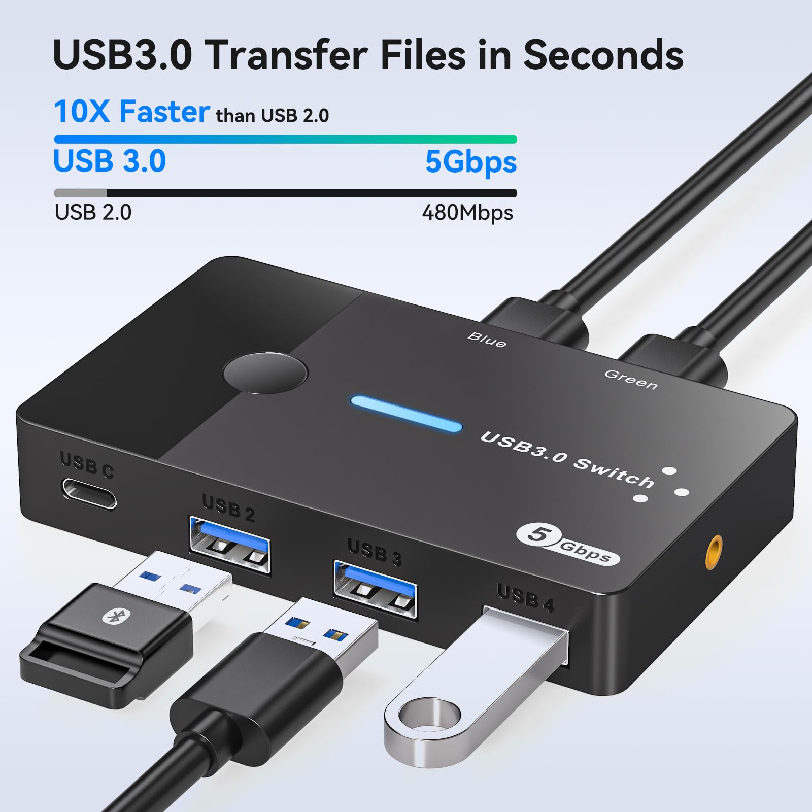 - 5Gbps Datenübertragung / Plug & Play: Der USB umschalter 2 PC kommt mit vier USB 3.0 Ports, die bis zu 5Gbp Datenübertragung unterstützen, spart Ihnen Datenübertragungszeit und ist gleichzeitig rückwärtskompatibel mit USB 2.0; Plug and Play, keine Treiberinstallation erforderlich; Leichtes und kompaktes Design ermöglicht es Ihnen, es in jede Laptop-Reisetasche zu passen; Kompatibel mit Windows, MacOS, Chrome OS und Linux, etc.