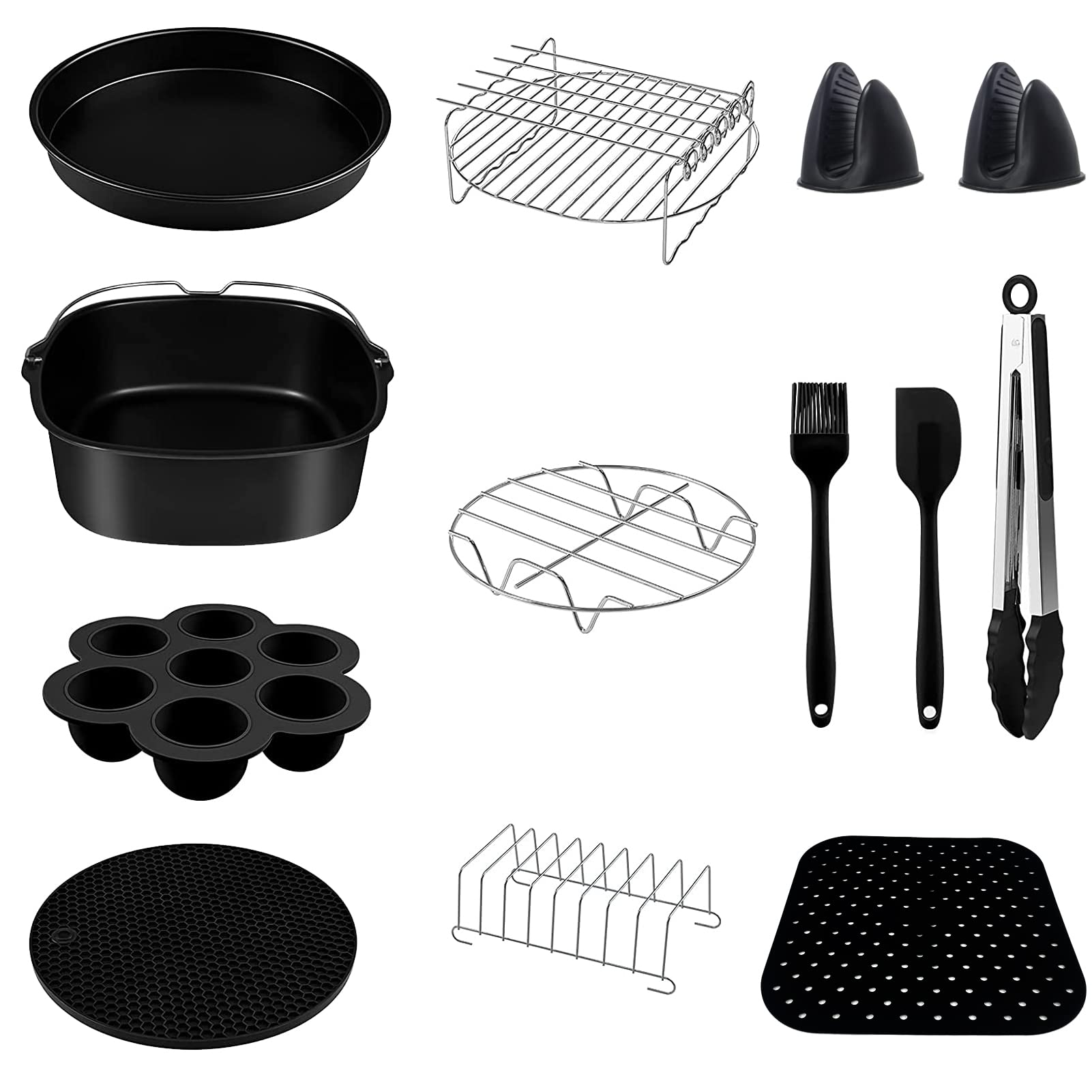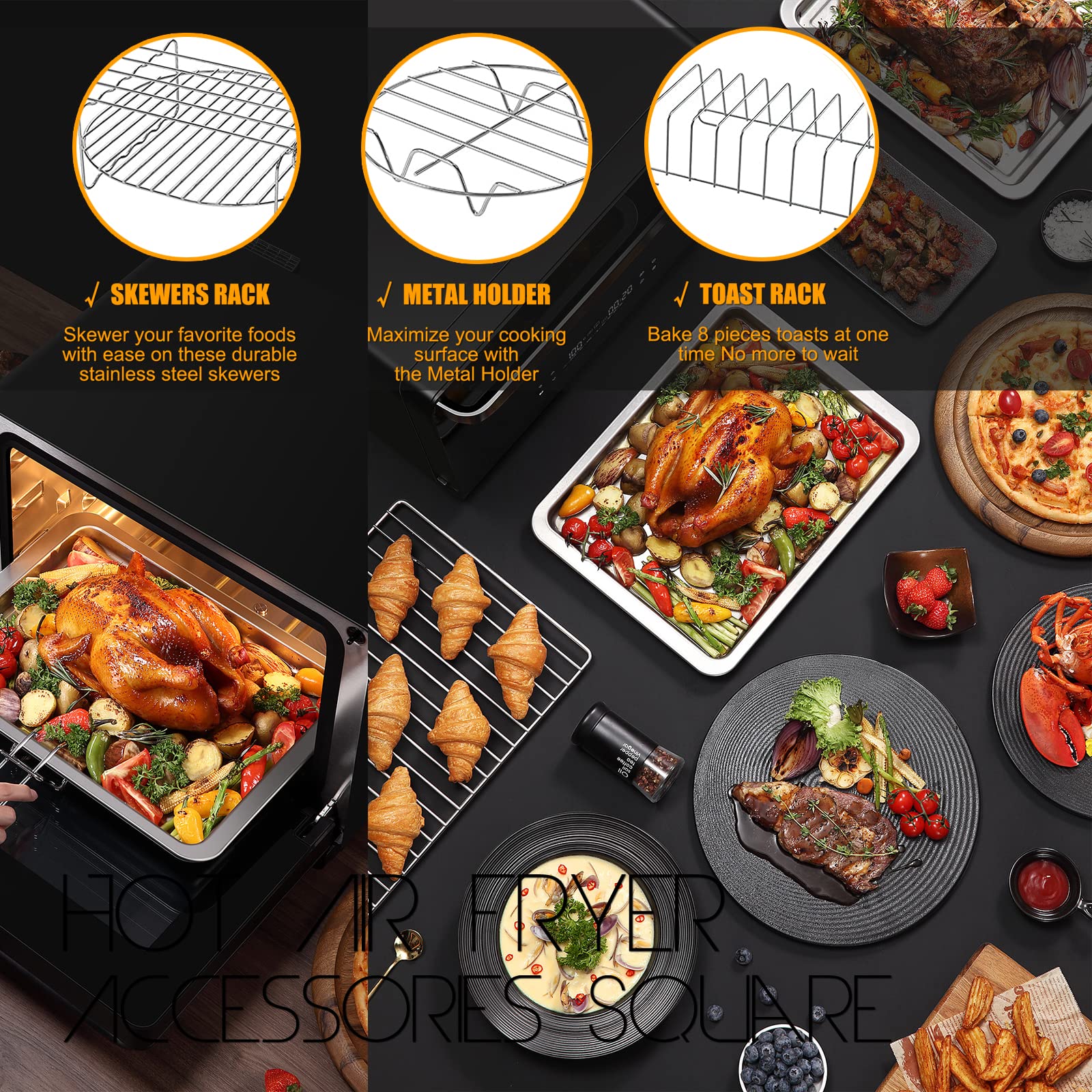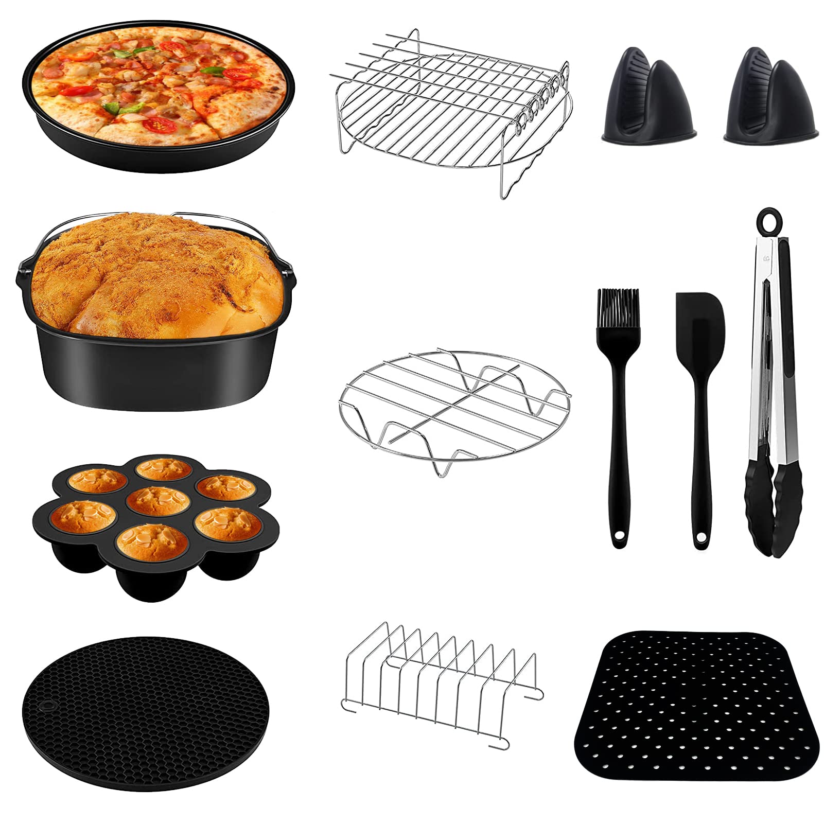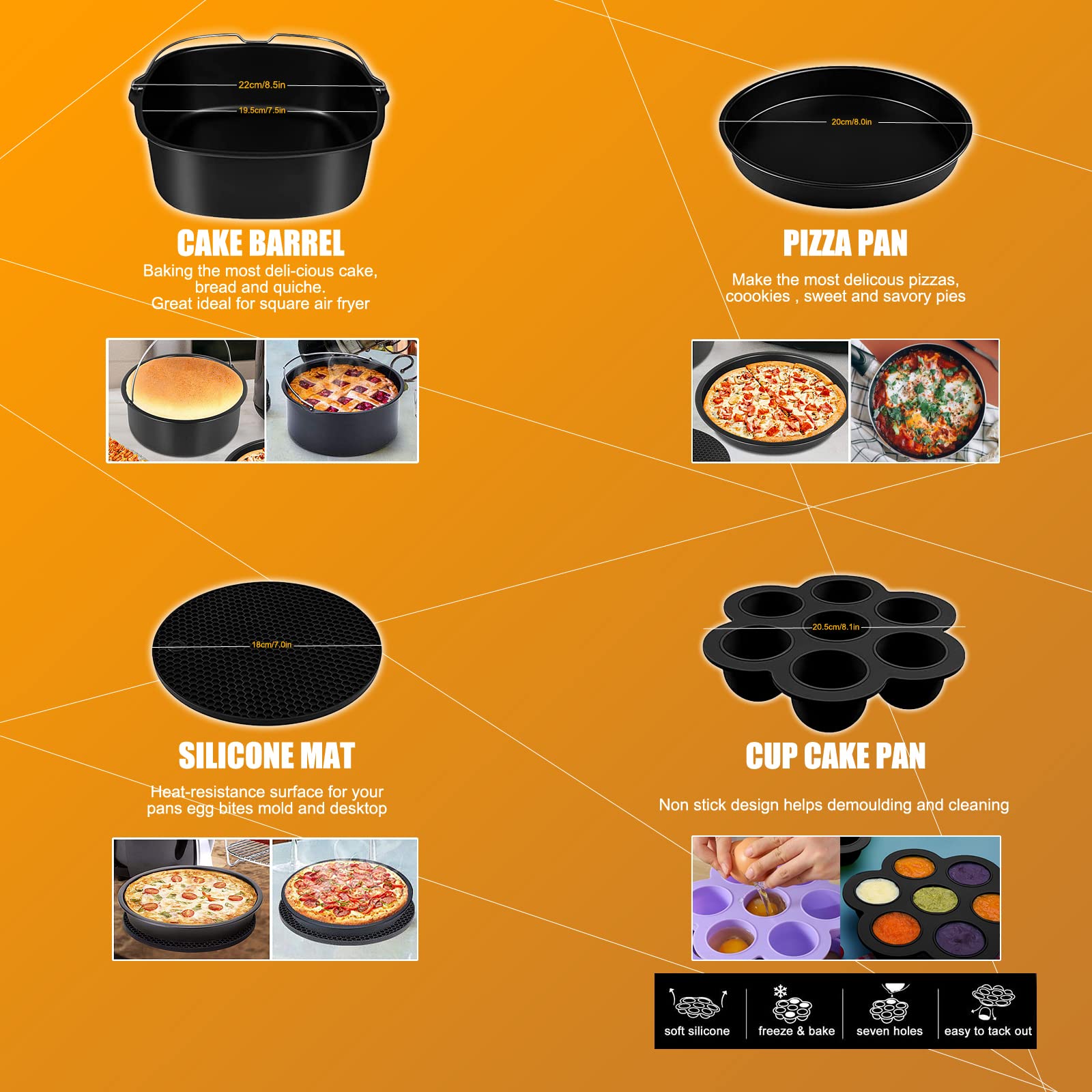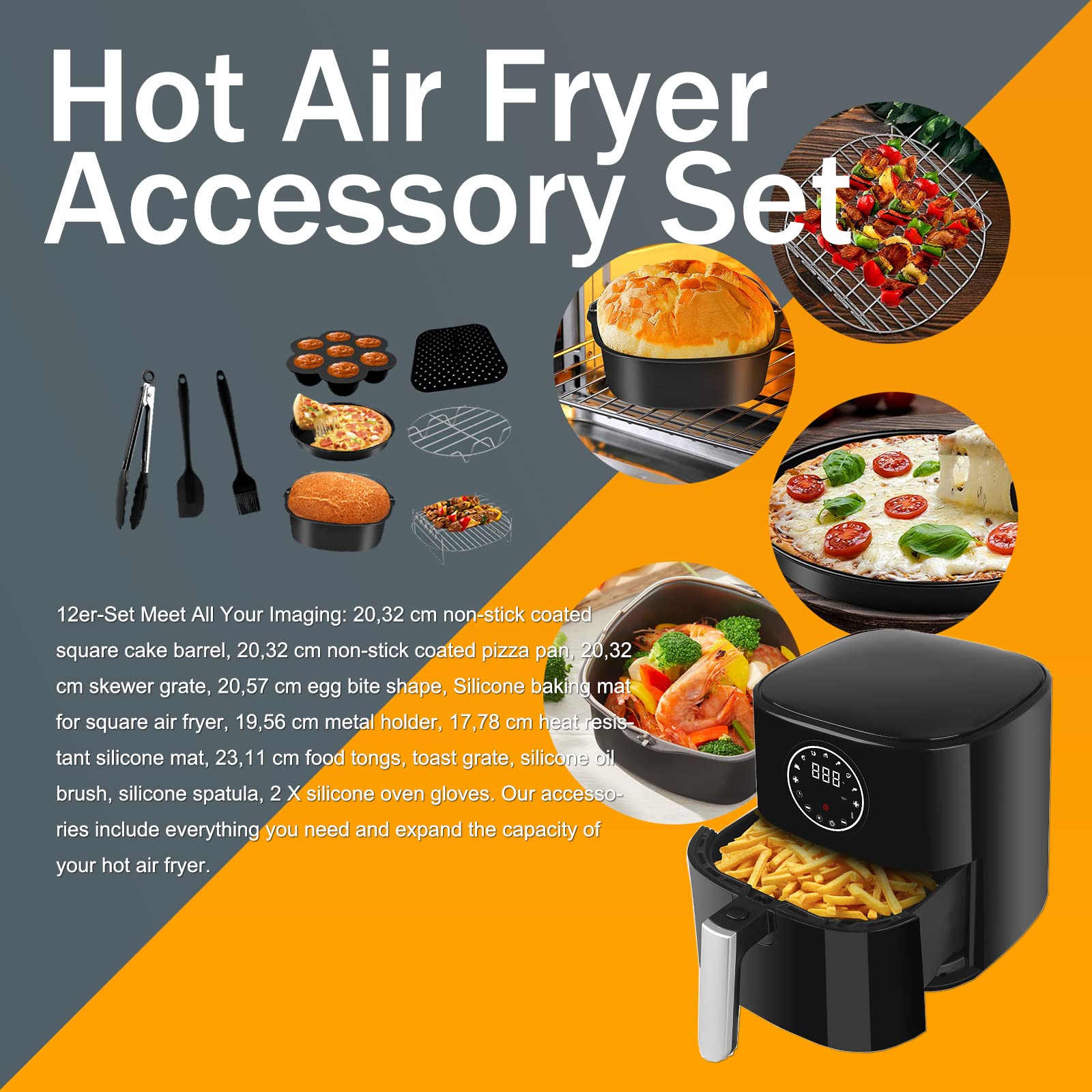 • UMFASSENDES ZUBEHÖR-SET - Das Produkt umfasst einen quadratischen 8-Zoll-Kucheneimer mit Antihaftbeschichtung, eine 8-Zoll-Pizzapfanne mit Antihaftbeschichtung, einen 8-Zoll-Backrost, eine 8-Zoll-Pfanne für Eierbisse, einen quadratischen Airfryer-Silikoneinsatz, einen 19,56-cm-Metallständer und eine 17,78-cm-Silikonmatte , 22,11 cm Lebensmittelzange, Backrost, Silikonfettpinsel, Silikonspatel, 2 Silikonofenhandschuhe.