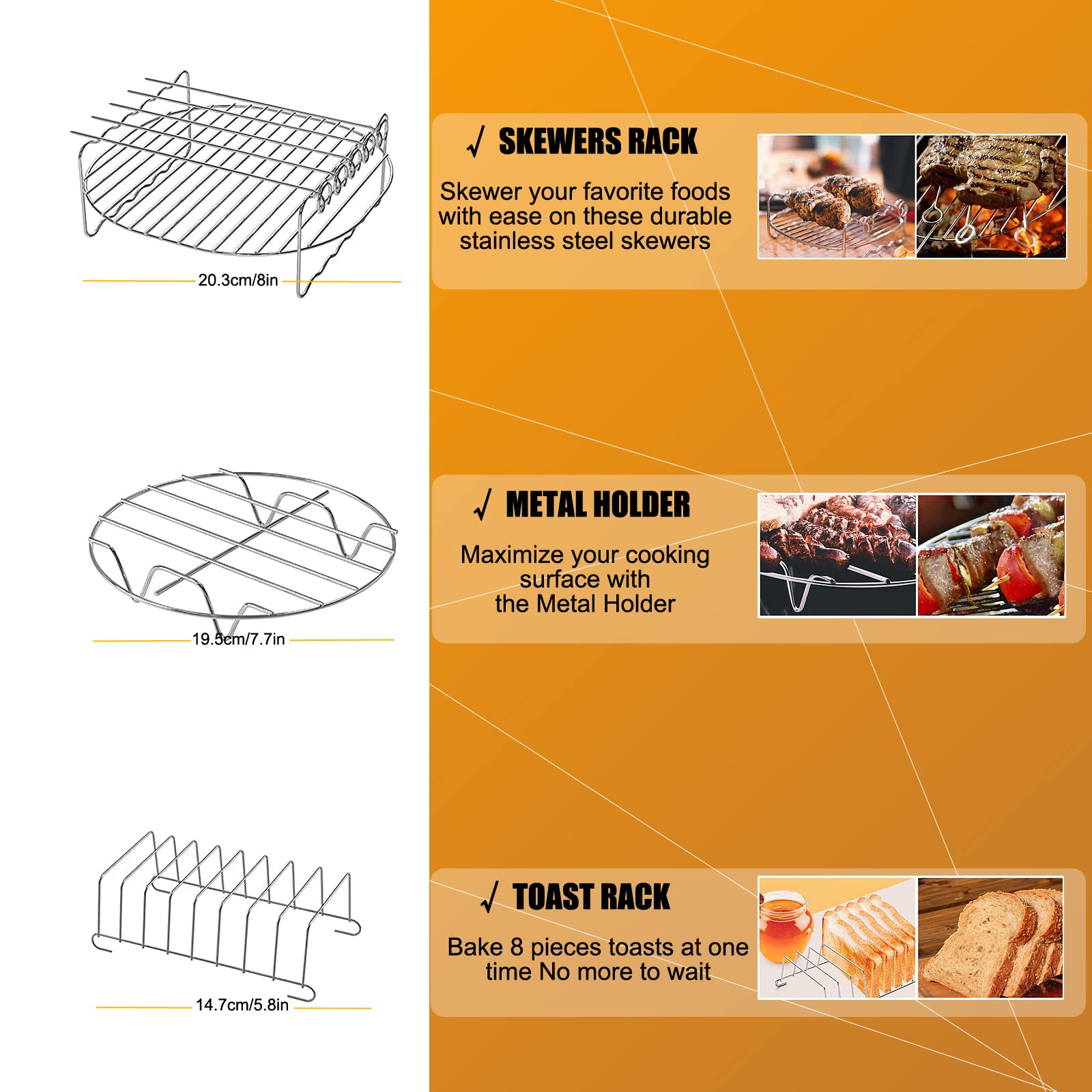• 12-TEILIGES SET FÜR IHRE UNTERSCHIEDLICHEN KOCHBEDÜRFNISSE - Stellen Sie sich vor, was Sie mit unserem Zubehör kochen können. Backen Sie Ihre Lieblingskuchen im Keksfass, backen Sie leckere Pizzen im Pizzablech, bereiten Sie Kebabs mit dem multifunktionalen Grill zu und maximieren Sie Ihre Grillfläche mit dem Metallständer. Dieses Zubehör eignet sich auch perfekt für die Zubereitung von Pommes, Würstchen, Garnelen, Hähnchenstreifen, Fisch, gebratenem Gemüse und vielem mehr.