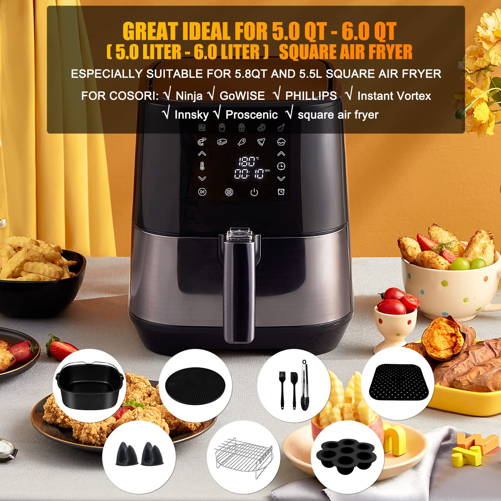 • KOMPATIBEL MIT QUADRATISCHEN 5,5-L-LUFTFRITIERMASCHINEN ALLER MARKEN – I-MOGOO Heißluftfritteusen-Zubehör passt für 5L, 5,2L, 5,5L, 5,7L XL XXLLuftfritteusen für COSORI Princess Innsky Philips und alle anderen Marken von quadratischen Heißluftfritteusen ab 5,5 Liter.