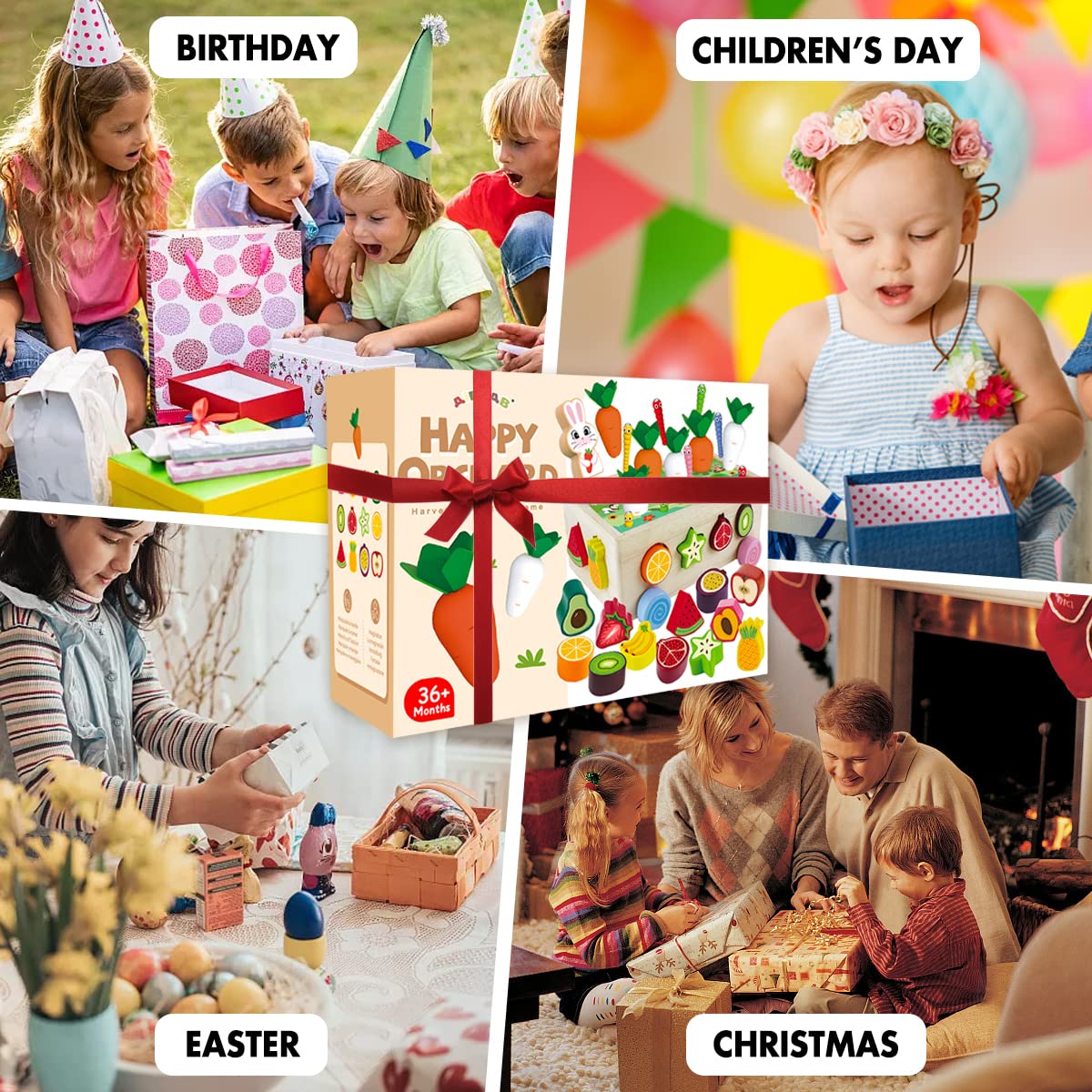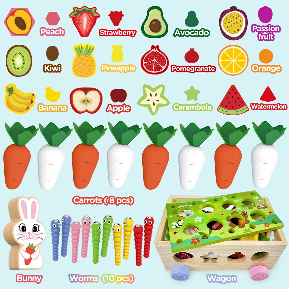 - EIN SINNVOLLES MOTORIKSPIELZEUG: Die Kinder passen verschieden große Radieschen und Löcher in den fruchtbaren Acker und fangen Würmer mit Kaninchen. Dank der bunten Farben können die Kleine die Früchte leicht erkennen und haben Spaß beim Sortieren und Stapeln des Obstzubehör. Reichhaltige Kinderspielzeuge sind für Babys attraktiver und ihre Erfahrungen sind umfassender