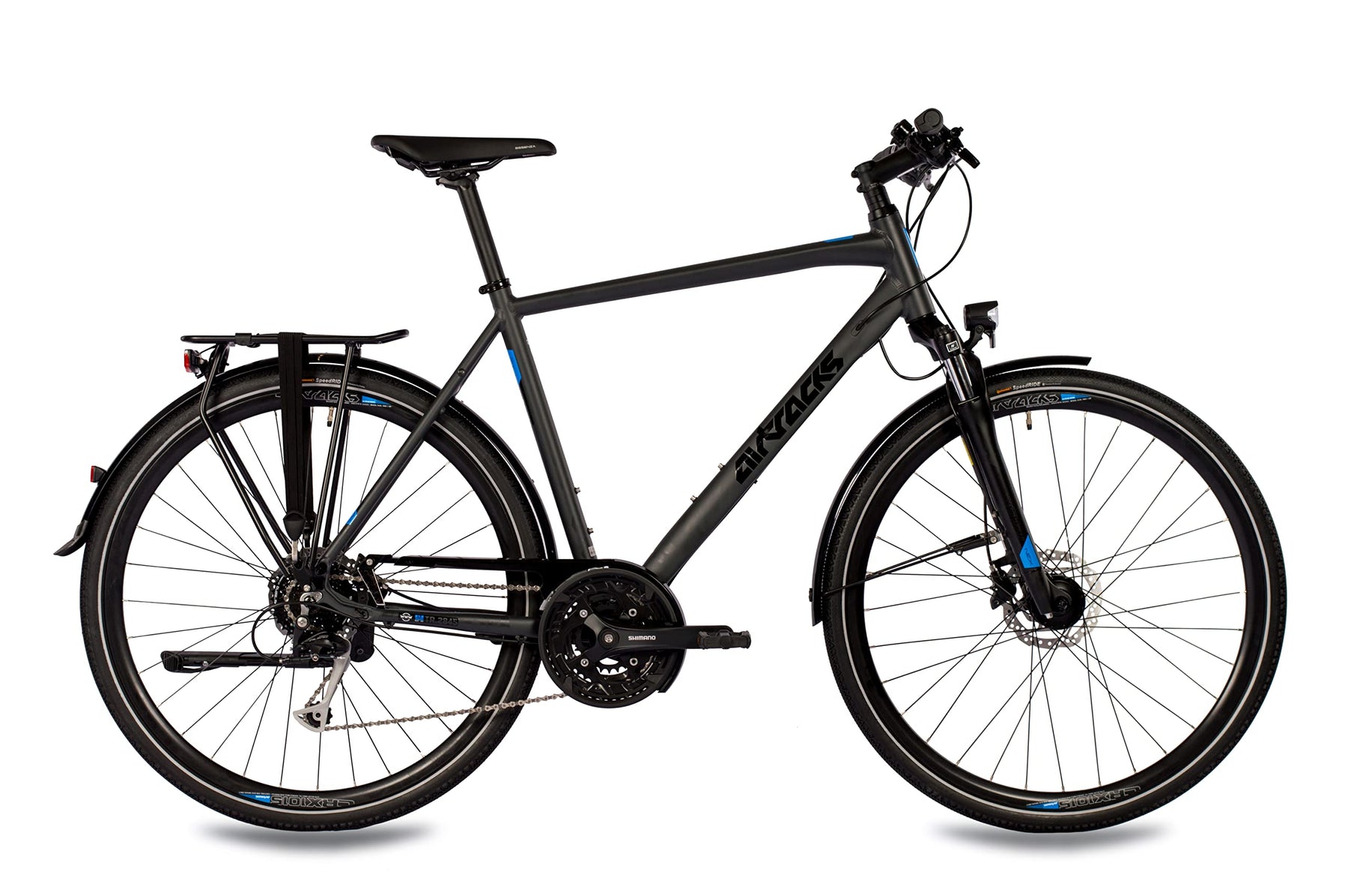• Zu der Grundaustattung eines Trekkingsrades gehört natürlich eine gute Kettenschaltung, in unserem Fall bei dem Airtracks TR.2045 die 27-Gang Shimano Alivio. Die leistungsstarke Lichtanlage von Herrmans vorne und Axa hinten betrieben durch den Nabendynamo Shimano Nexus sorgen dafür, dass man sieht und gesehen wird.