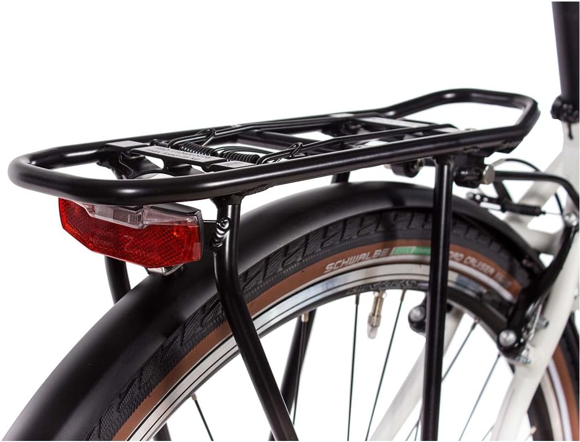 - Überragender Bremsleistung, die eingebauten V-Bremsen sind nicht nur gut in Schuss, sondern auch wartungsarm. Das graue schlichte Design spielt die Rolle eines Diebstahl-Schutzes in den Metropolen. Mit dem vormontierten Gepäckträger Racktime ECO 2.0 lassen sich entweder Seitentaschen anhängen oder einen Fahrradkorb montieren bzw. einstecken.