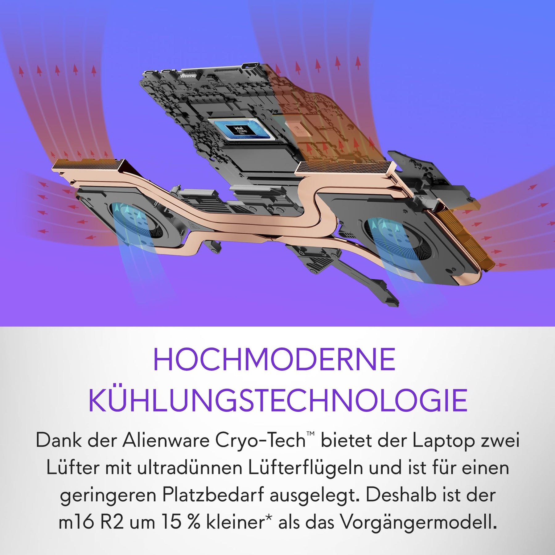 - HOCHMODERNE KÜHLUNGSTECHNOLOGIE: Dank der Alienware Cryo-Tech bietet der Laptop zwei Lüfter mit ultradünnen Lüfterflügeln und ist für einen geringeren Platzbedarf ausgelegt. Deshalb ist der m16 R2 um 15 % kleiner* als das Vorgängermodell. * Basierend auf einer internen Analyse, Oktober 2023.
