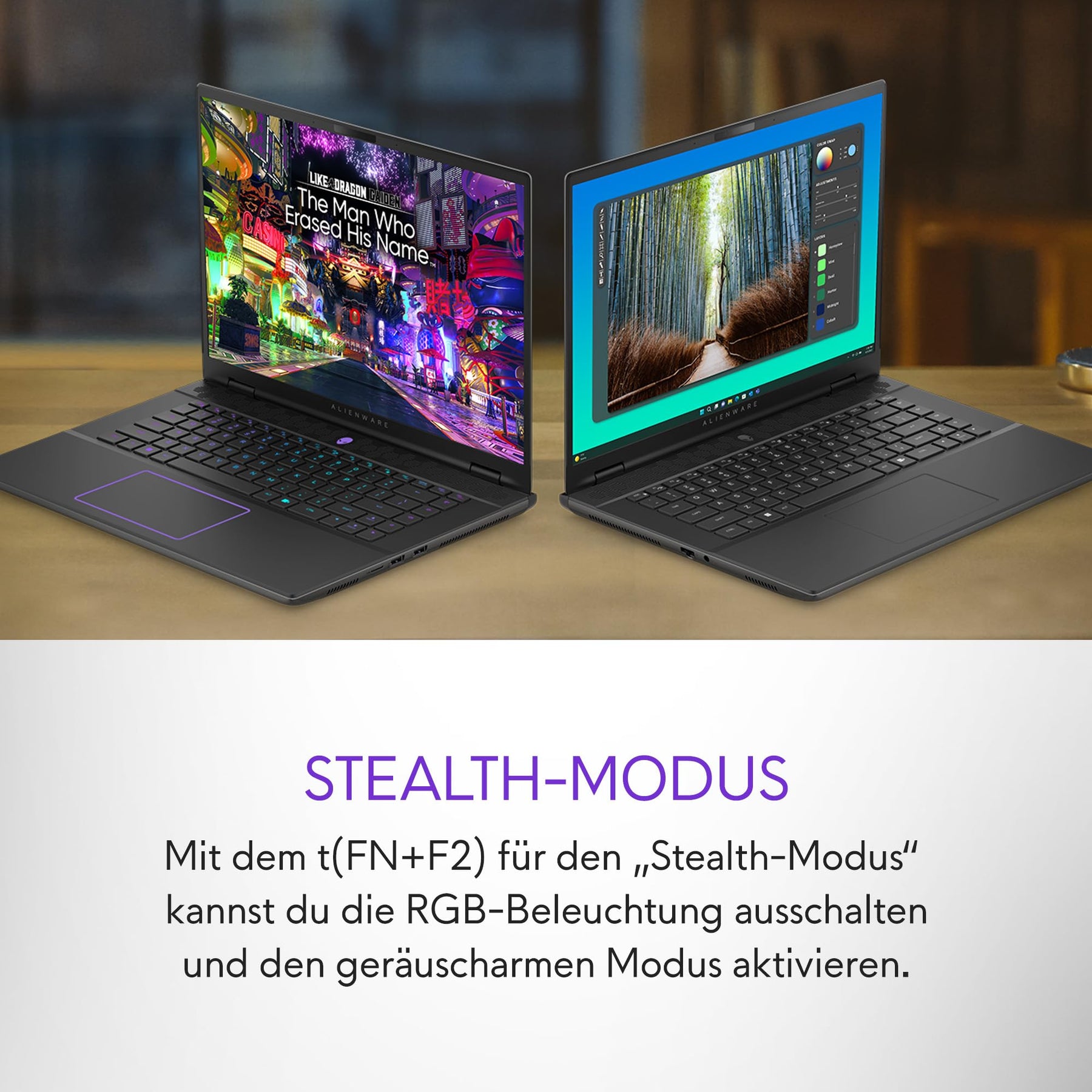 - STEALTH-MODUS: Mit dem Hotkey für den „Stealth-Modus“ kannst du bei Undercoveraufgaben die RGB-Beleuchtung ausschalten und den geräuscharmen Modus aktivieren. Drücke dazu einfach nur FN+F2.