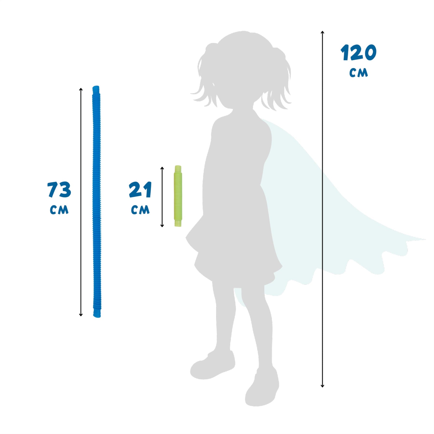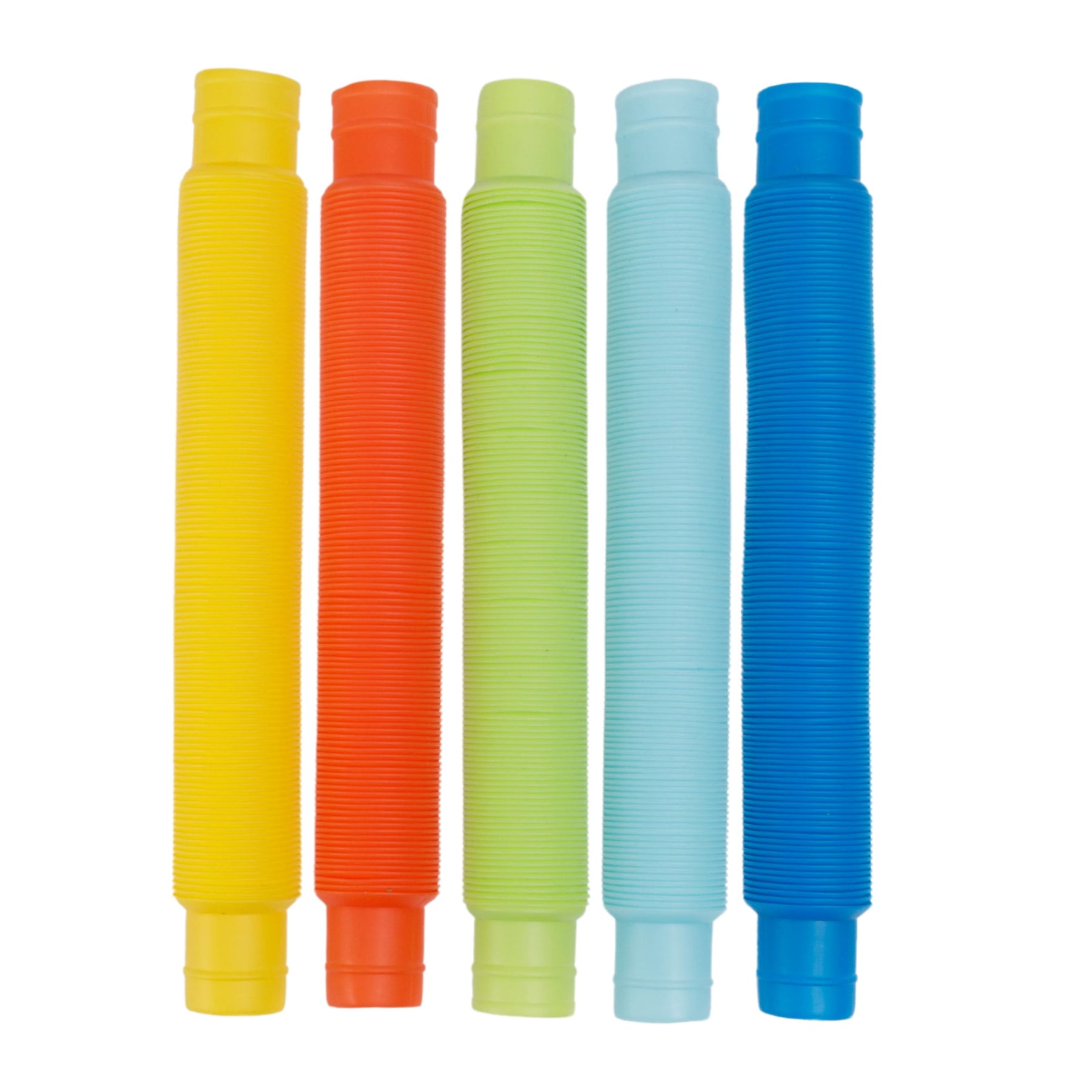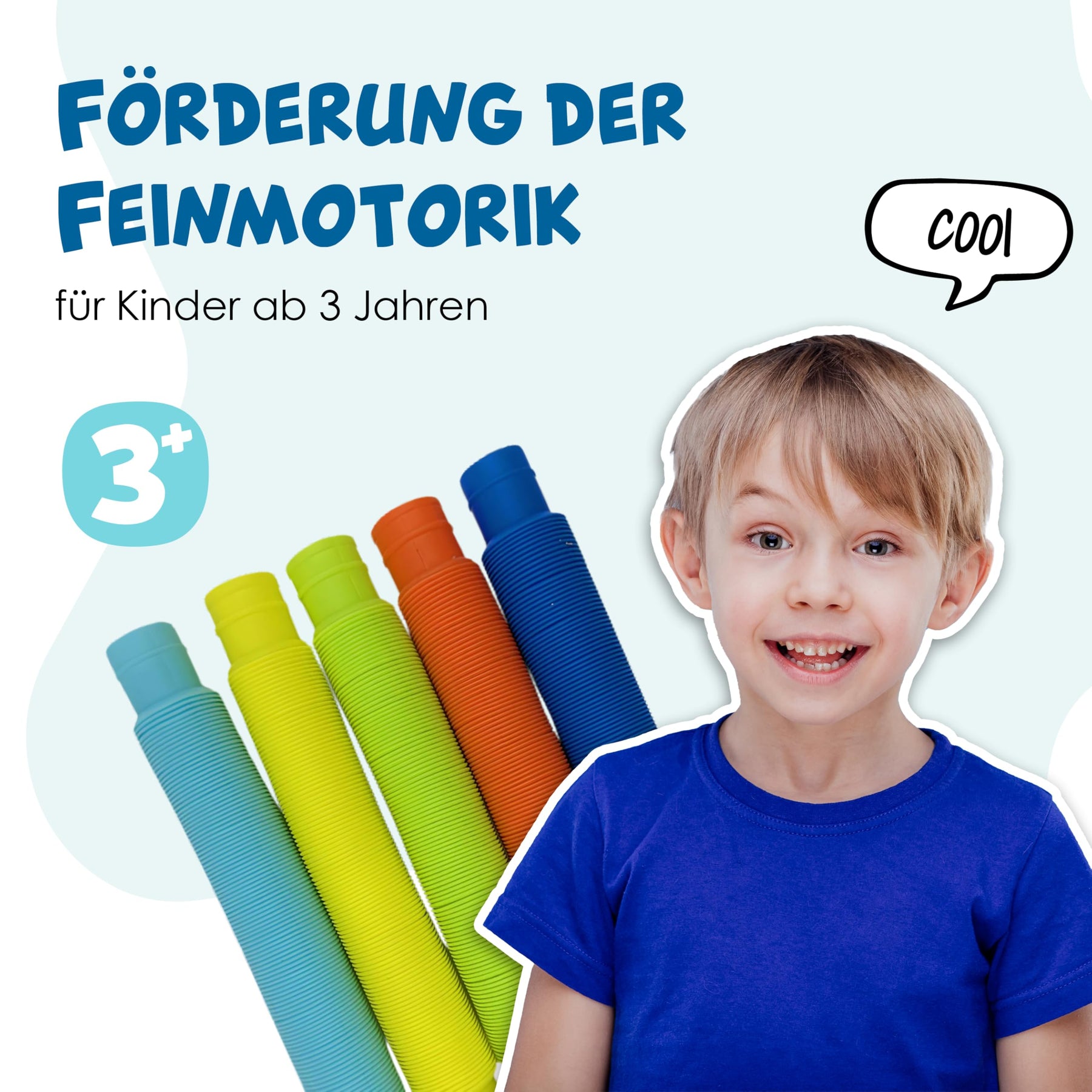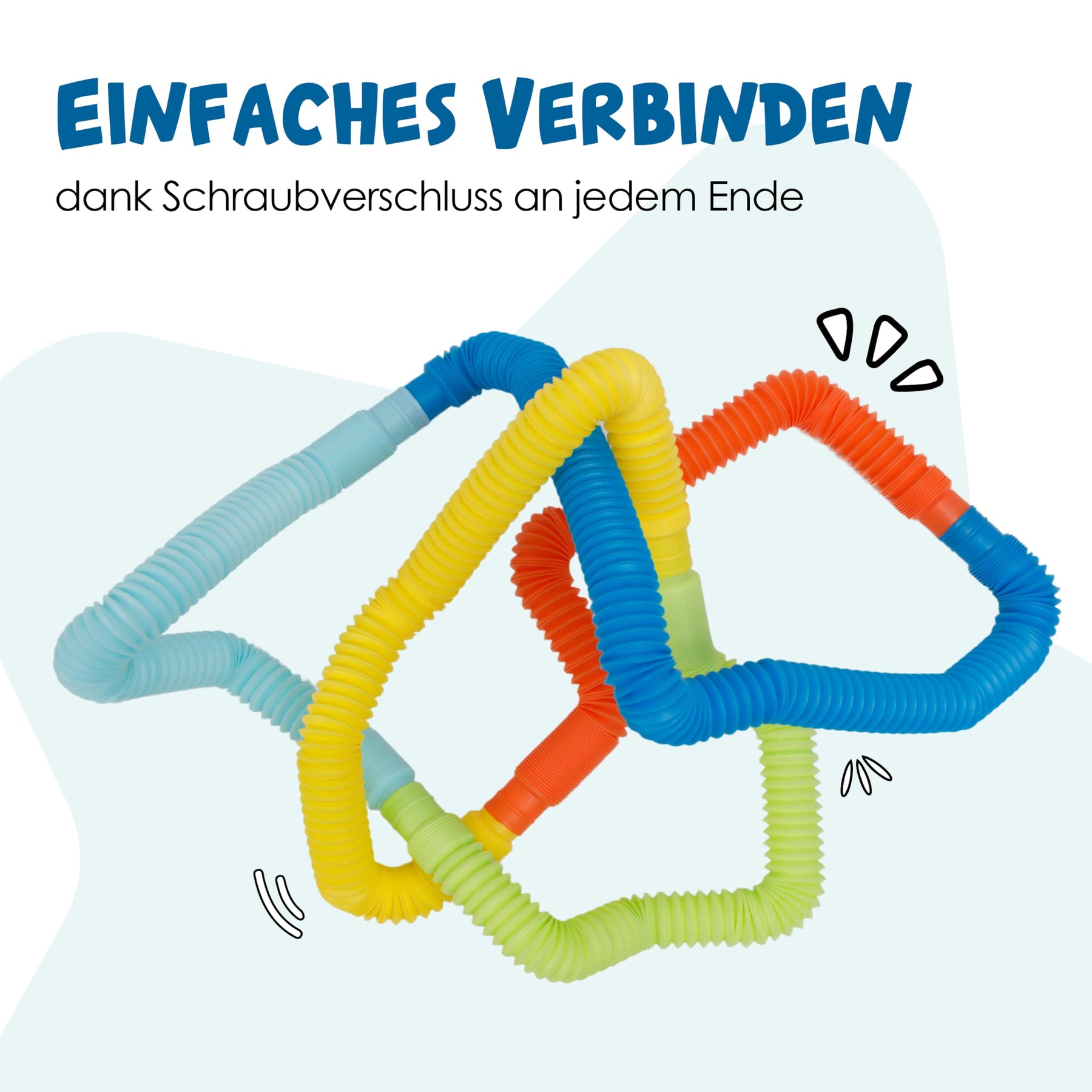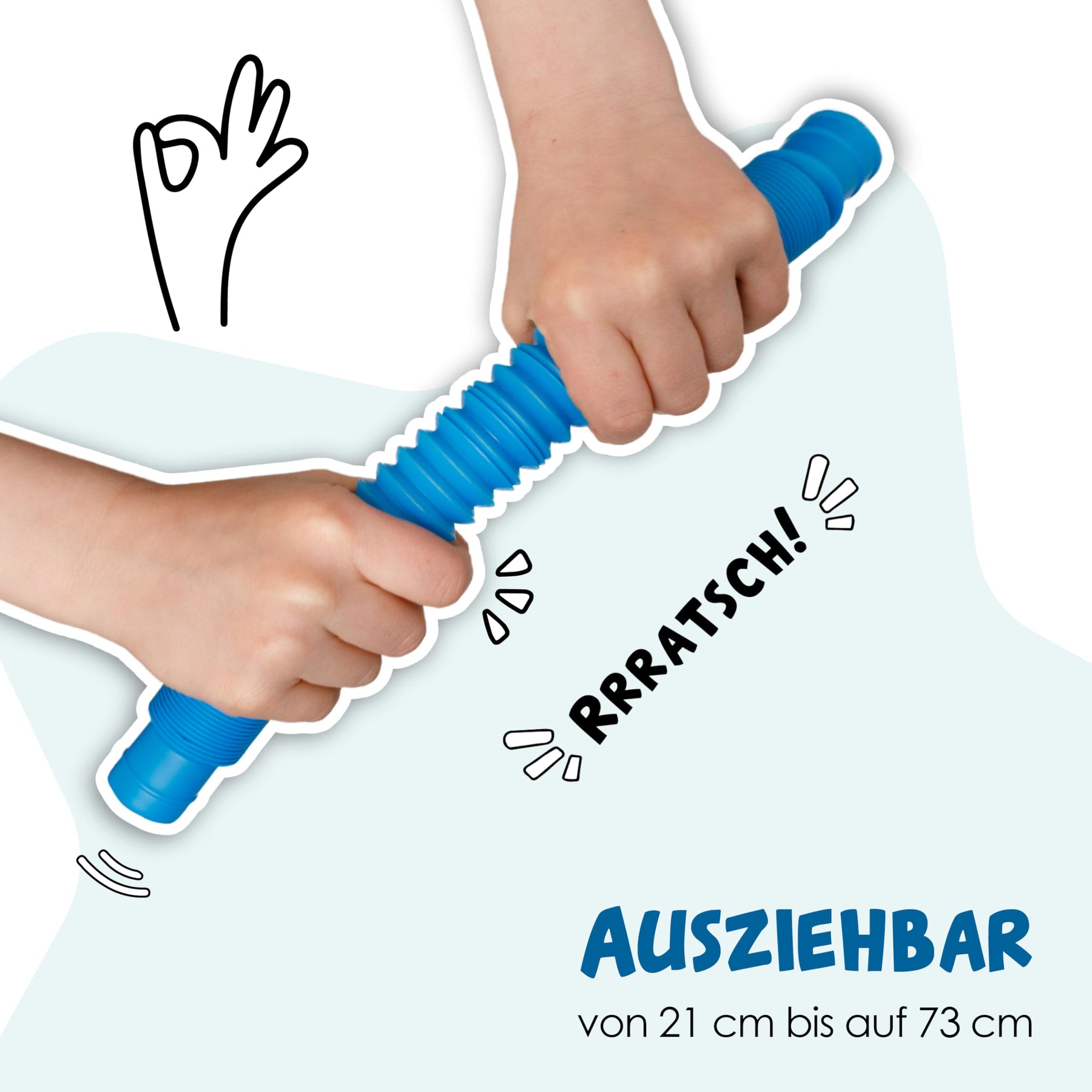 • Bunte Fidget Tubes - Set mit 5 flexiblen Pop Tubes in Dunkelblau, Hellblau, Orange, Gelb & Grün. Ausziehbar von 21 bis 73 cm mit lustigem Ritsch-Ratsch-Sound, der Kinder begeistert & spielerisch Motorik & Kreativität fördert