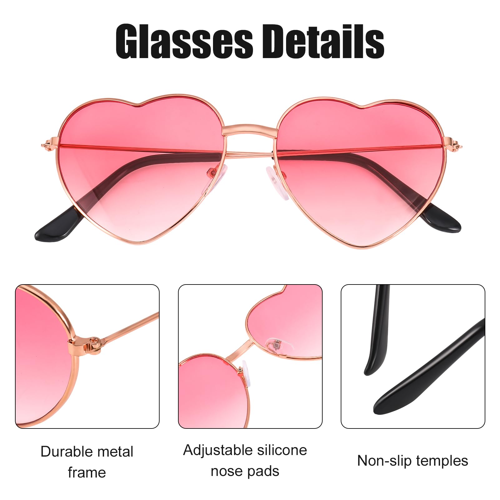 Diese mit Liebe entworfenen Herz-Sonnenbrillen sind modisch und trendig, aus hochwertigen Materialien gefertigt, langlebig, UV-beständig, angenehm zu tragen, leicht und tragbar, in einer Vielzahl von Farben erhältlich, was sie zu einer idealen Geschenkauswahl mit garantierter Kundenzufriedenheit macht . Sie eignen sich für jeden Anlass und können Ihrem Look einen Hauch von Niedlichkeit und Verspieltheit verleihen.
