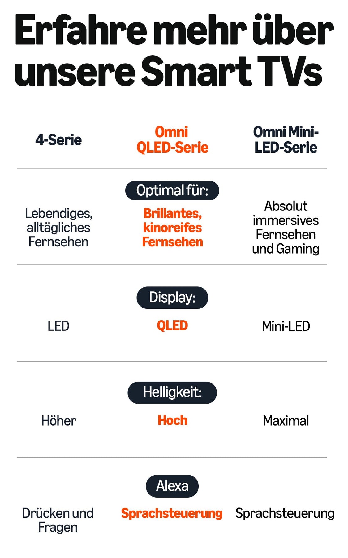 • In jeder Hinsicht brillant – Ein 4K-QLED-Display kombiniert ein beeindruckendes Bild, smarte Funktionen und schnelle Leistung, sodass du das beste aus deinem Fernseher herausholen kannst.