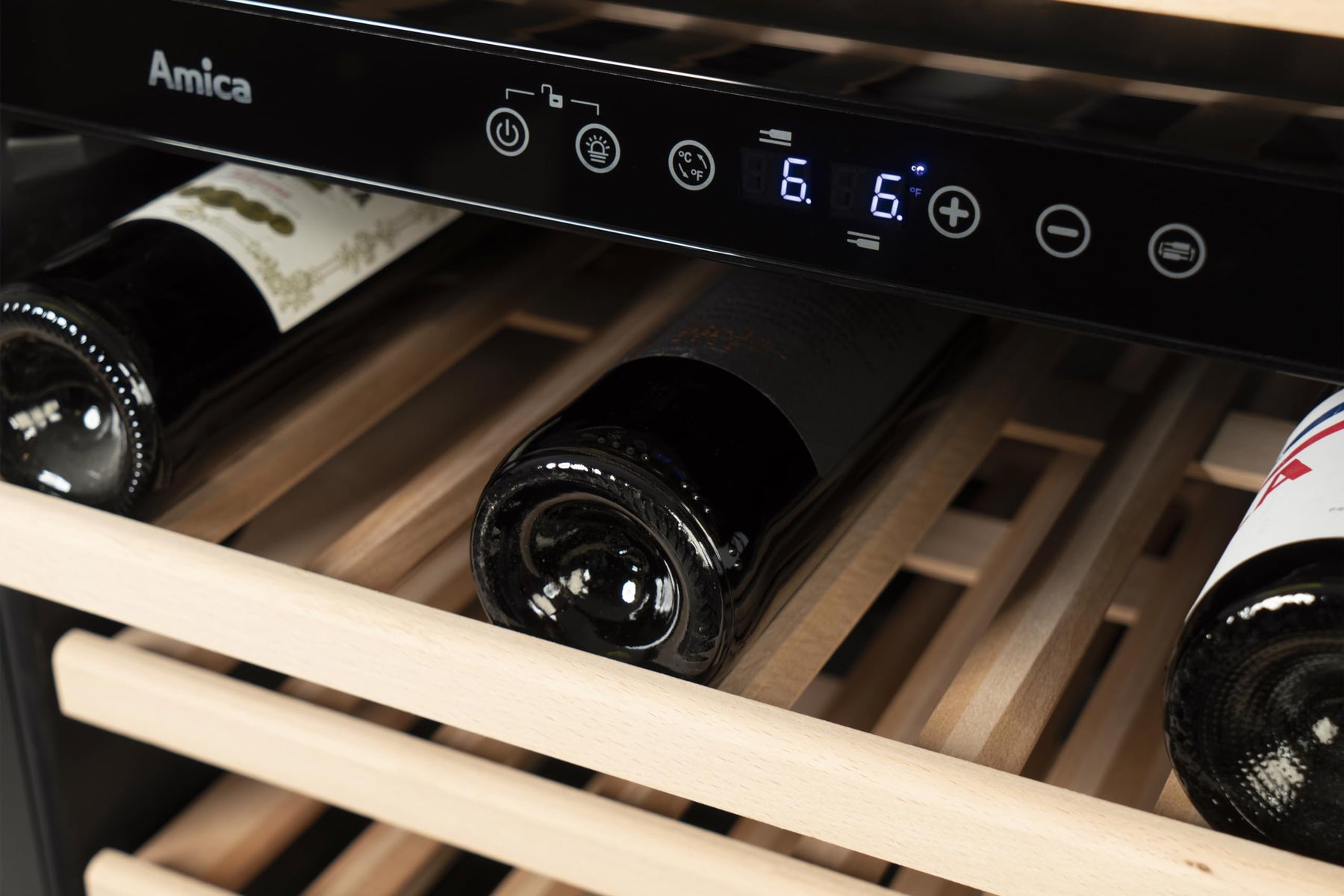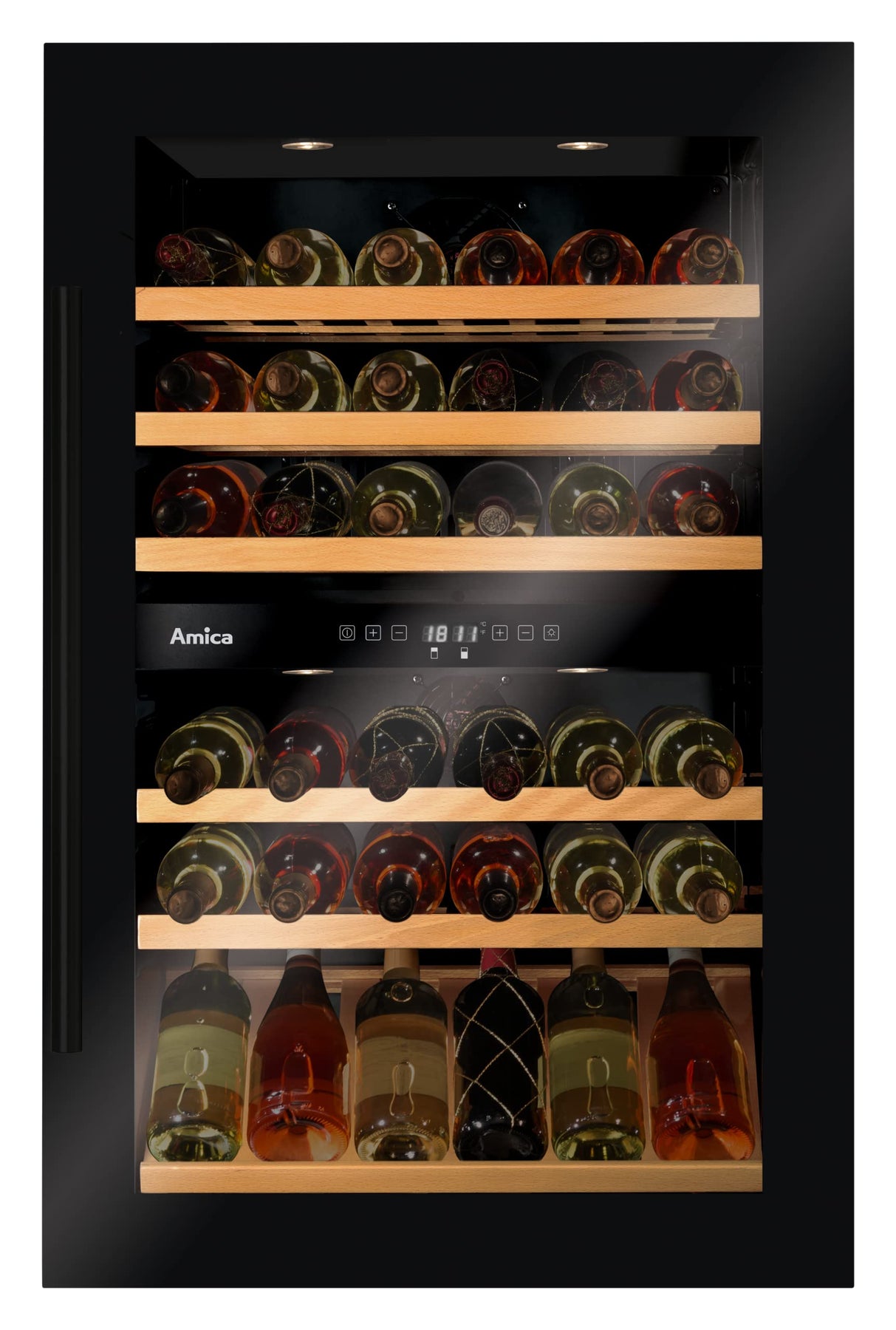 Amica WK 341 220 S Einbau-Weintemperierschrank/schwarz / 88,4 cm (H) x 59,0 cm (B) x 60,8 cm (T) / 134 l Nutzinhalt/Elektronische Steuerung / 2 Temperierzonen/Ventilator/LED-Beleuchtung