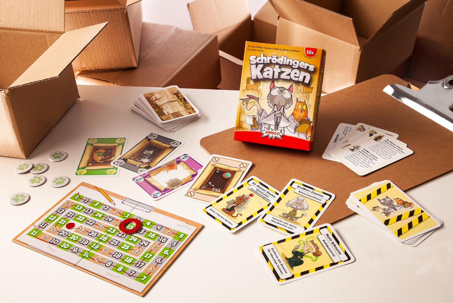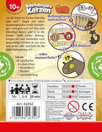 Was steckt in diesem Karton? Eine lebendige oder eine tote Katze? Eine Frage, die sich schon Quantenphysiker Erwin Schrödinger in seinem berühmten Gedankenexperiment stellte – und jetzt auch ihr! Denn in Schrödingers Katzen stellt ihr über mehrere Runden hinweg waghalsige Behauptungen darüber auf, was – und vor allem wie viel davon – sich in den Kartons auf euren Handkarten verbirgt. Dabei überbietet ihr euch gegenseitig. Zu blöd nur, dass du lediglich deine eigenen Karten kennst. Da heißt es: clever abschätzen – oder bluffen, was das Zeug hält. Doch treibe es nicht zu weit! Denn wirst du angezweifelt, deckt ihr alle Karten auf und deine Behauptung wird überprüft. Dann liegst du besser richtig, sonst bist du aus dem Spiel! Wer von euch wird es schaffen und sich gegen alle anderen behaupten? Ein flottes Bluff- und Schätz-Kartenspiel mit originellem Thema!