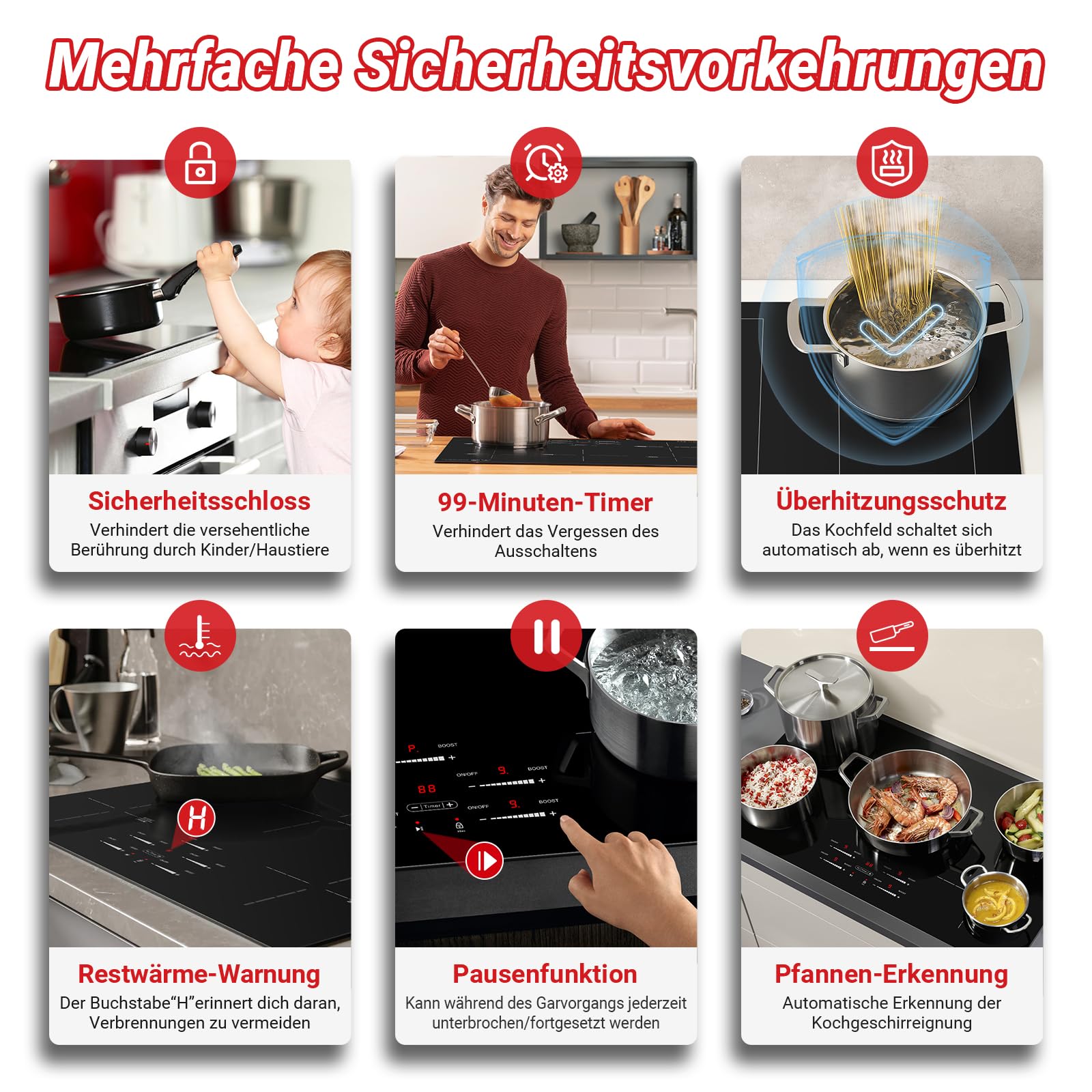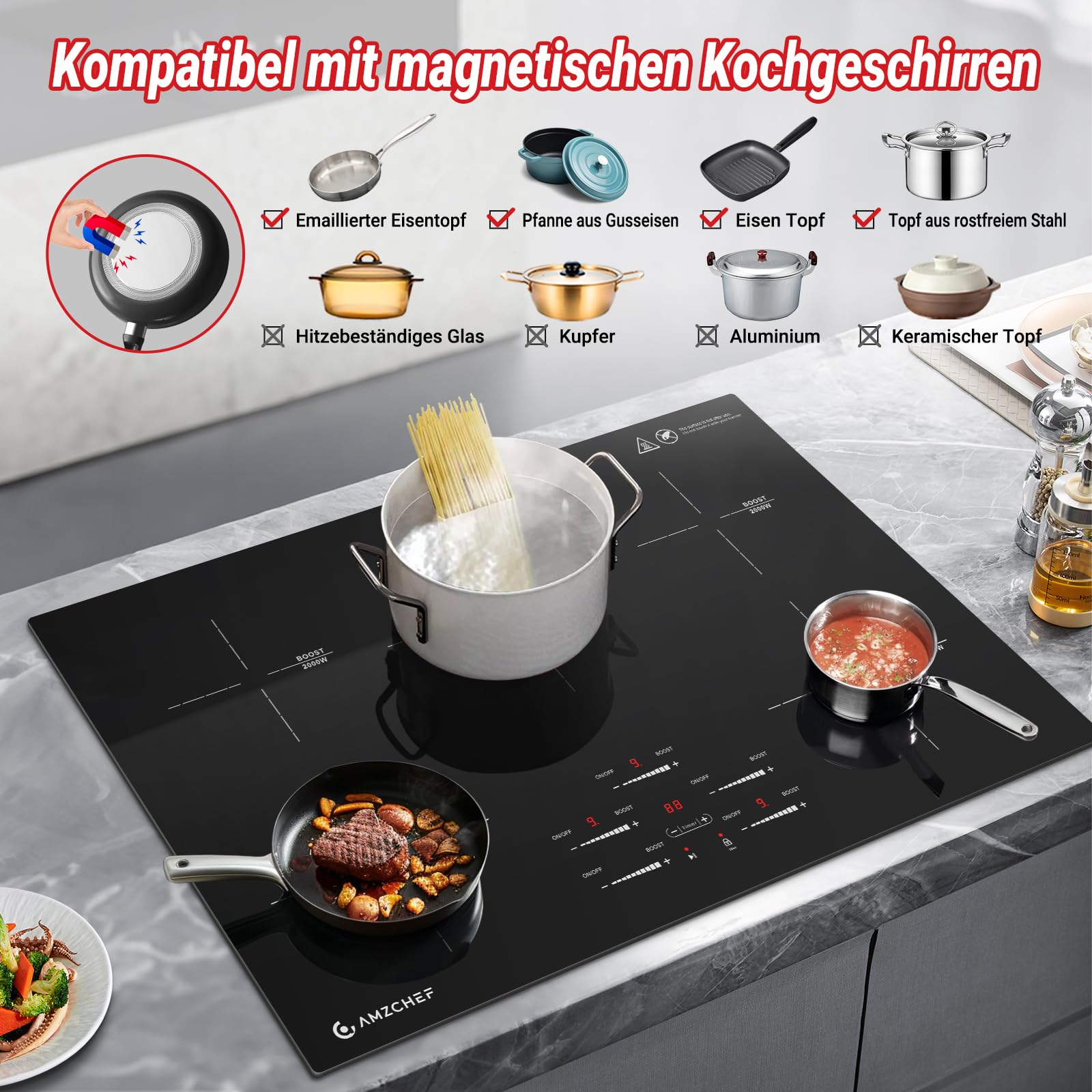 - 【Kompatibilität & Sicherheit】Dieses 77cm induktionskochfeld ist nur für Töpfe und Pfannen mit magnetischen Böden geeignet, wie Eisen, Gusseisen, emailliertes Eisen oder Edelstahl. Dieses Induktionskochfeld bietet maximale Sicherheit für Ihre Familie, ausgestattet mit Überhitzungsschutz, Hochspannungsschutz, automatischer Abschaltung und Sicherheitssperre, Timer und mehr.