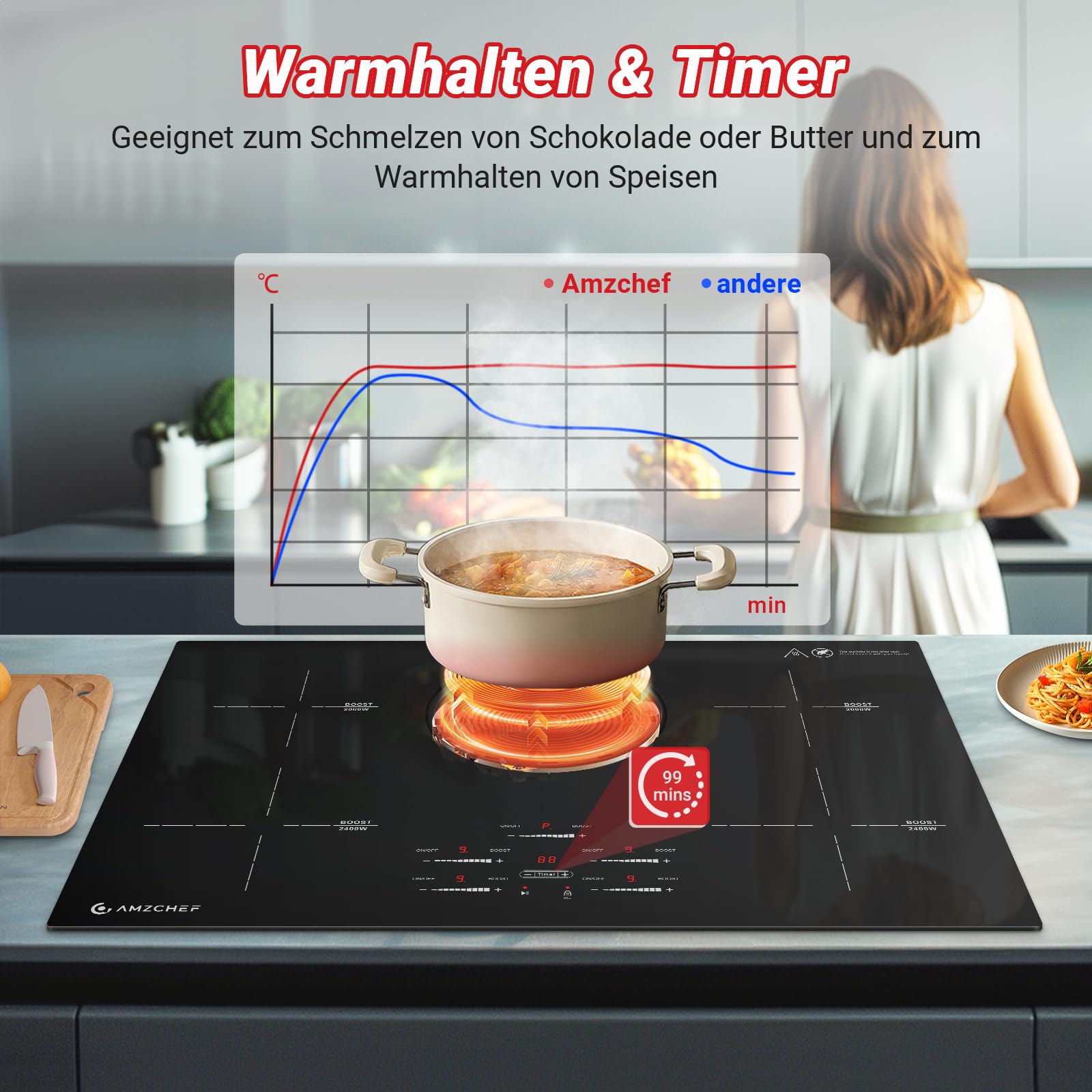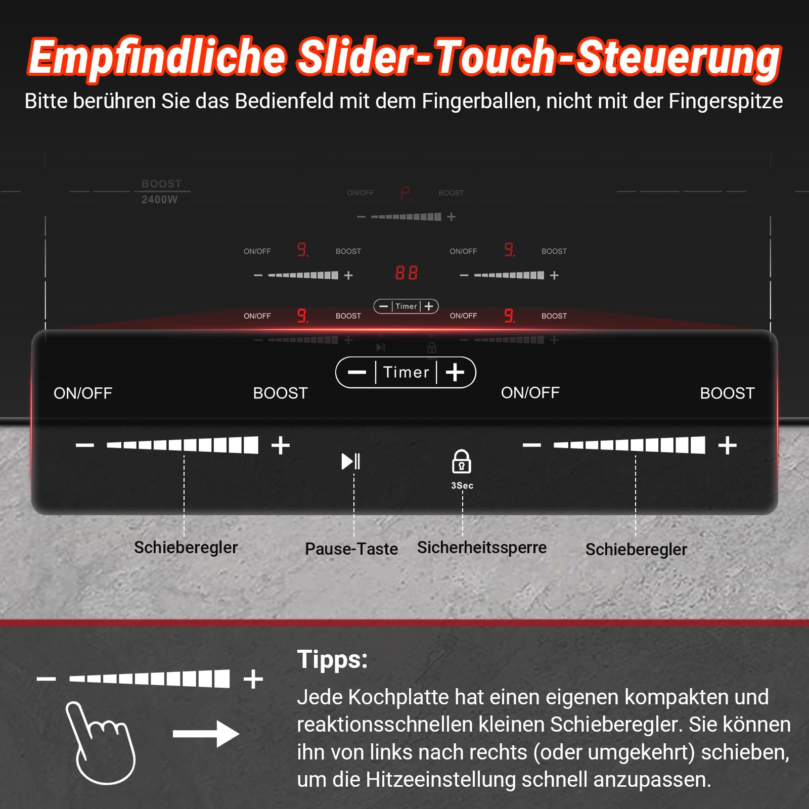 - 【Einfache Steuerung】Das unabhängige Schieberegler-Design macht die Bedienung einfach und ermöglicht fünf Kochzonen mit wirklich unabhängiger Steuerung, ohne sich gegenseitig zu stören. Mit der Warmhalte- und Stop+Start-Funktion können Sie köstliche Speisen mit flexibler Kochkontrolle genießen.