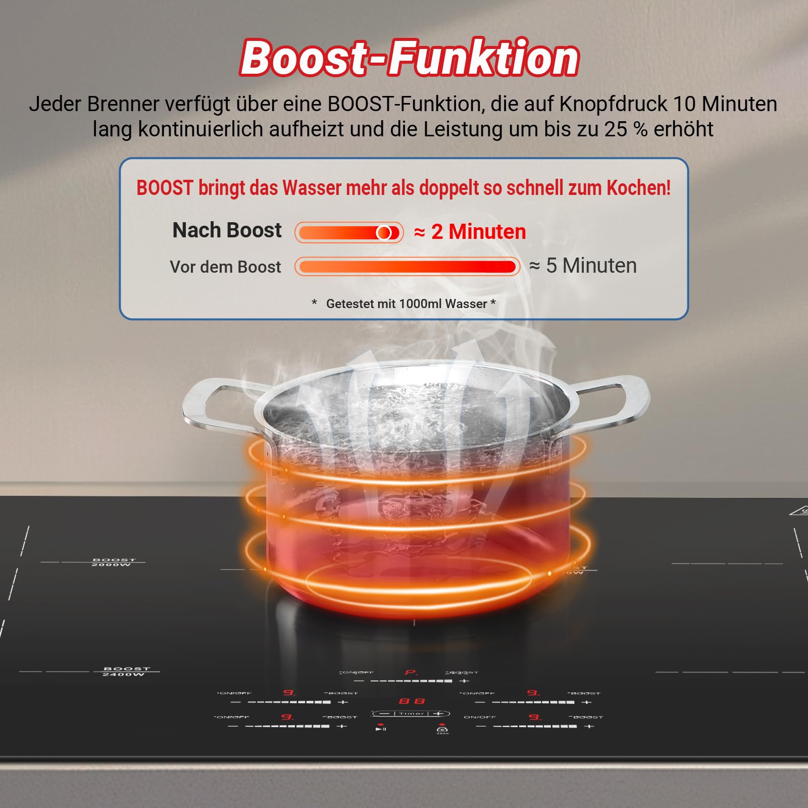 - 【Boost-Funktion und 9 Leistungsstufen】 Im "Boost"-Modus können Sie Wasser in 1 Minute zum Kochen bringen und die Feuchtigkeit und Nährstoffe der Zutaten während des Erhitzungsprozesses bewahren. Dieses einbau induktionskochfeld verfügt über 9 Leistungsstufen, um Ihren verschiedenen Kochbedürfnissen gerecht zu werden, wie z. B. Dämpfen, Kochen, Braten und Pfannenrühren.