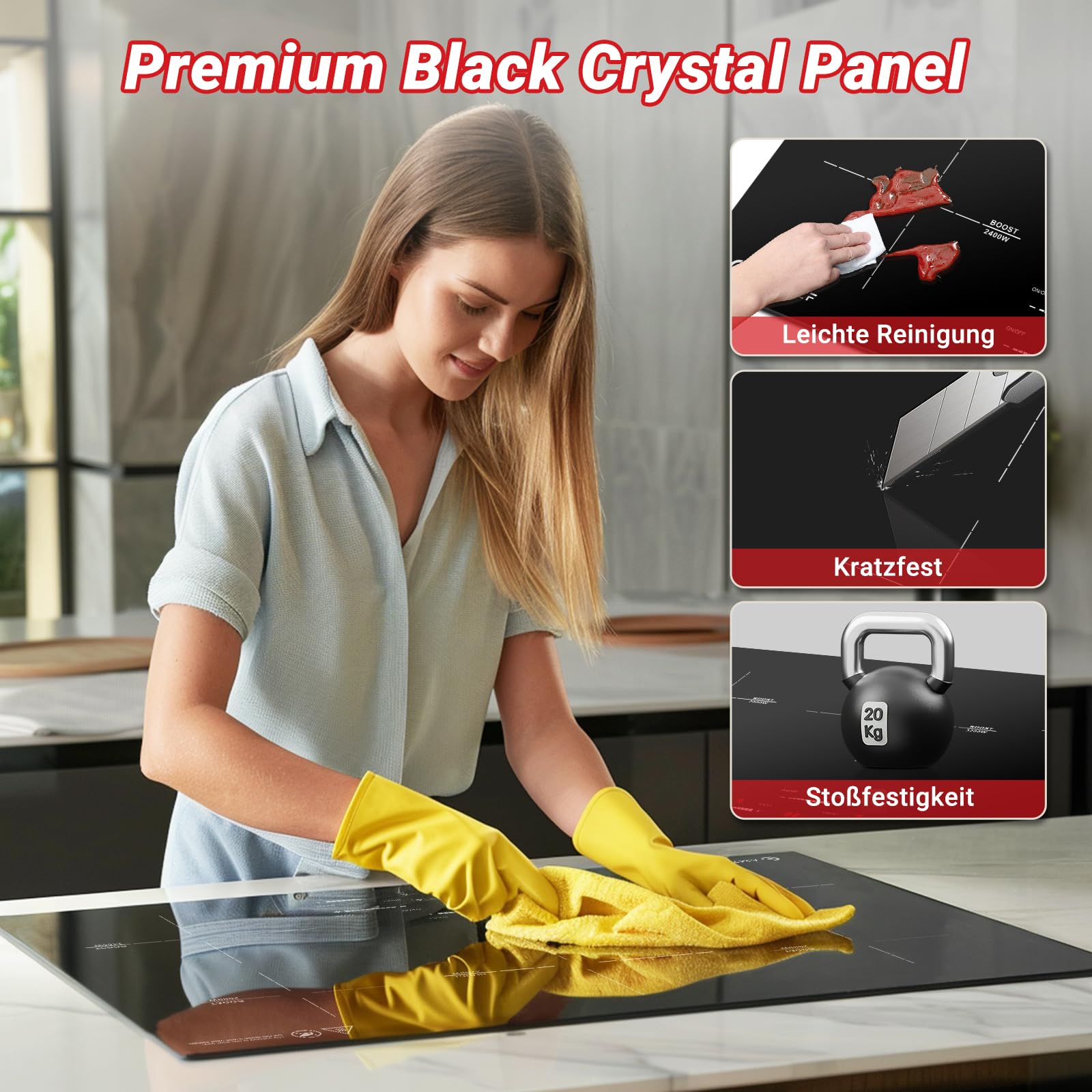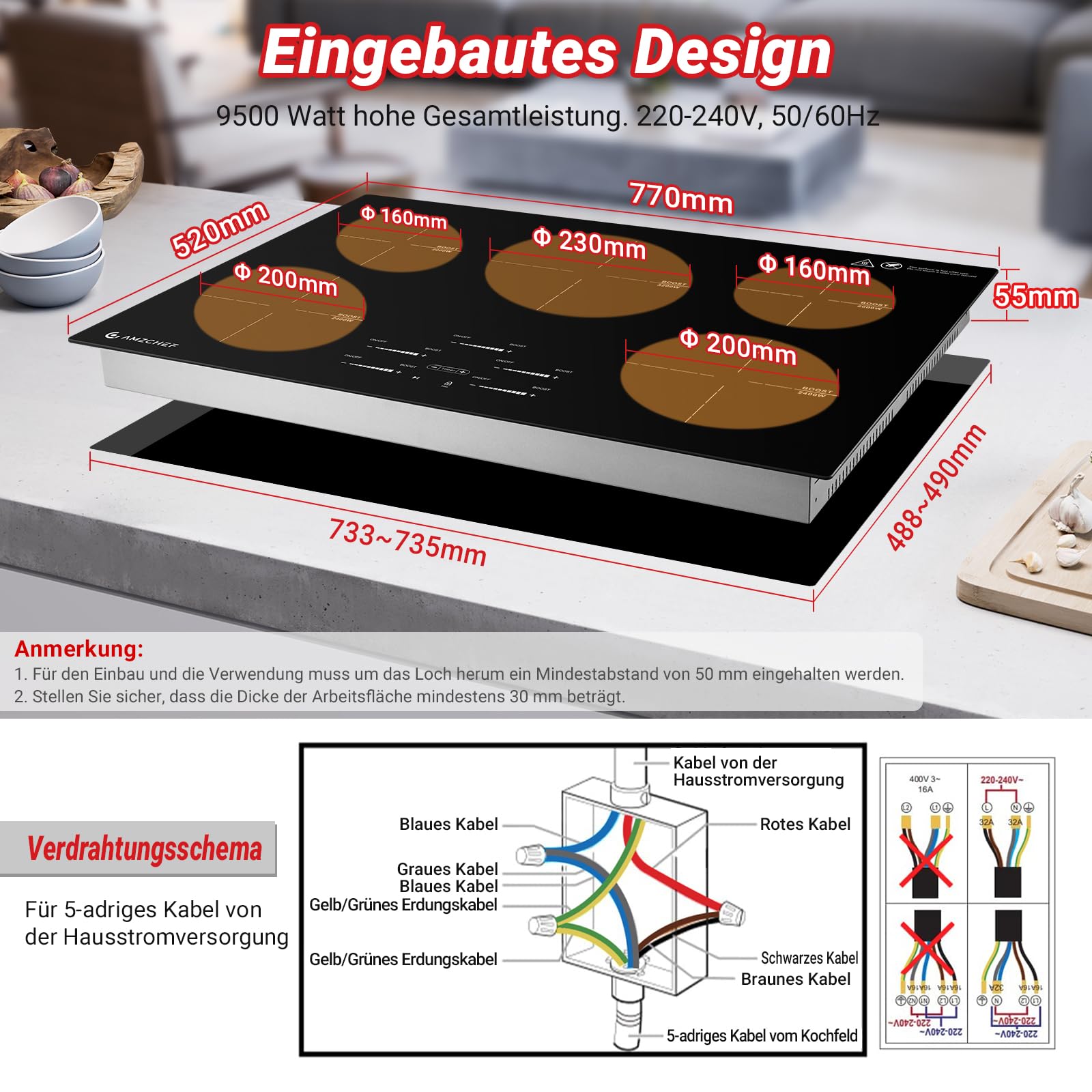 - 【Material & Größenbeschreibung】Produktgröße: 77 x 52 x 5,5 cm, Öffnungsgröße: (733~735) x (488~490) mm. Dieser amzchef induktionsherd ist aus poliertem schwarzem Kristallplattenmaterial hergestellt, hochtemperaturbeständig, verschleißfest und leicht zu reinigen. **Warme Tipps: dieses Produkt enthält keinen Stecker, müssen Sie die Verdrahtung zu betreiben.